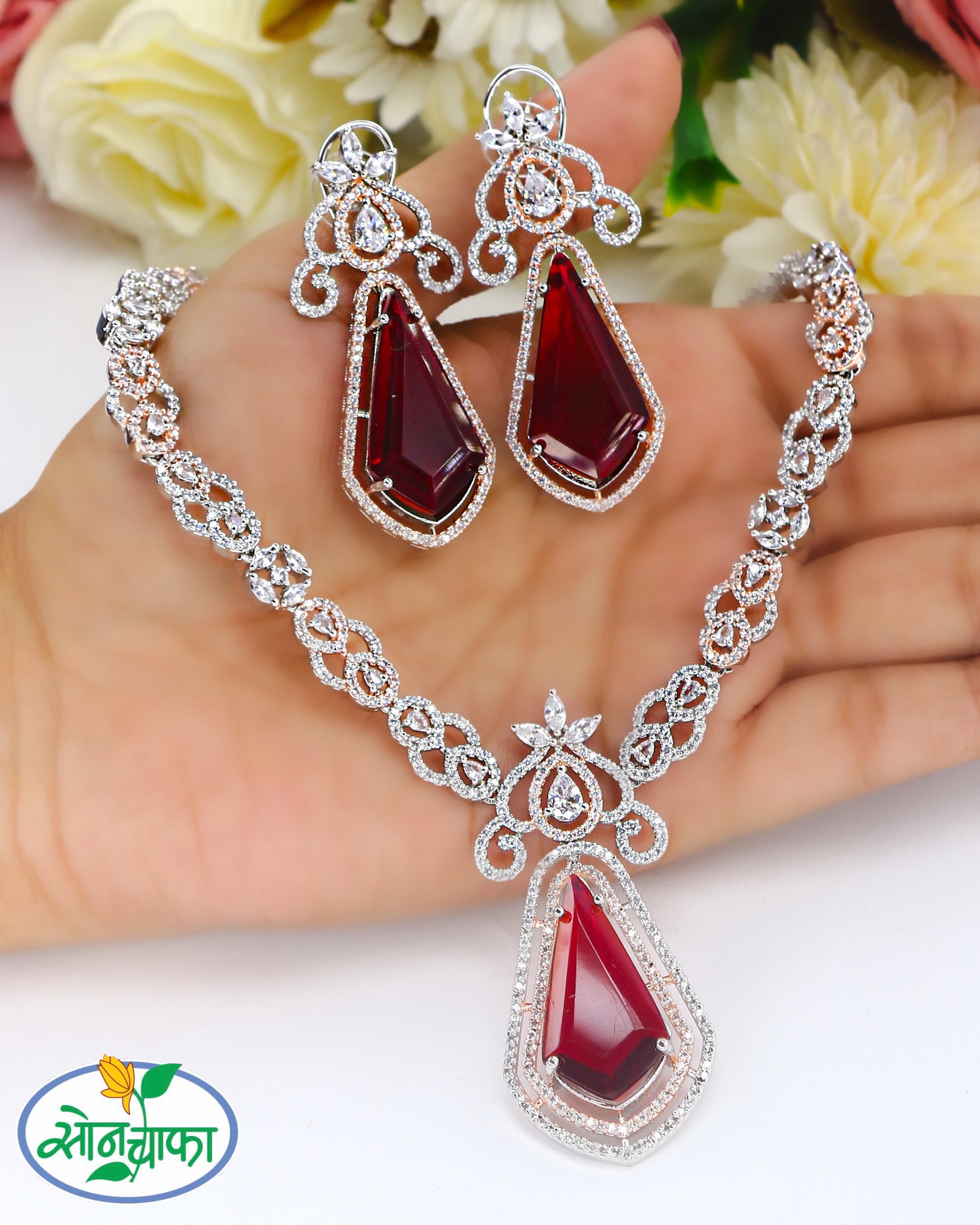 Style yourself by choosing this adorable necklace set from Sonchafa jewellers. It is encrusted with splendid precious dia stones and made from golden finish metal. It will definitely intensify your look.