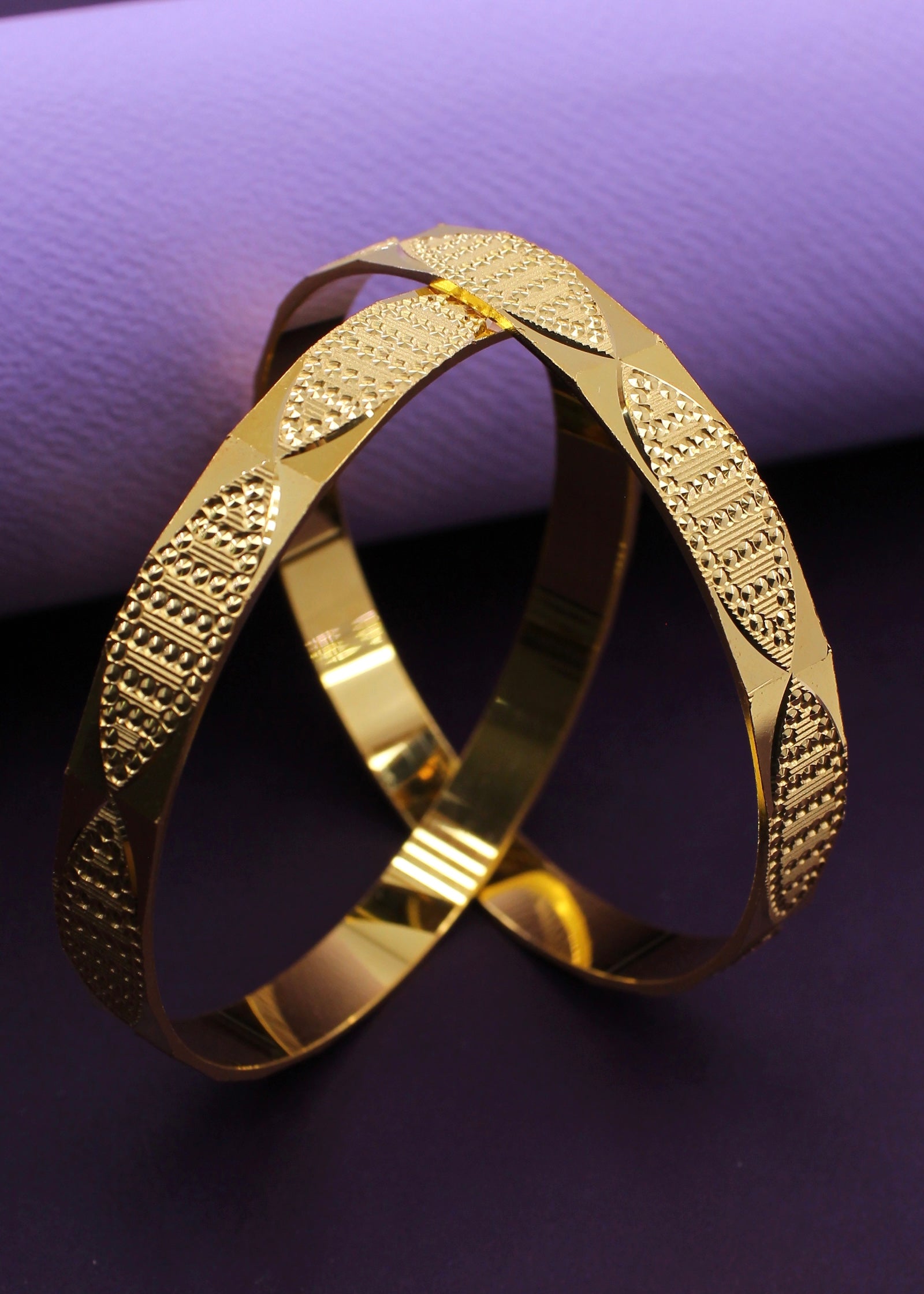 Add an ethnic twist to your persona by clubbing this attractive designer bangles with your festive apparel. These bangles are made from 1 gram gold plated metal. It has beautiful carving design on golden metal surface. These bangles are easy to wear and superior in quality.