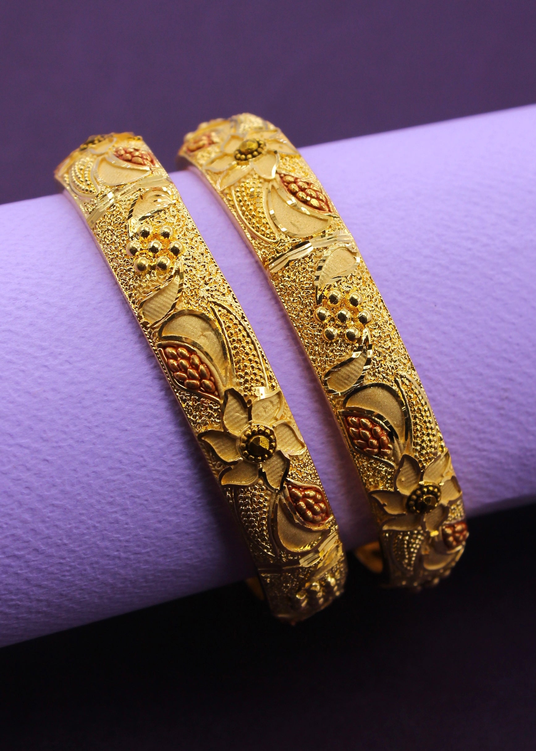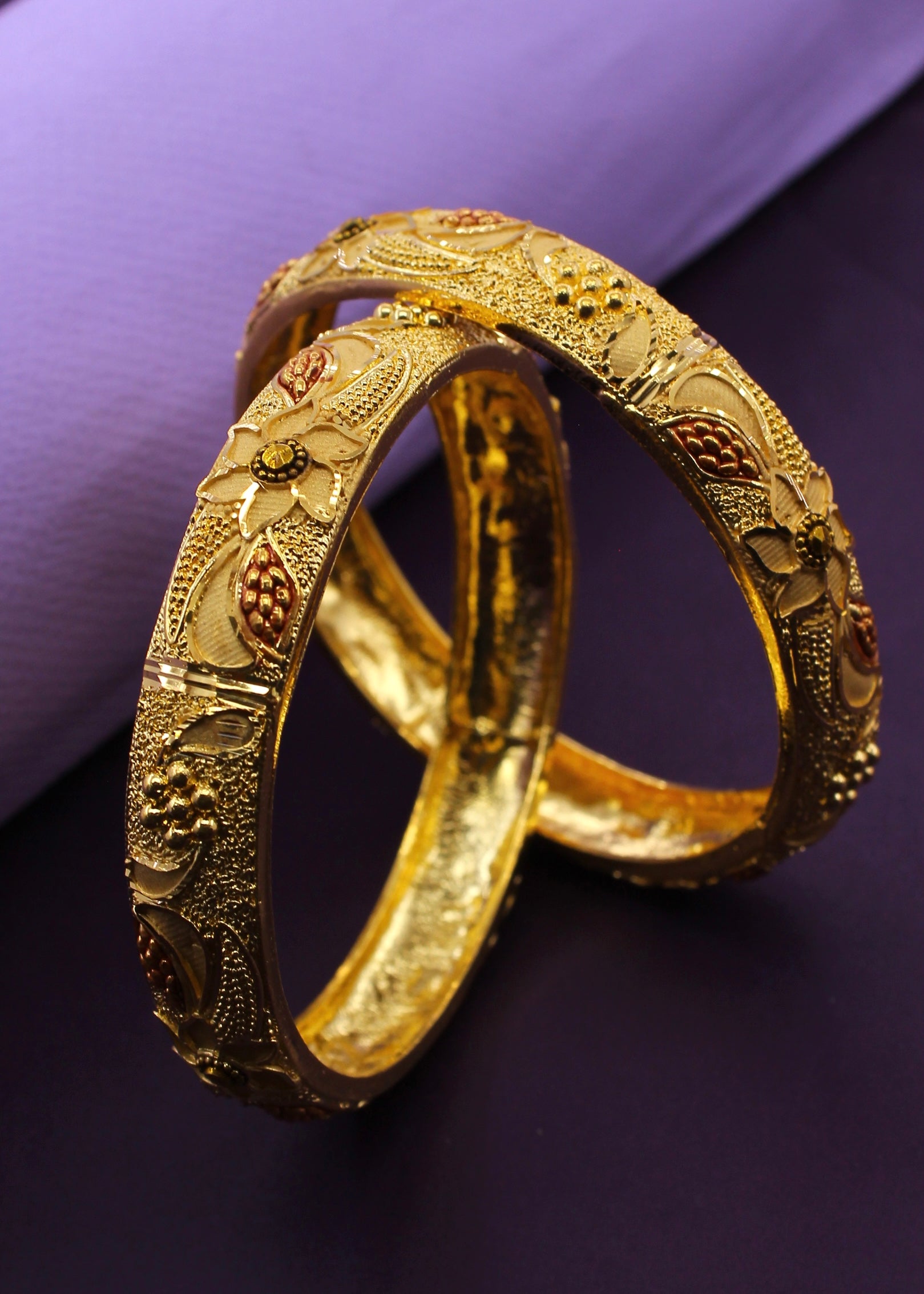 Glam up your festive look by clubbing this pair of floweret designer bangles with your traditional costume. These are wonderfully embedded with flawless minakari work on golden metal surface and made from 1 gram gold plated metal. These designer bangles are good in quality and skin-friendly as well.