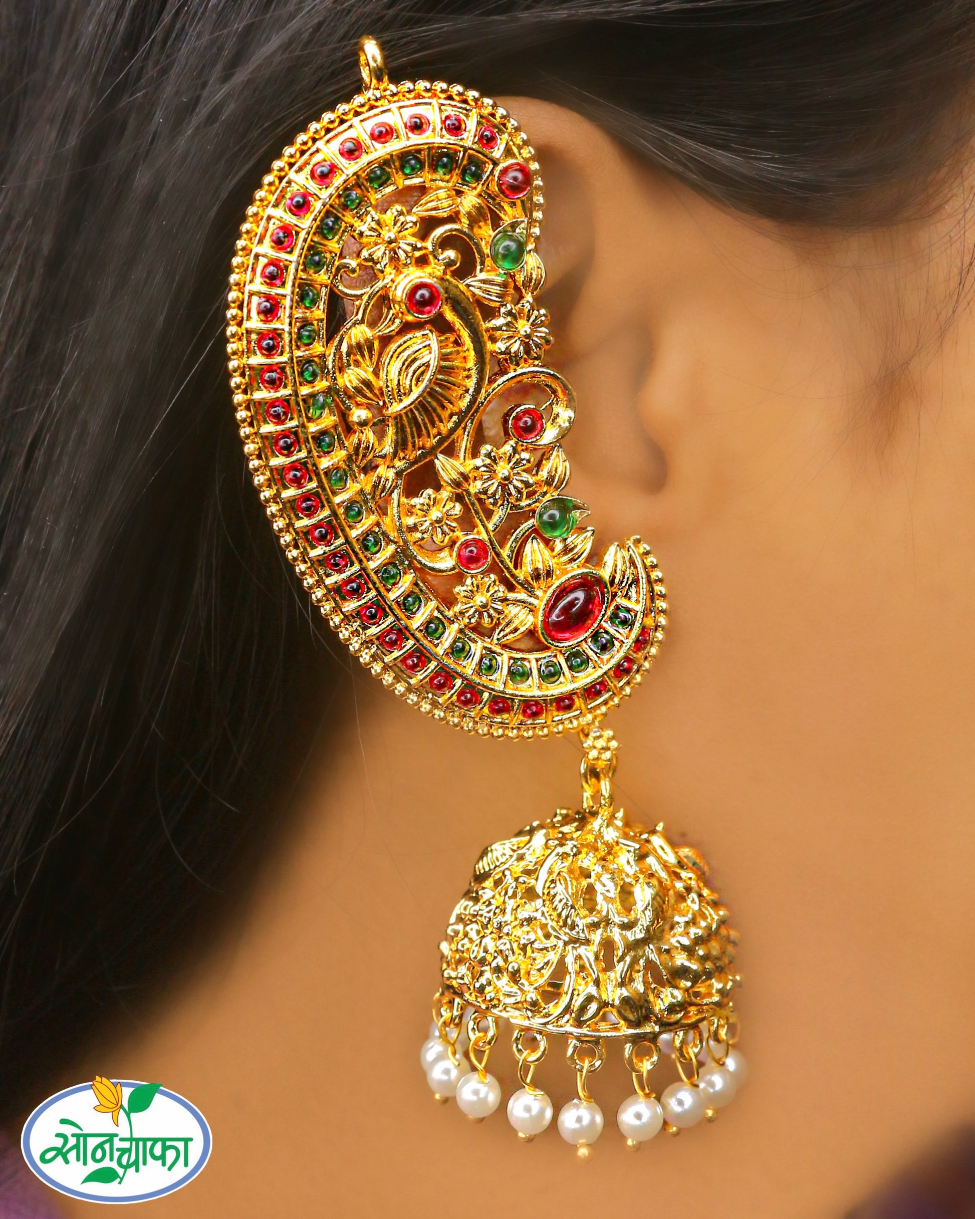 Complement your traditional attire by clubbing this pair of attractive peacock with floral design ear-cuffs and get that distinct look. These are encrusted with sparkling pink, green stone and made from antique golden finish metal. It is decorated with dangling pearl beads. It is long lasting and highly durable.