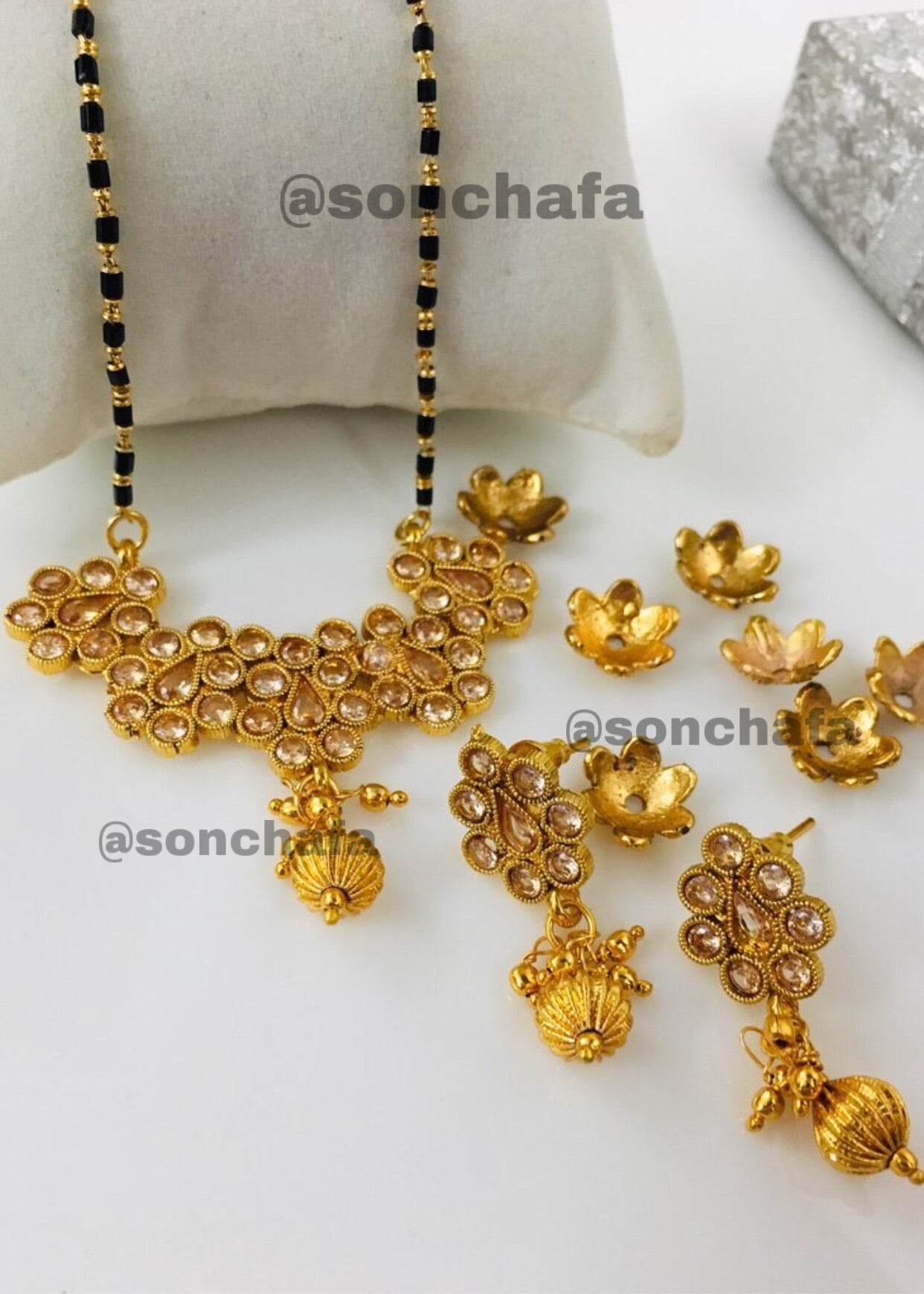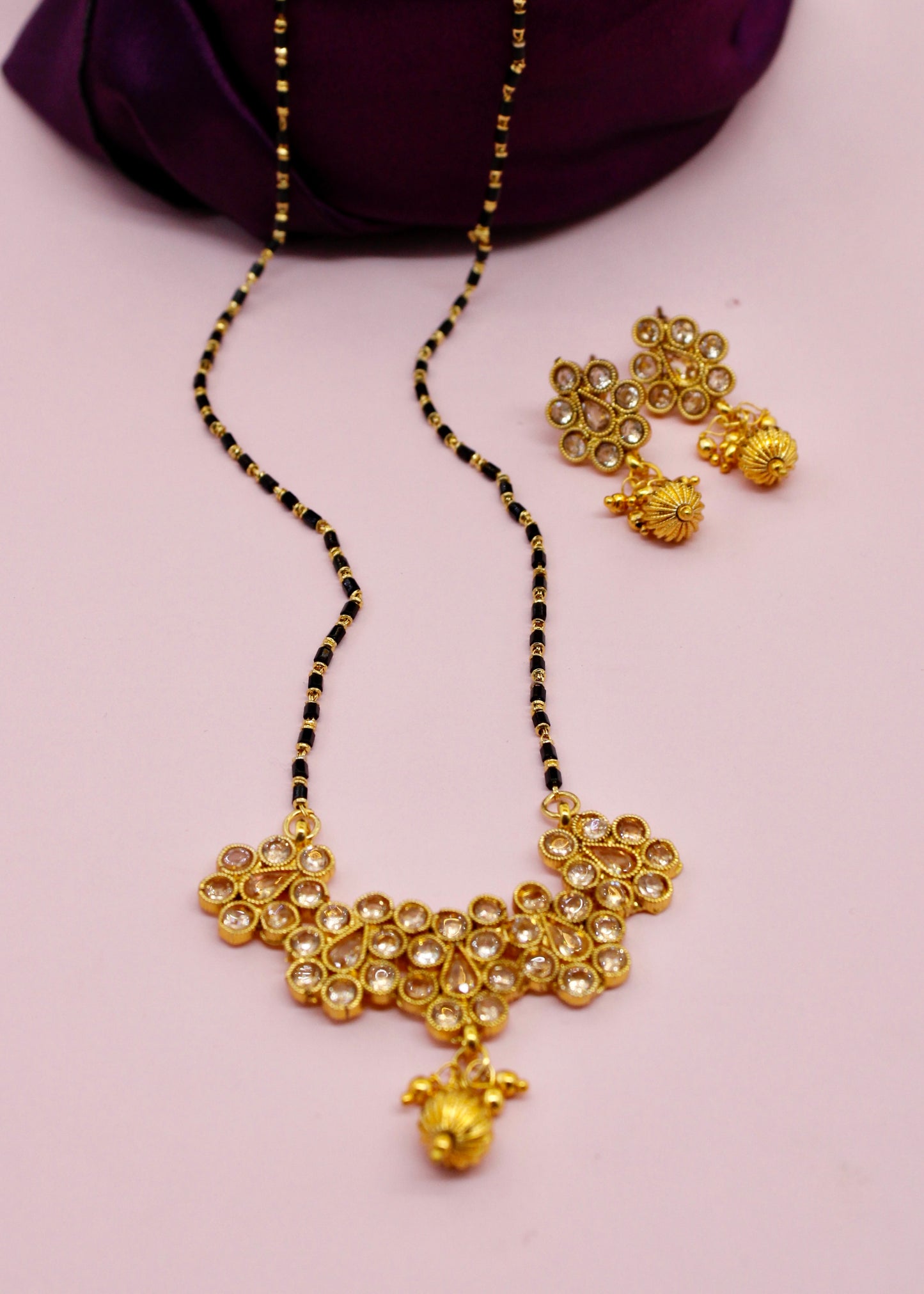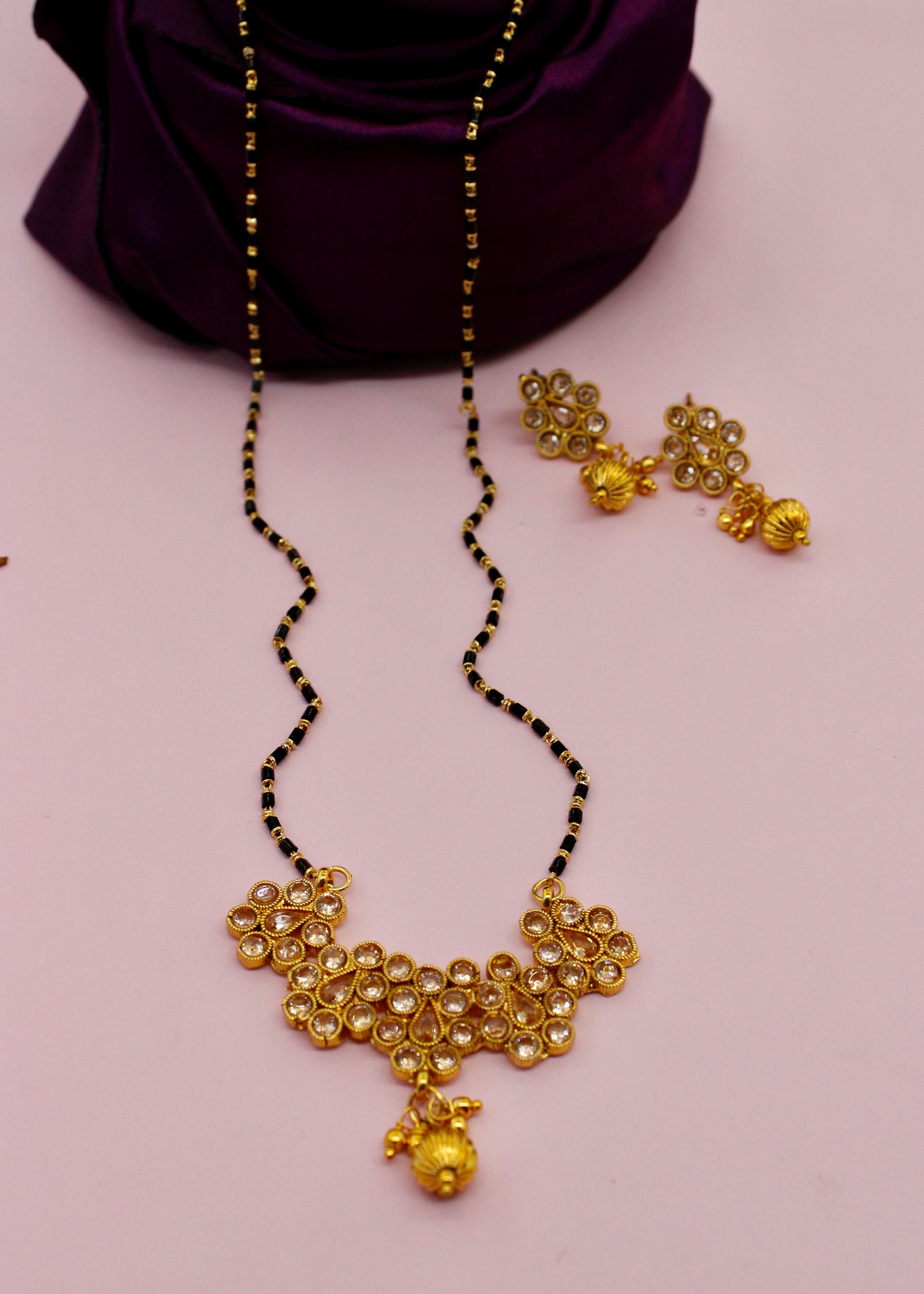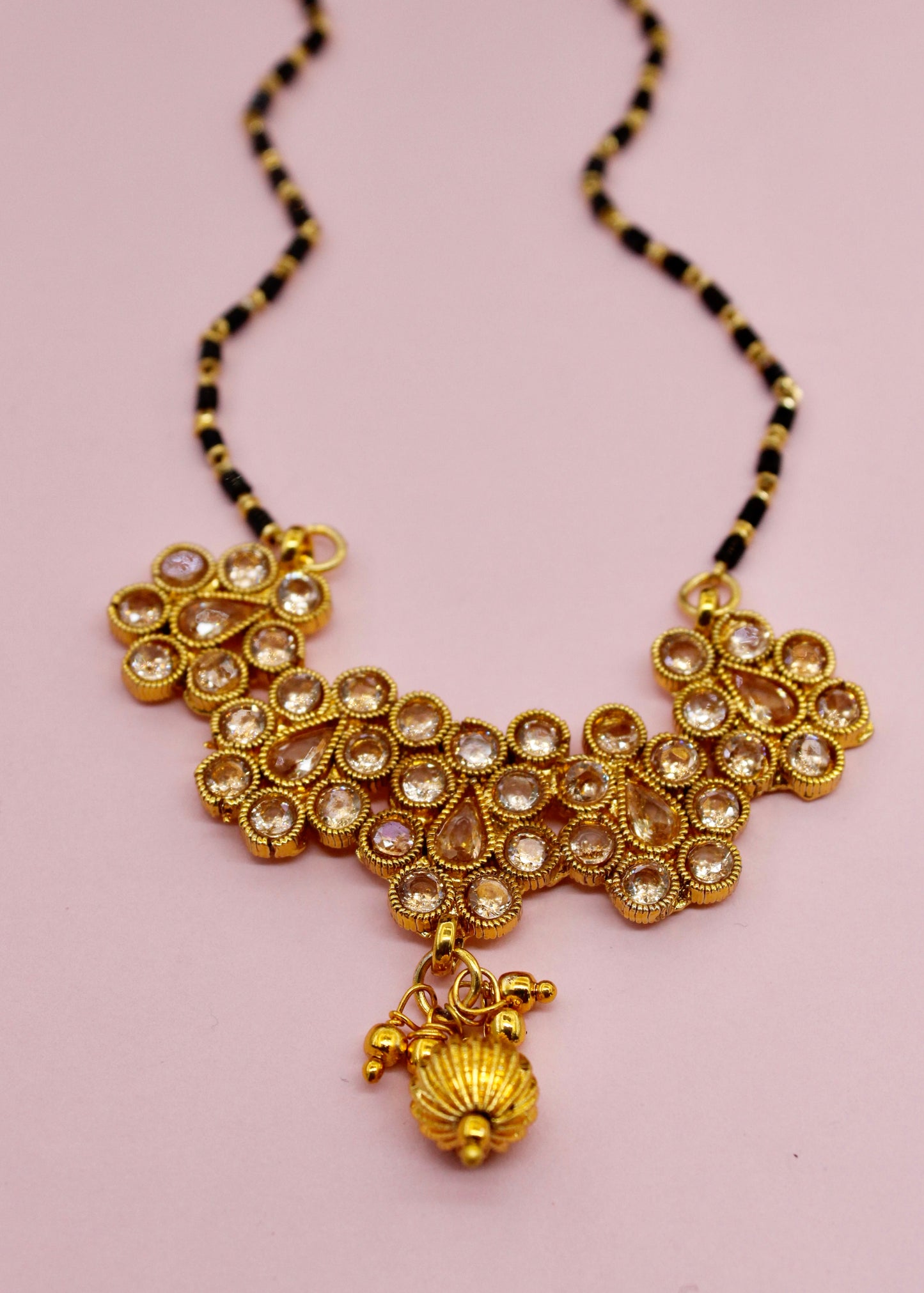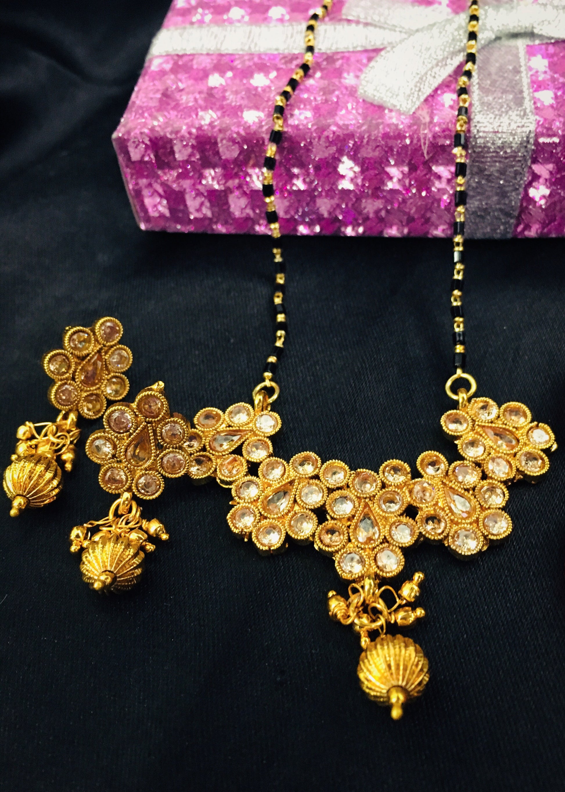 Sonchafa Jewellery brings to you this floral designer mangalsutra in stylish look. It is decked with precious Dia diamonds and feature wonderful carving design. In addition the golden finish chain is woven with black colour beads and made from metal. It is superior in quality and rust-resistant as well.