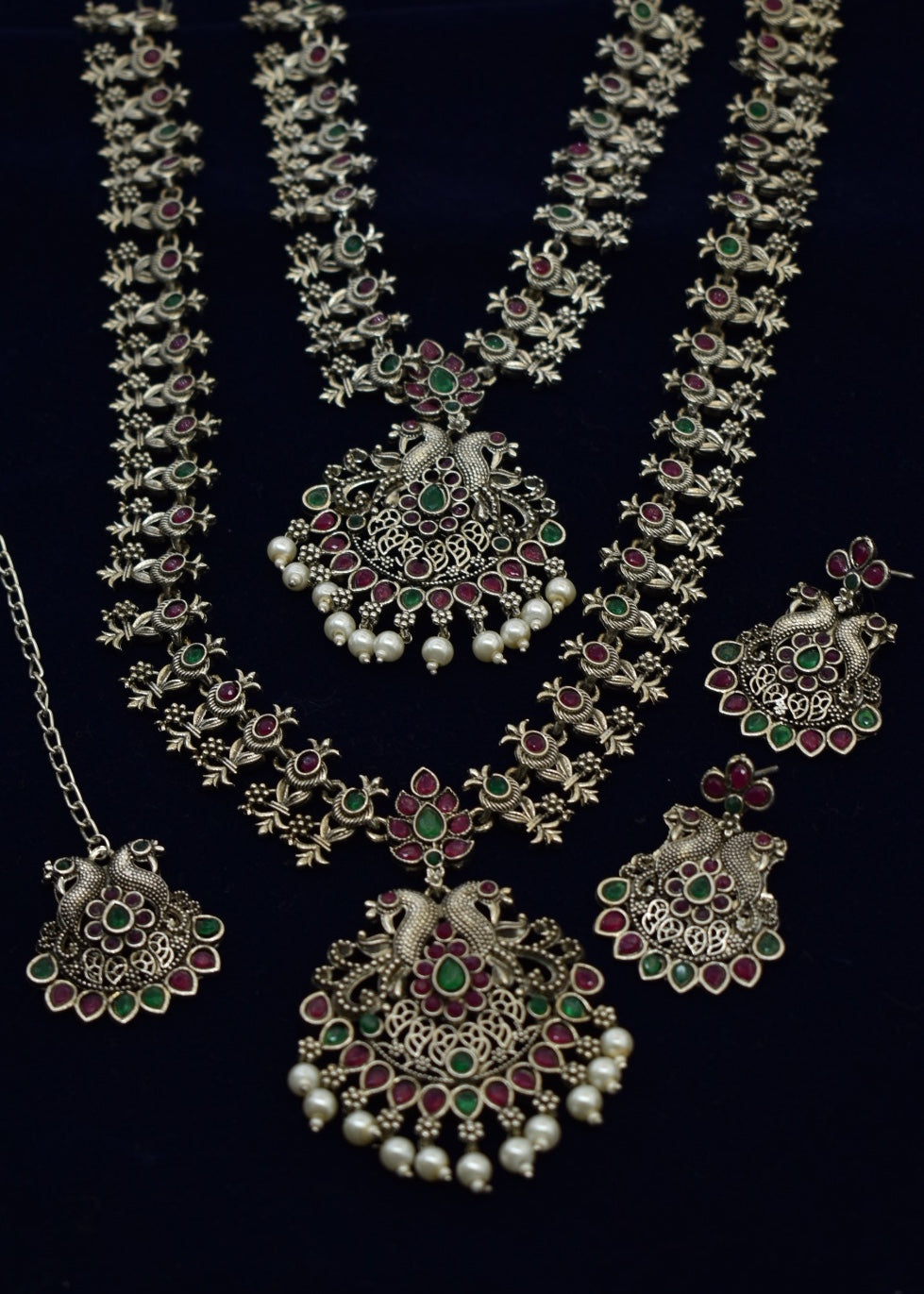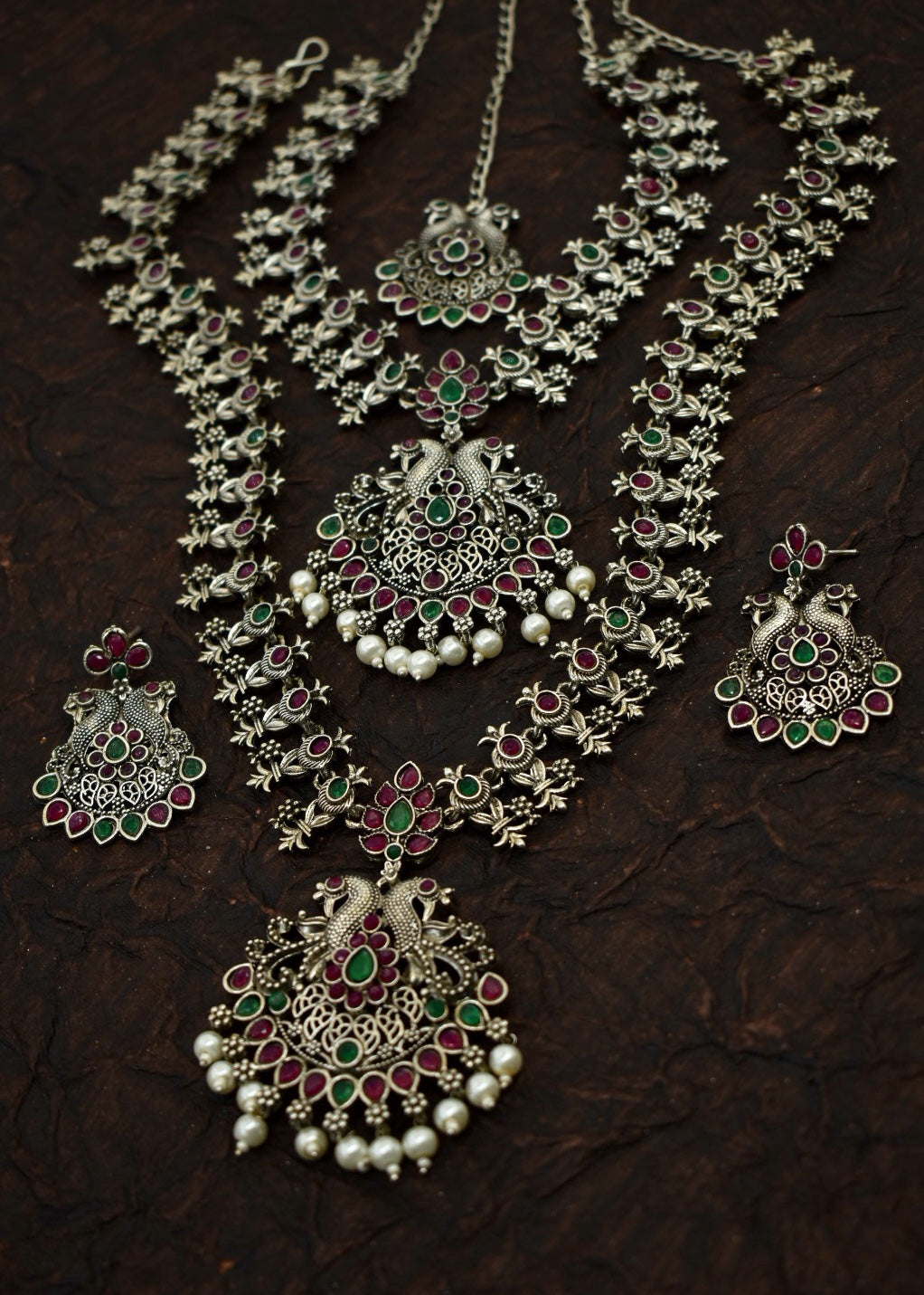 Look special on mahalaxmi combo set by adorning this classy Floarl designer Oxidised jewellery set. The ornaments are encrusted with pink, green stones along with pearl beads and made from oxidised finish metal. This combo set is superior in quality and will surely fetch you with lots of compliments from onlookers for your amazing choice.