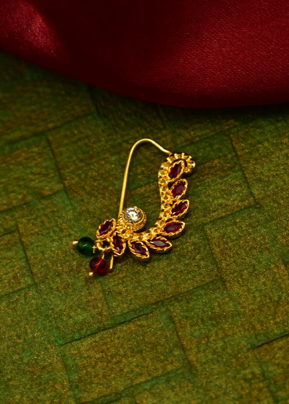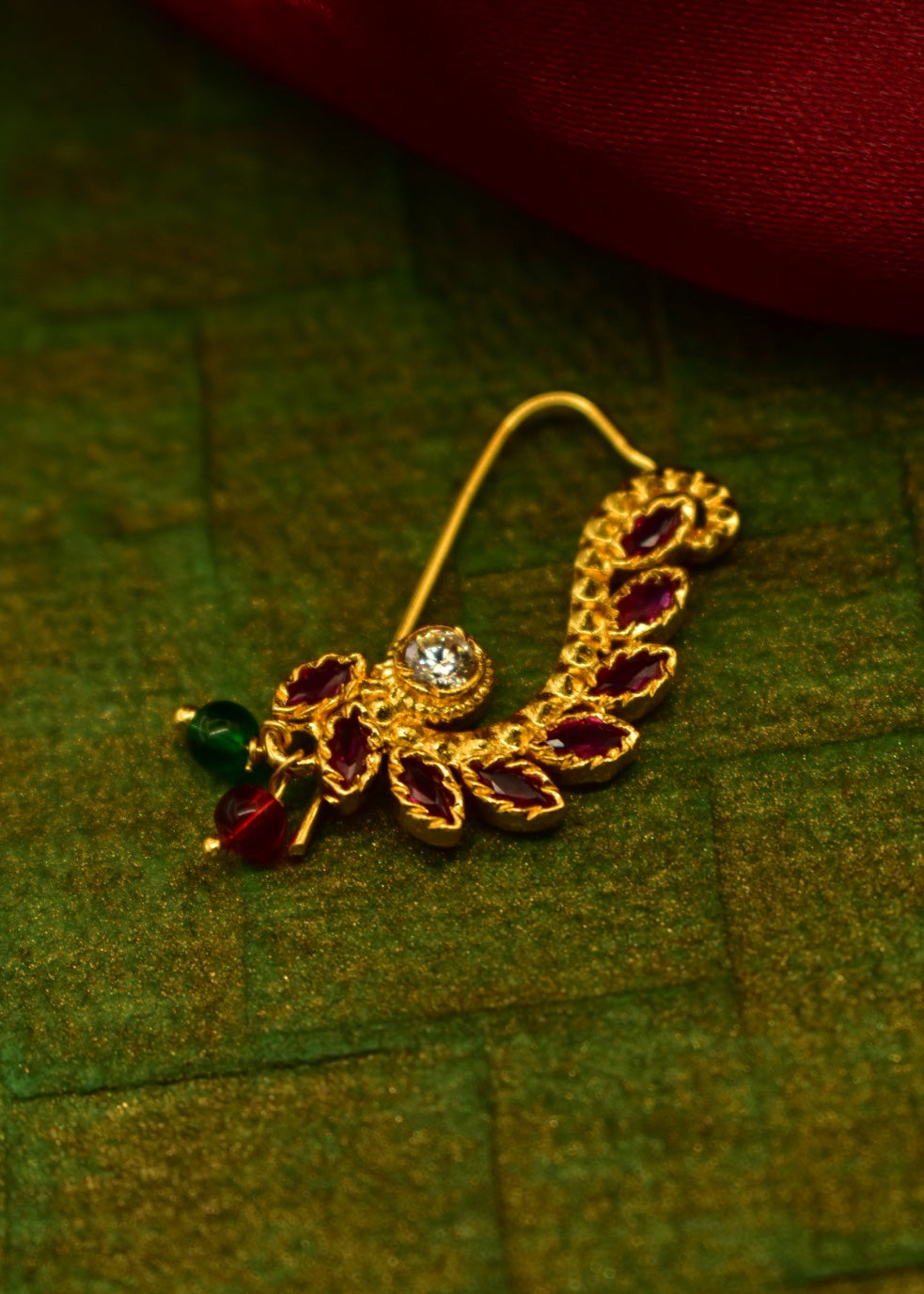 Sonchafa Jewellery offers this pink color beautiful nose-pin for you in classic look. It is studded with sparkling pink-white stone and made from metal. This nose-pin is easy to wear as it is clip-on. It is good in quality and long lasting.