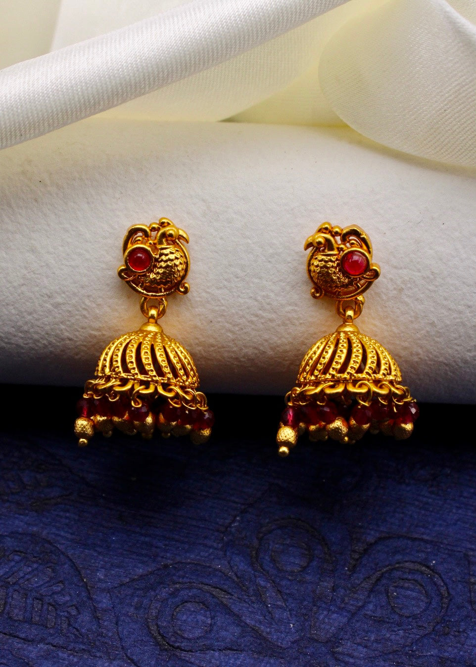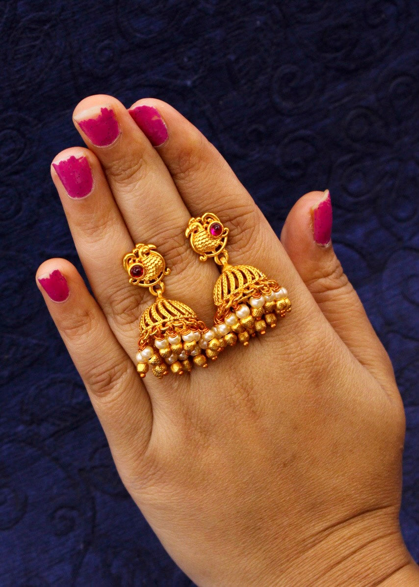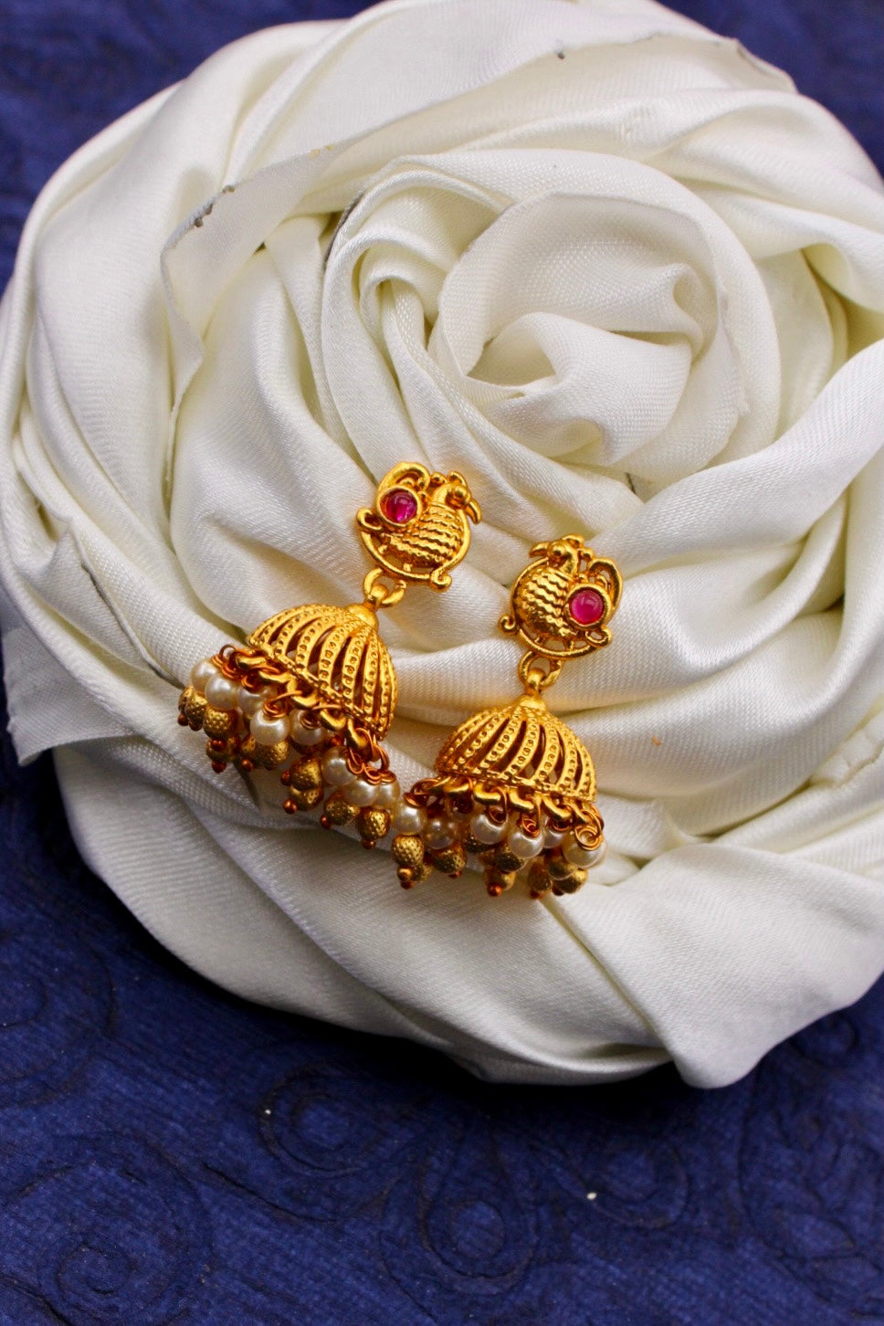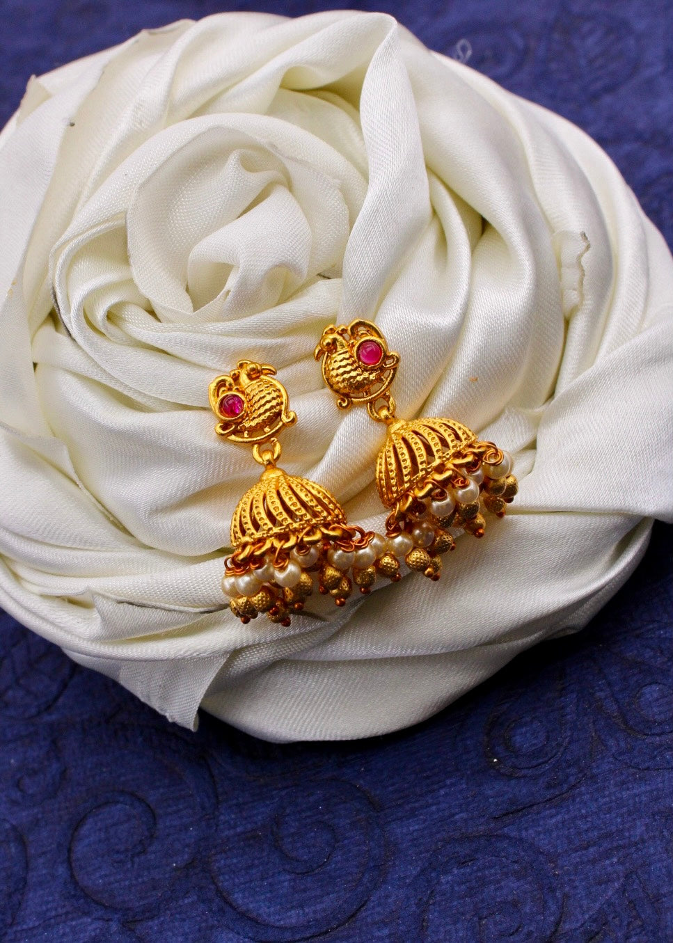 Sonchafa Jewellery brings to you this peacock design jhumki earrings. These jhumki are styled with studded pink stone along with pearl, pink, golden beads and crafted from matte gold finish metal. It is easy to wear and comfortable to hold all day long.