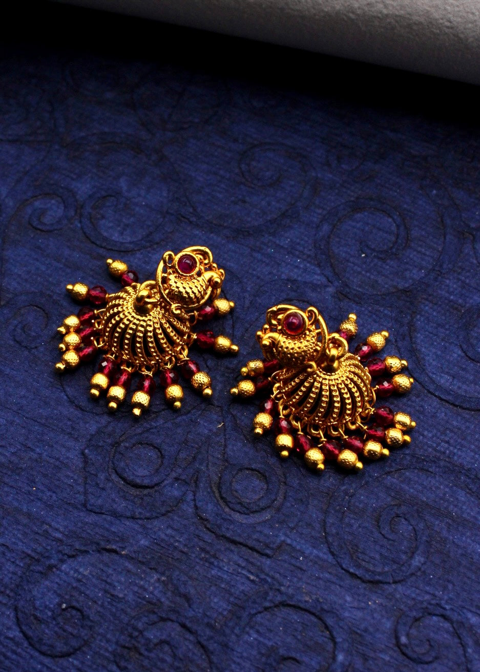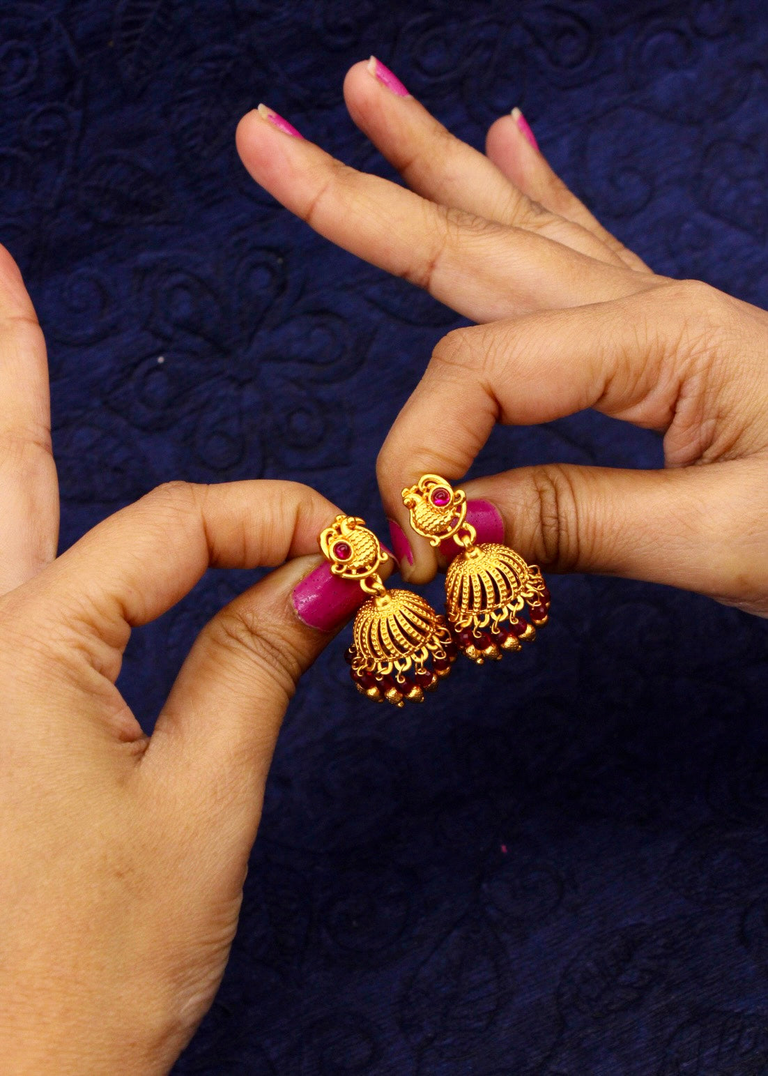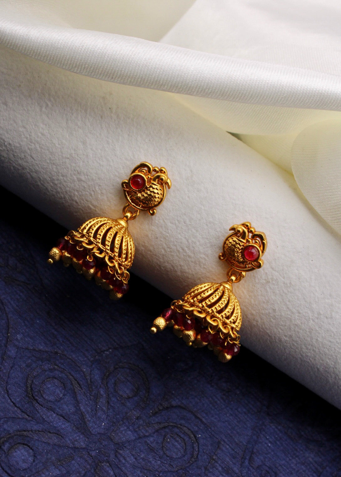 Sonchafa Jewellery brings to you this peacock design jhumki earrings. These jhumki are styled with studded pink stone along with pearl, pink, golden beads and crafted from matte gold finish metal. It is easy to wear and comfortable to hold all day long.