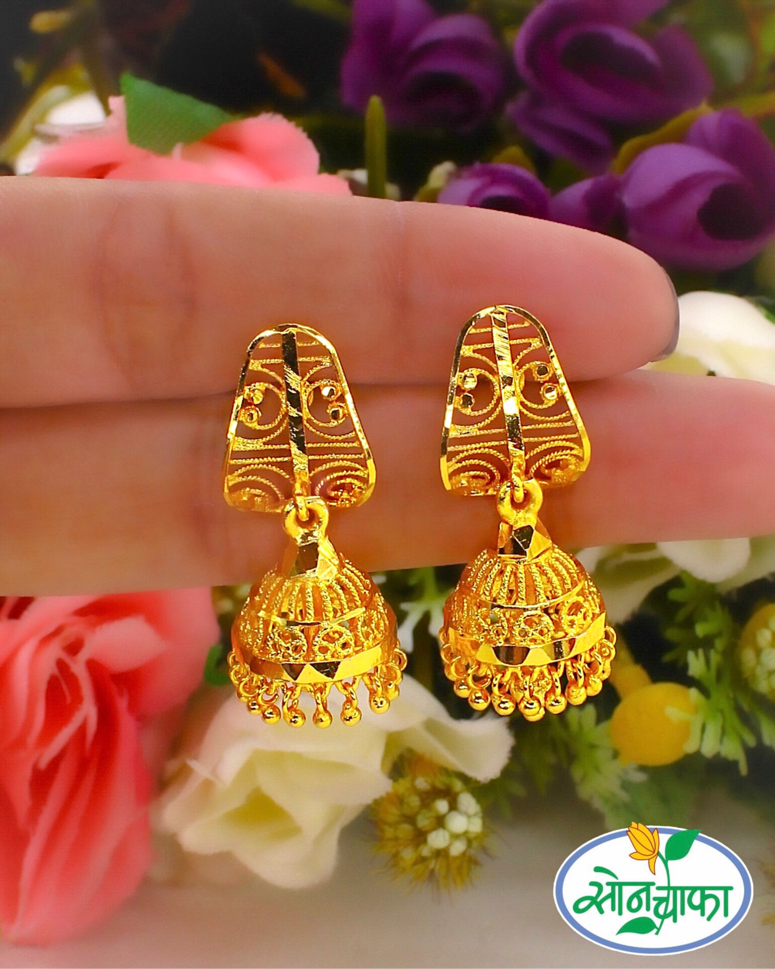 Checkout this amazing 1 gram gold plated traditional jhumki earrings from Sonchafa Jewellery. It has eye-pleasing carving design on golden metal surface. These earrings are crafted from highly durable 1 gram gold plated metal. It will surely give you attractive look.