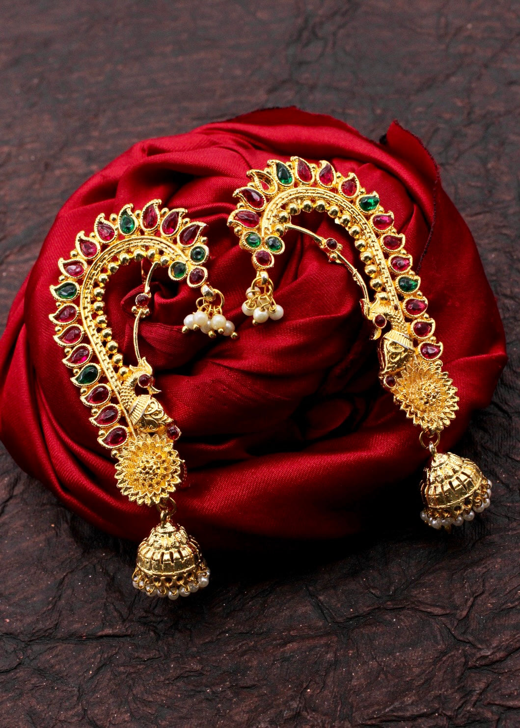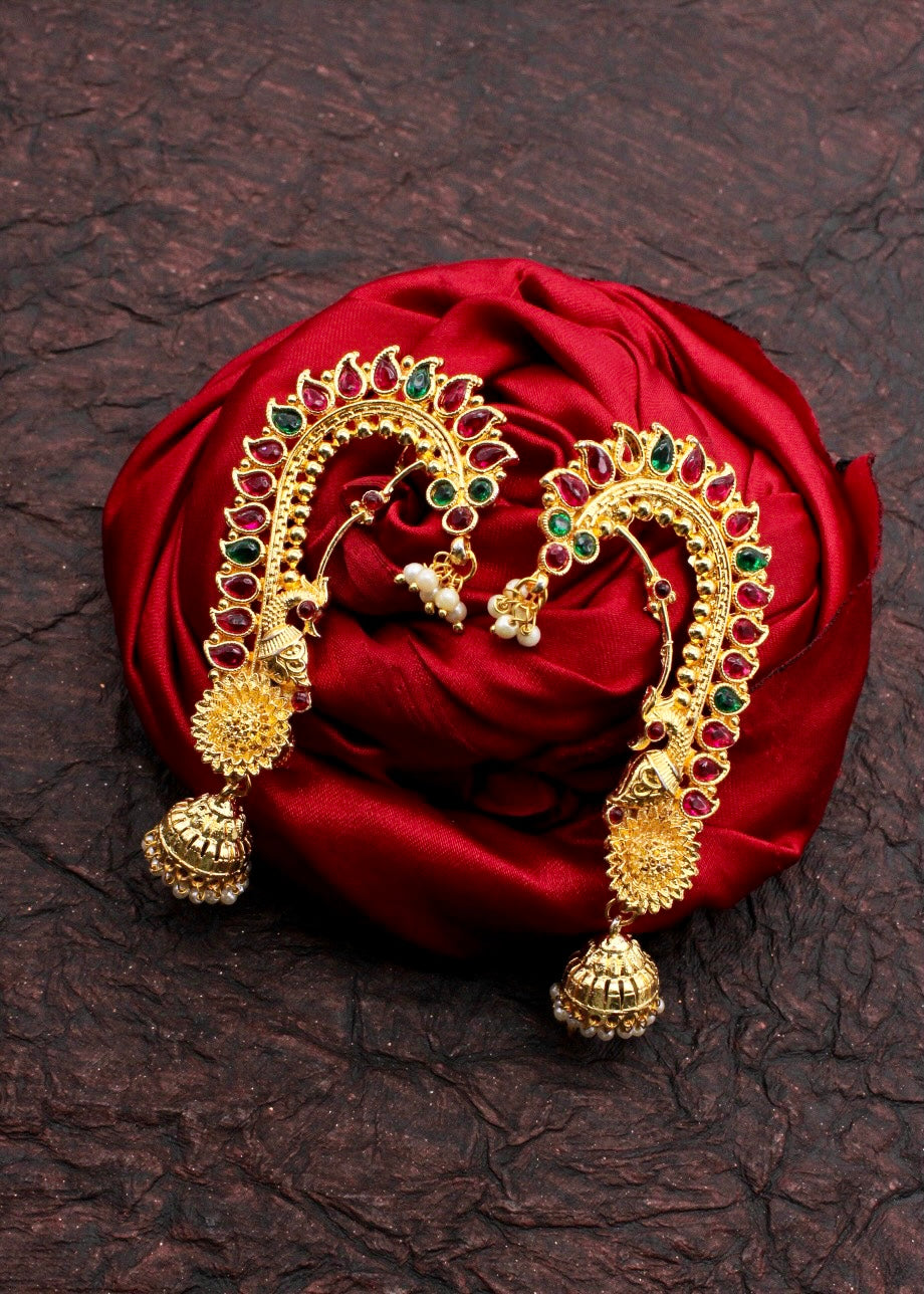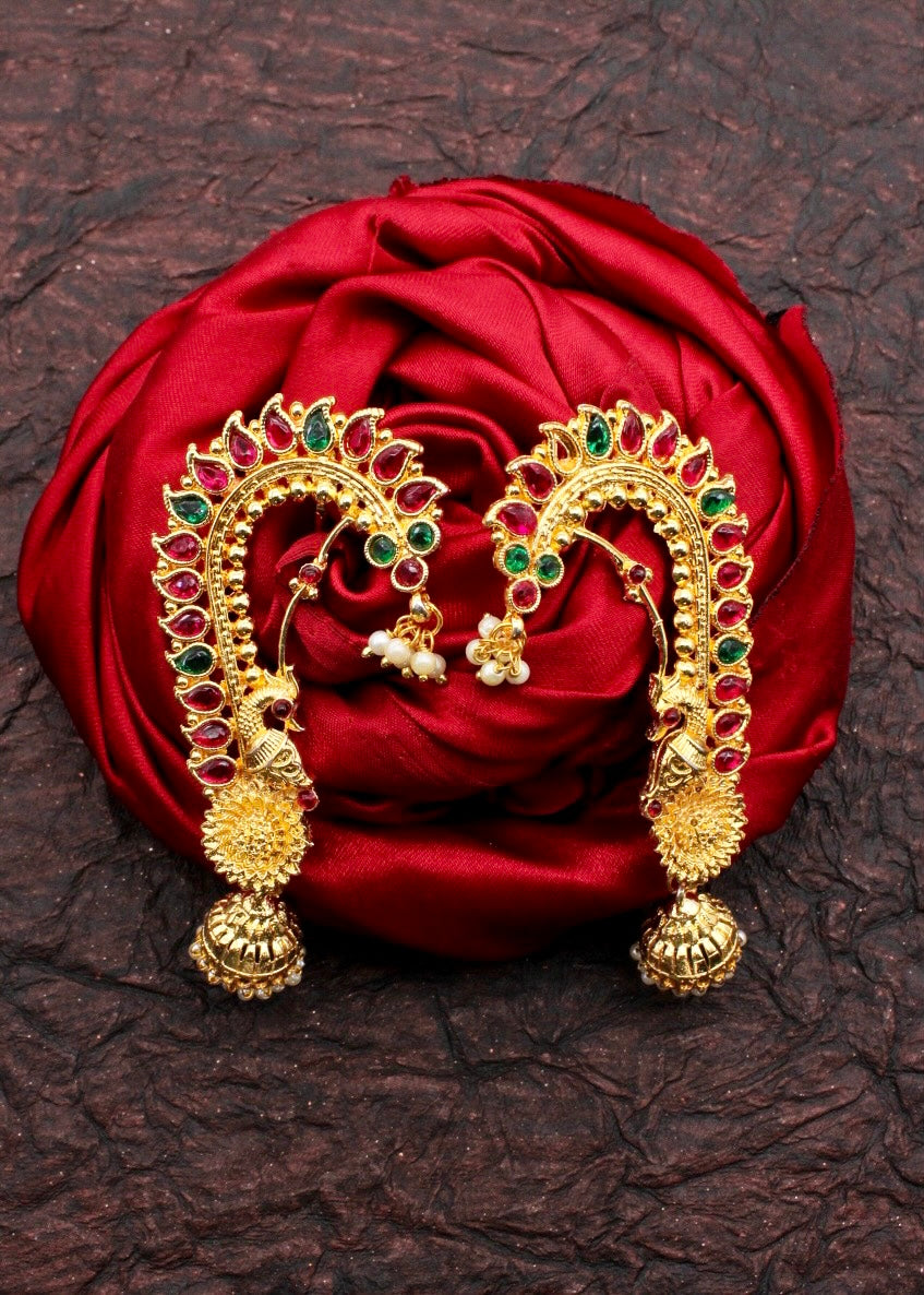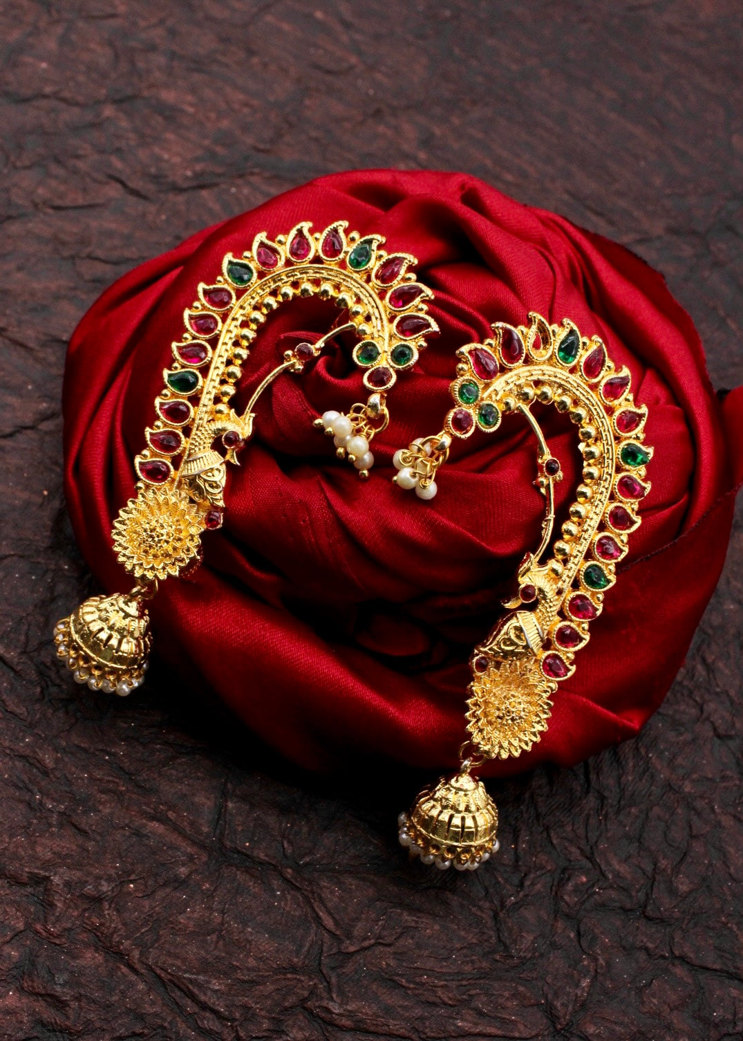 Complement your traditional attire by clubbing this pair of attractive peacock with floral design ear-cuffs and get that distinct look. These are encrusted with sparkling pink, green stone and made from antique golden finish metal. It is decorated with dangling pearl beads. It is long lasting and highly durable.