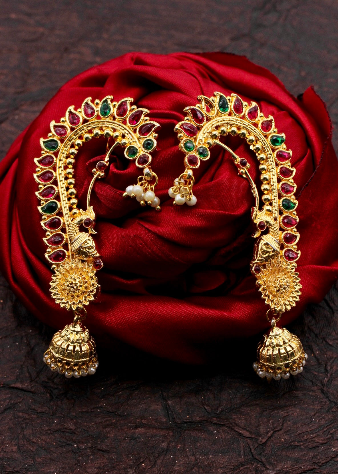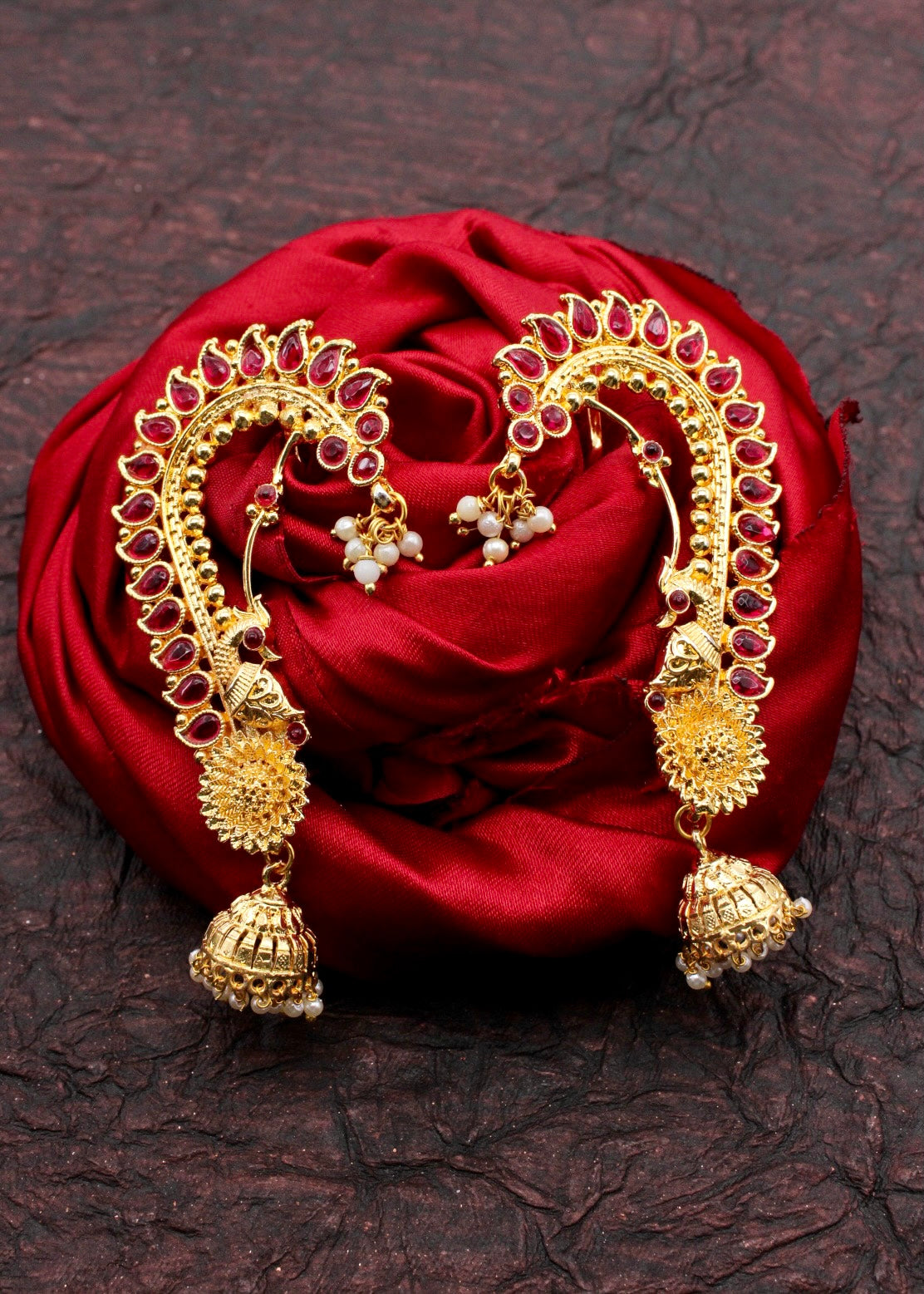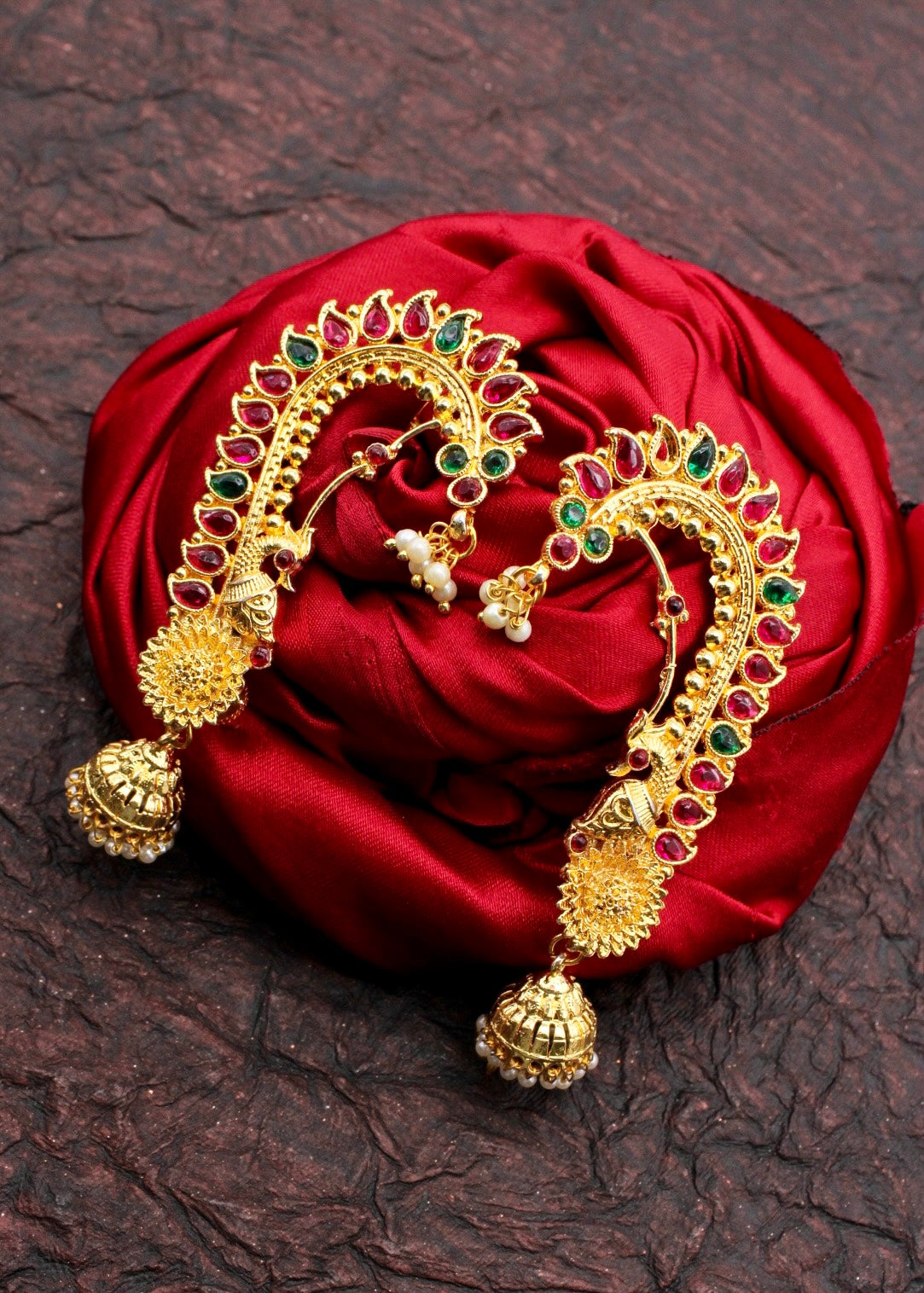 Complement your traditional attire by clubbing this pair of attractive peacock with floral design ear-cuffs and get that distinct look. These are encrusted with sparkling pink, green stone and made from antique golden finish metal. It is decorated with dangling pearl beads. It is long lasting and highly durable.