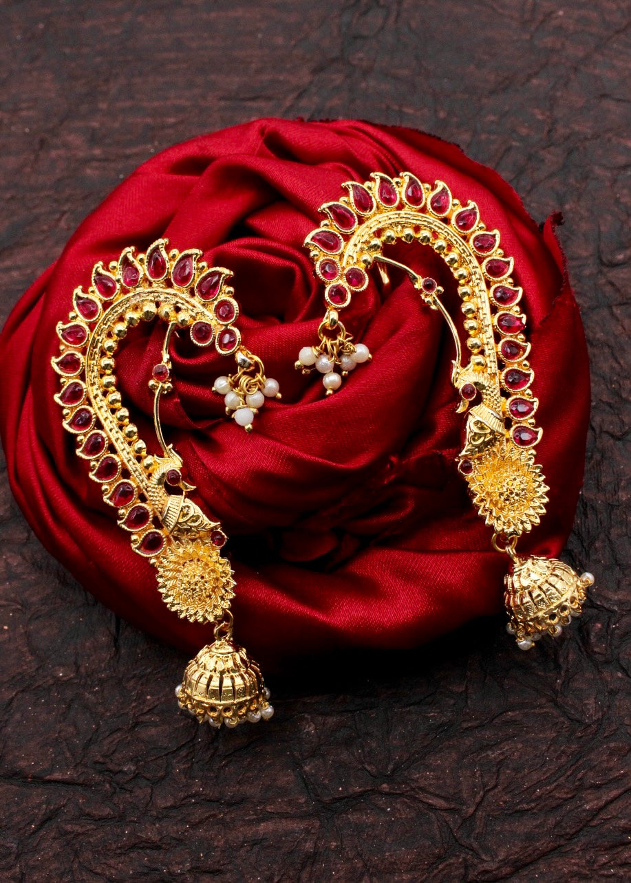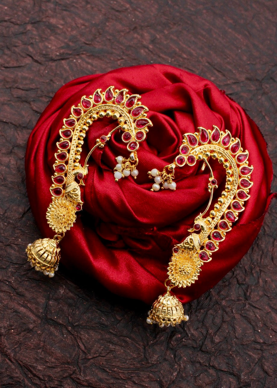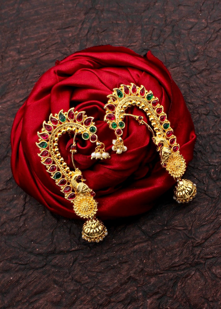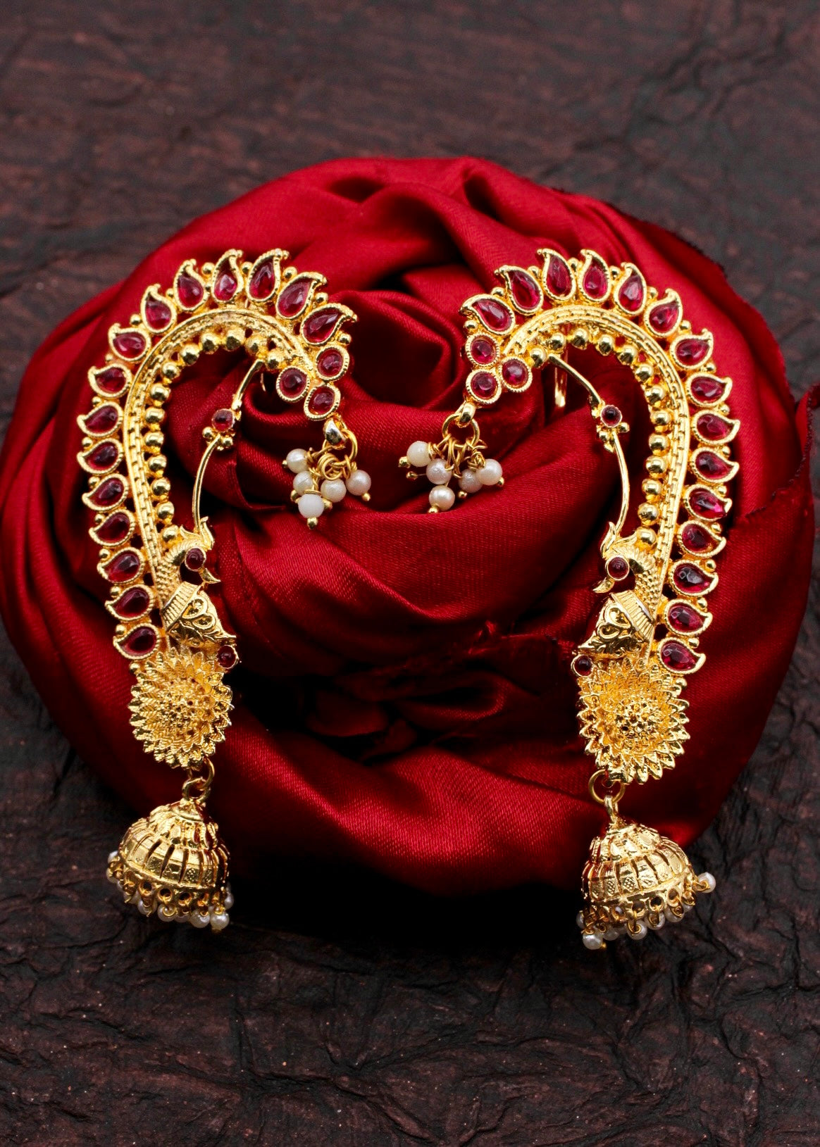 Complement your traditional attire by clubbing this pair of attractive peacock with floral design ear-cuffs and get that distinct look. These are encrusted with sparkling pink, green stone and made from antique golden finish metal. It is decorated with dangling pearl beads. It is long lasting and highly durable.