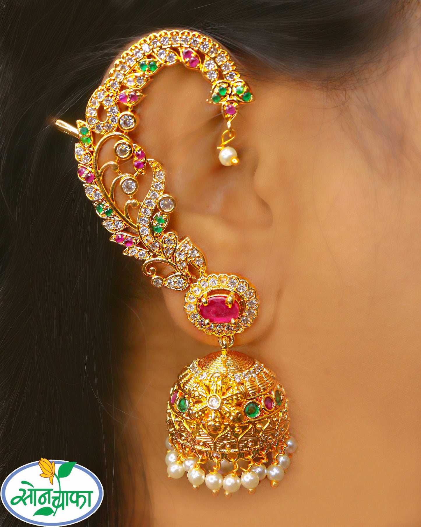 Sonchafa Jewellery brings to you this pair of stylish peacock designer ear-cuffs. They are studded with pink, green, white stones and made from golden finish metal. These earcuffs are superior in quality and decorated with pearls for added attraction.