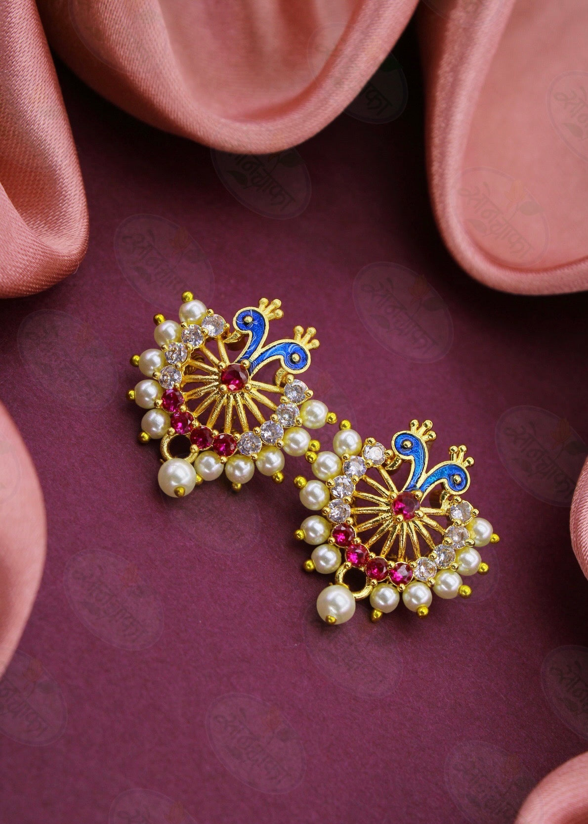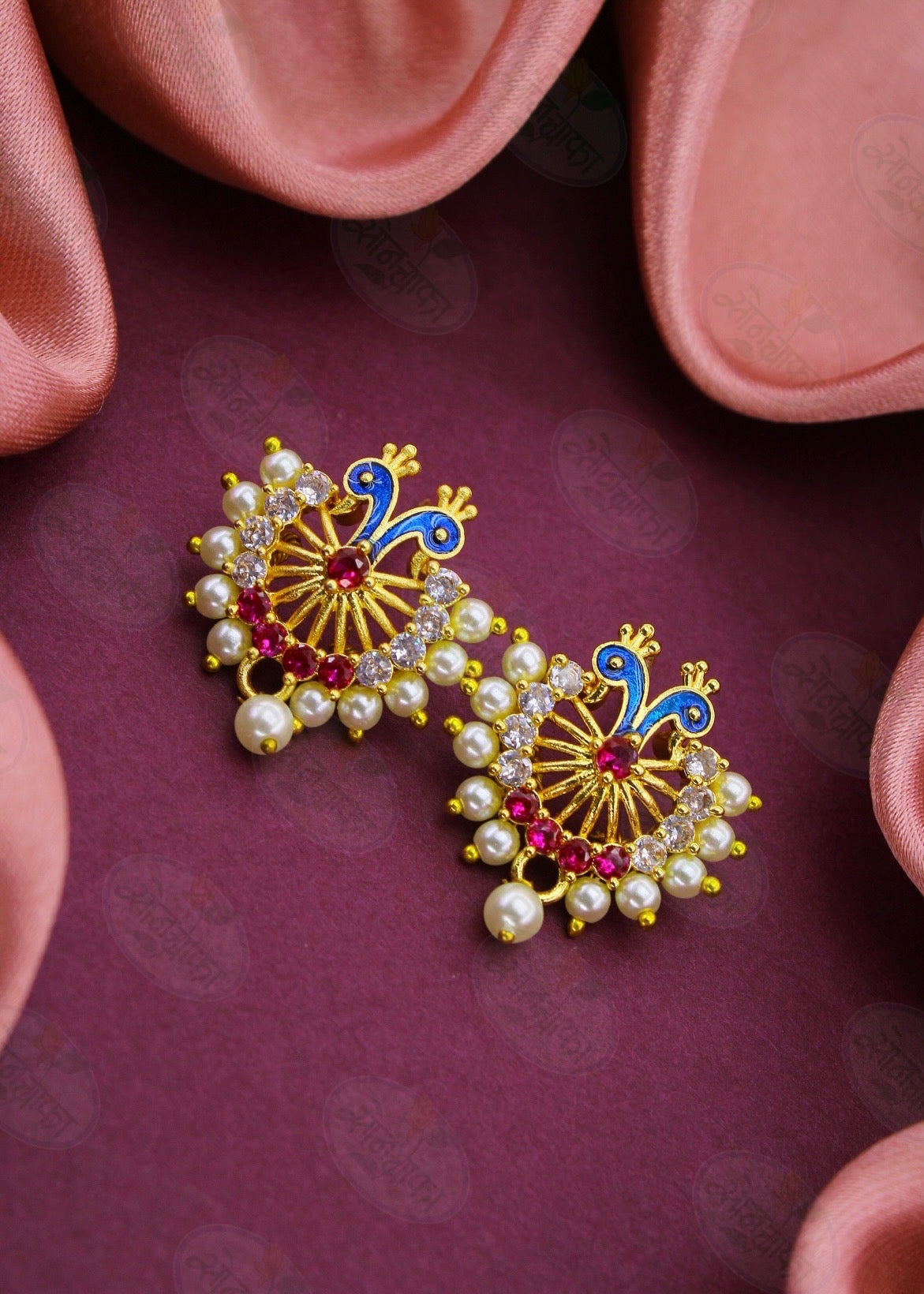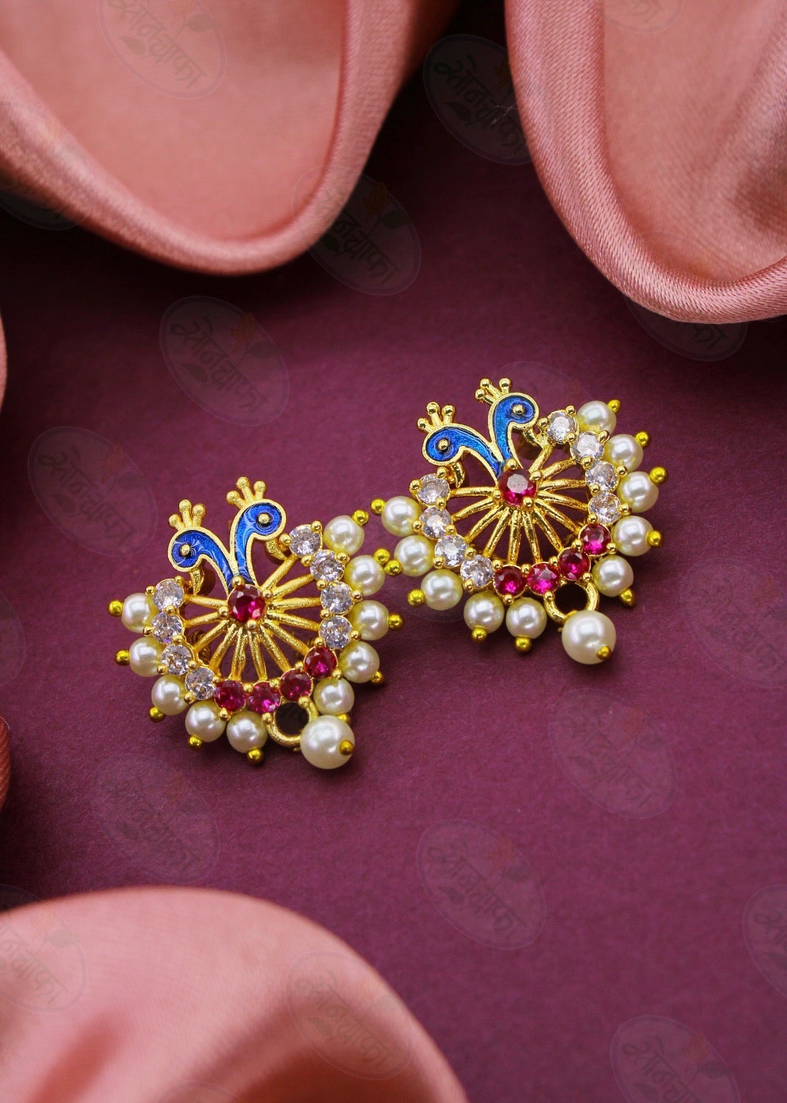 Gorgeously crafted peacock earrings with a train of feathers and pearl corona. Made in copper with a gold finish.Perfect statement, fusion ear to make heads turn.