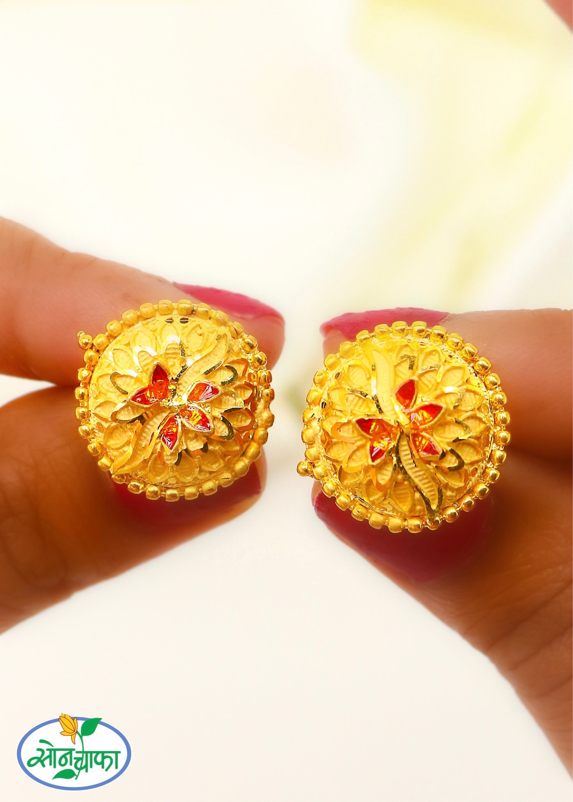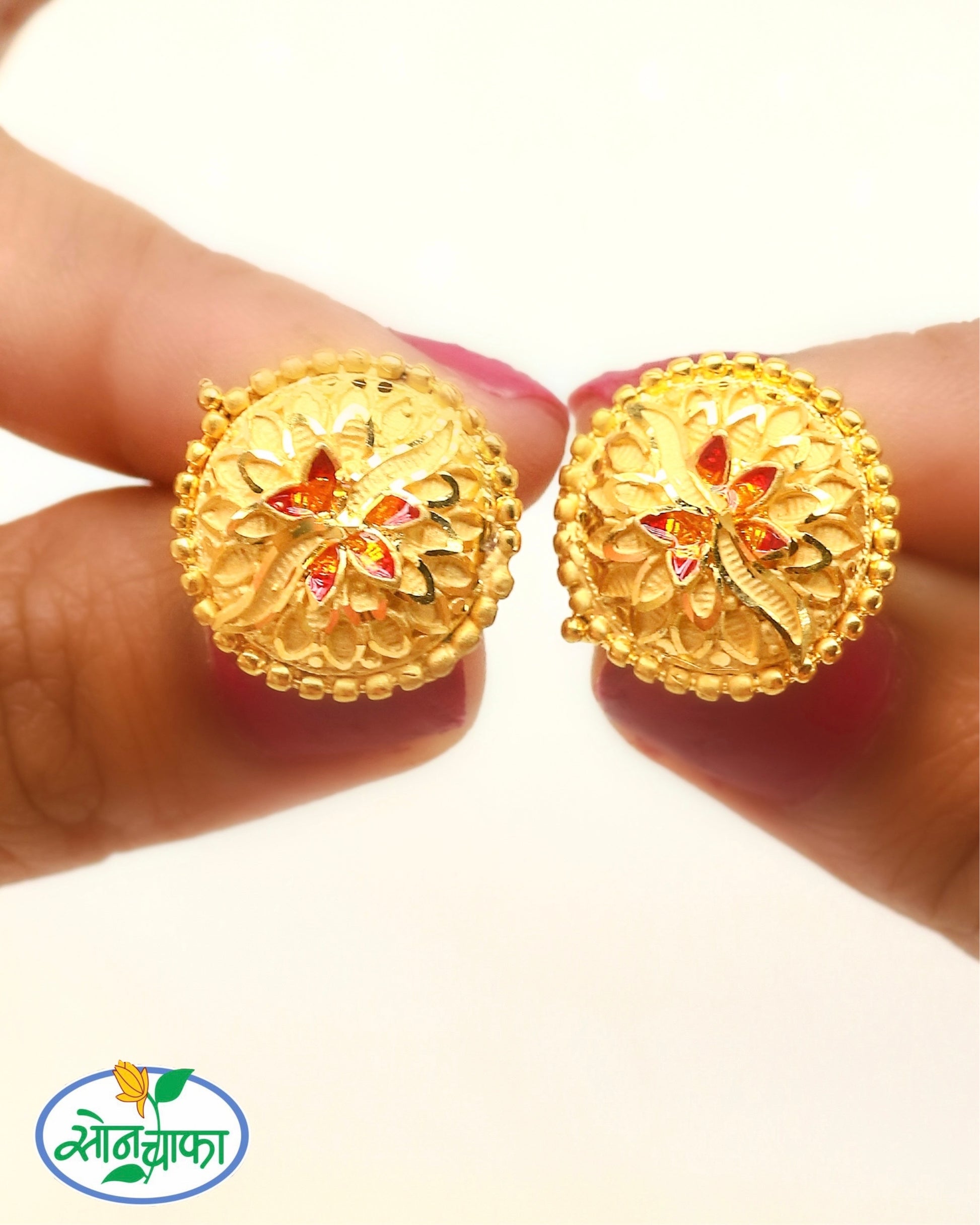 Round shape wonderful studs earrings form Sonchafa Jewellery which is perfect match your traditional outfits. It is studded with golden beads & made with 1 gram gold plated on metal. The design of these classy earrings is unique and worth-noticing.