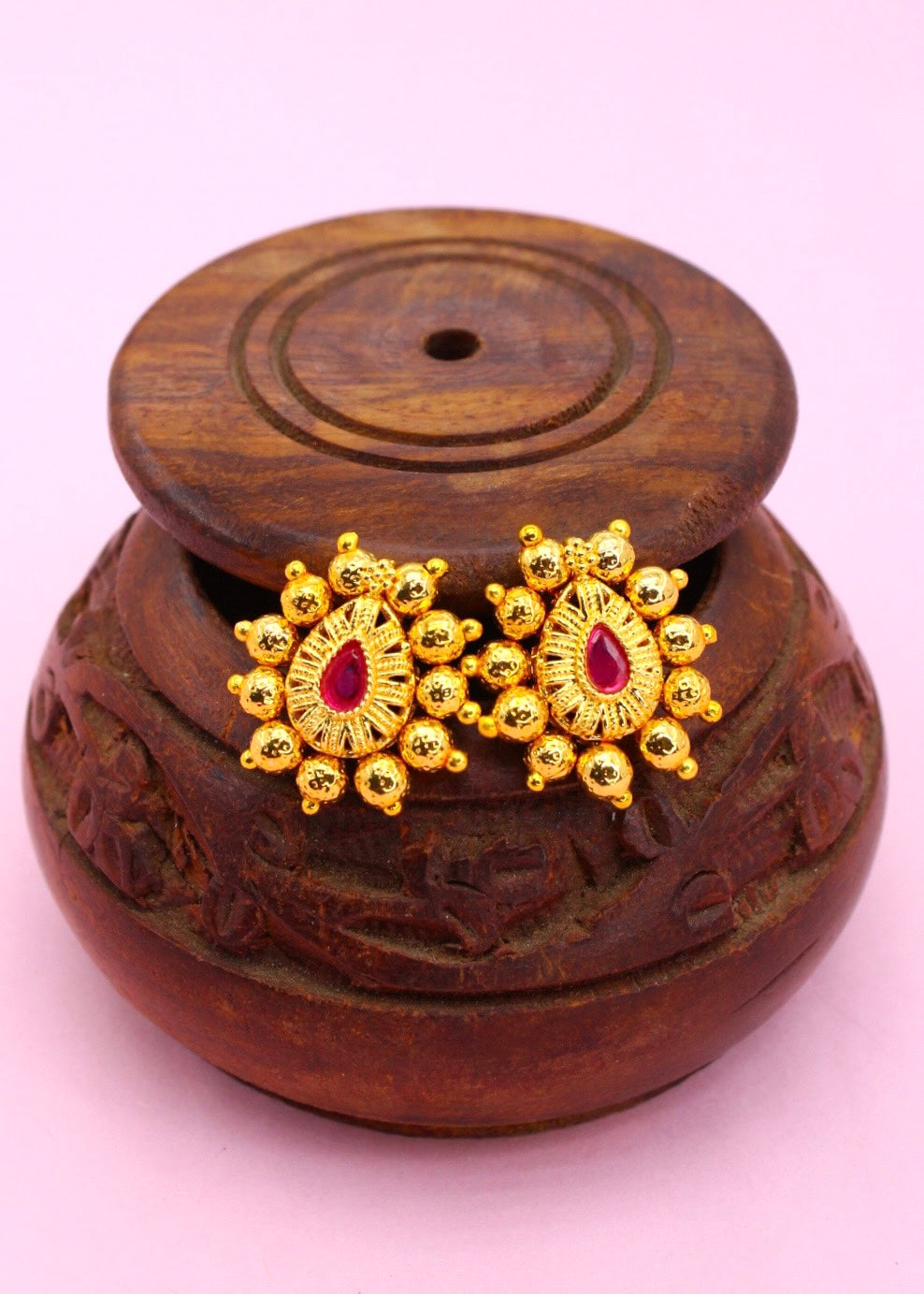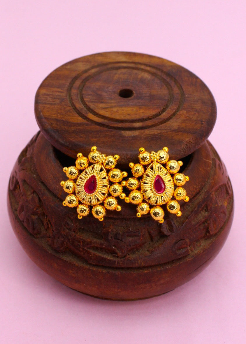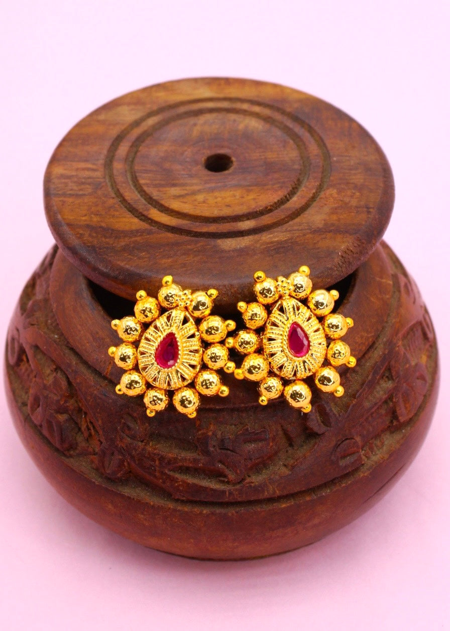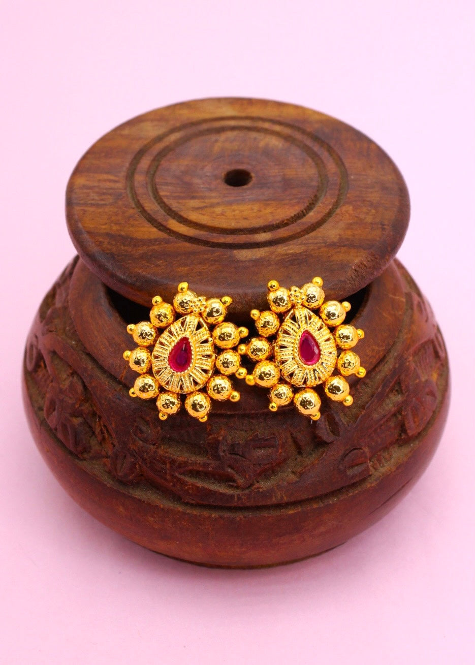 Beautifully designed this Chafekali tops pair of earrings from Sonchafa Jewellery is best to team with Maharashtrian costume. They are studded with golden beads, pink stone and made from golden finish metal. These earrings are easy to wear as they are press on.