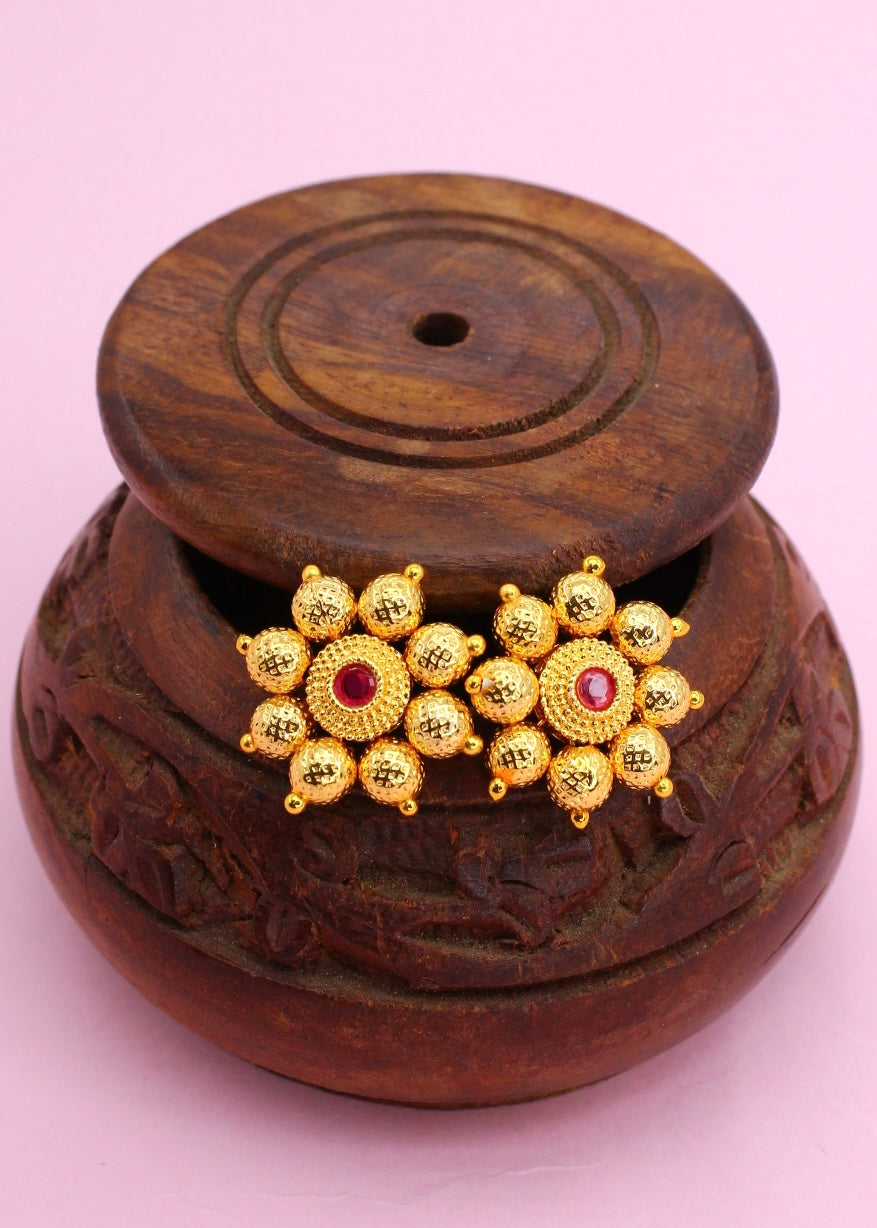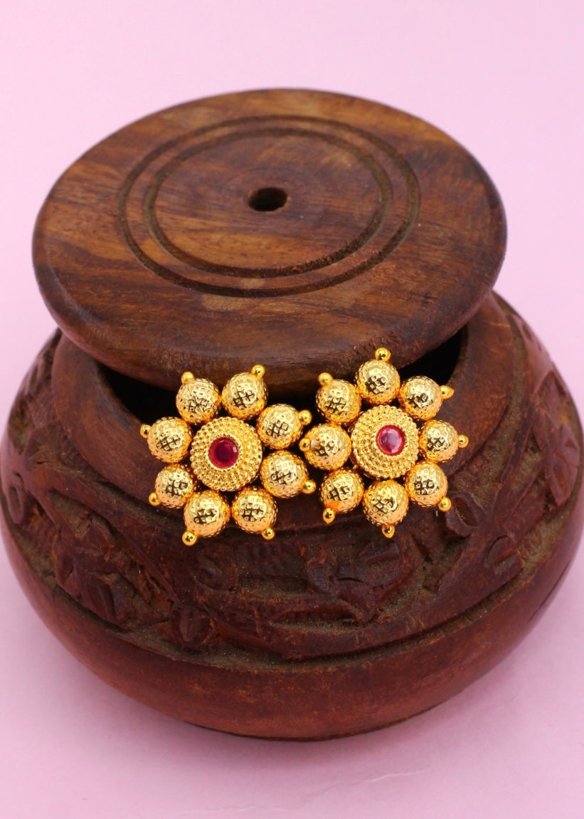 Upgrade your jewellery collection by adding these Malhar Karnful tops earrings from Sonchafa Jewellery. They are embedded with pink stone along with golden beads. These metal crafted studs are good in quality & skin-friendly as well.