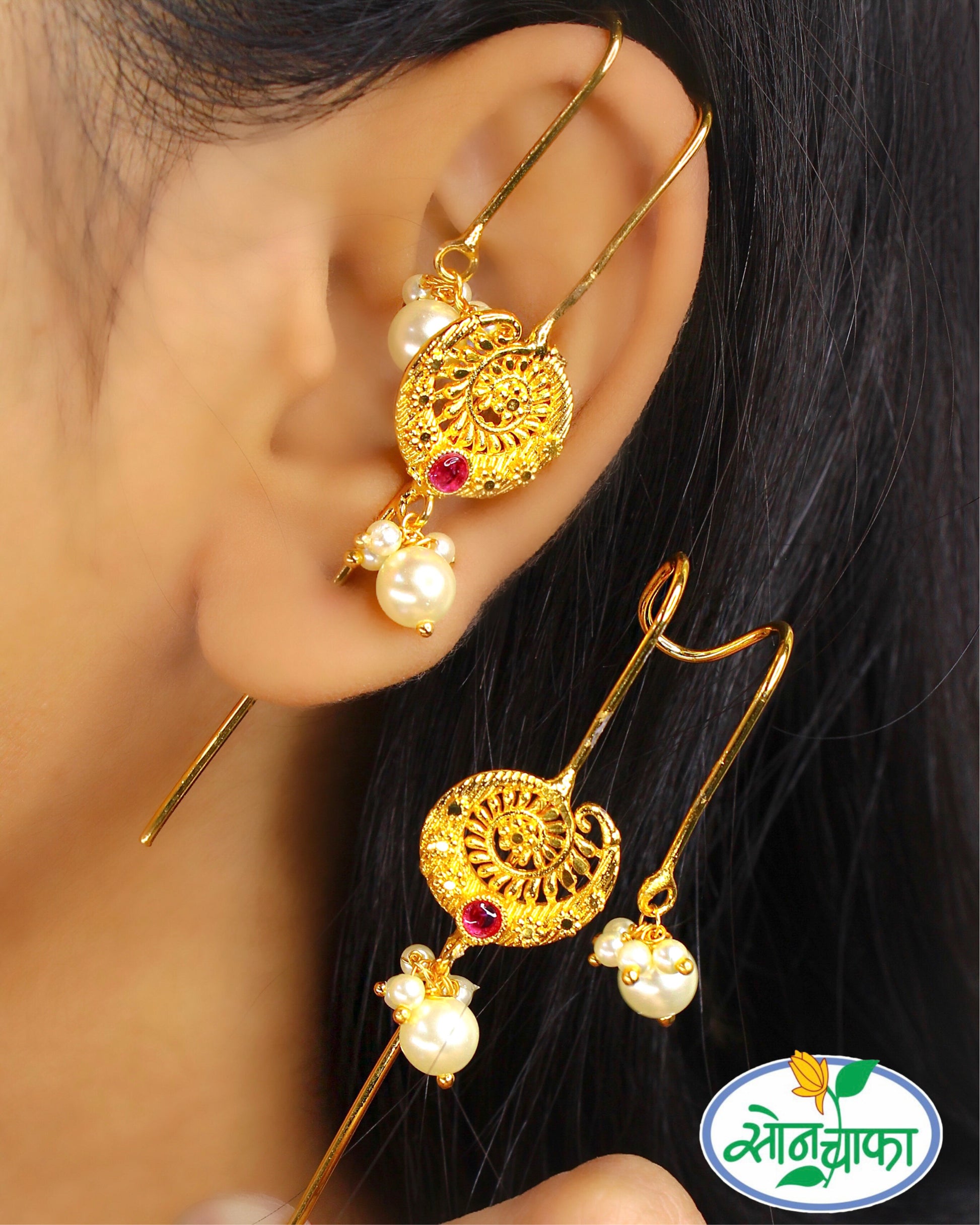 Add a dazzling touch to your persona by clubbing this pair of golden colour adorable Ear-Cuffs with your matching costume. They embedded with Pink stone along with pearls beads and made from golden finish metal.