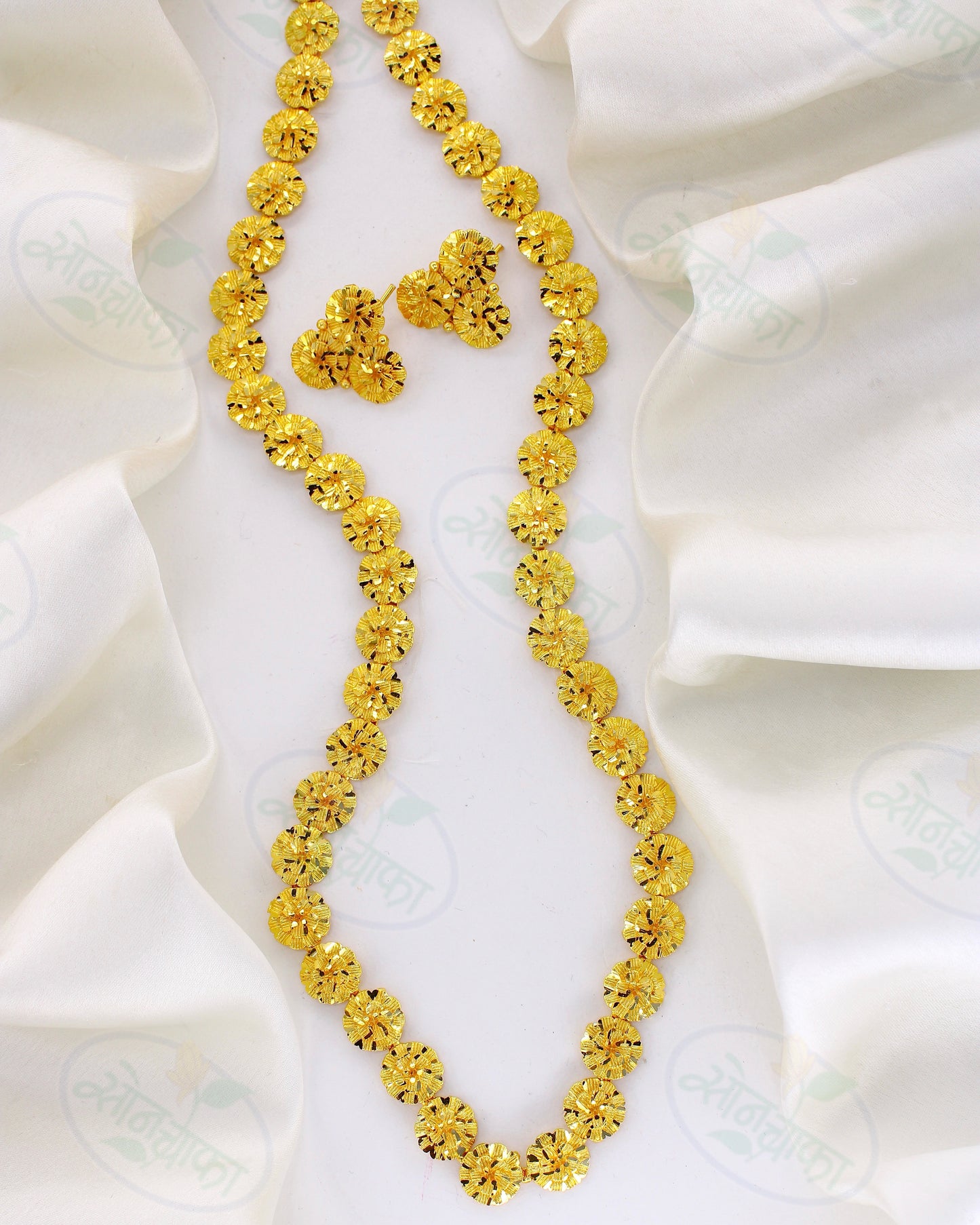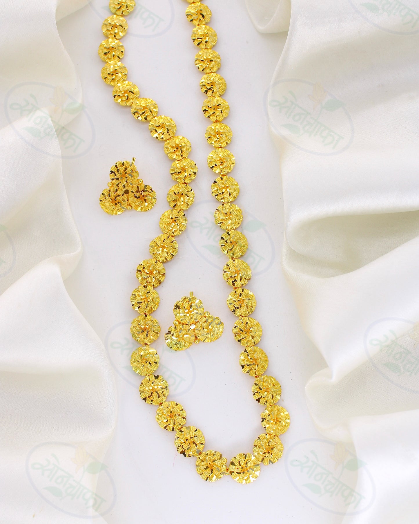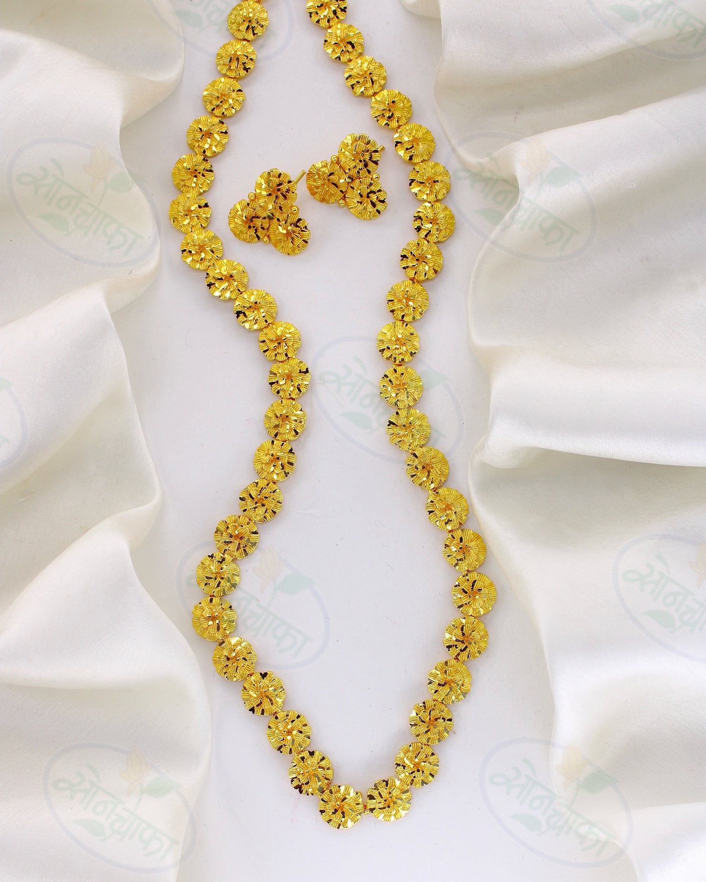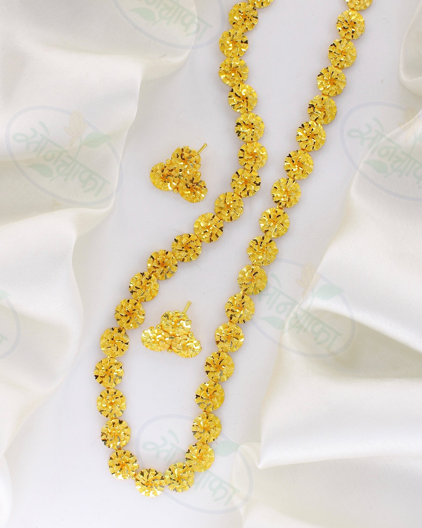 Gold plated triple layer long floral designer necklace set from Sonchafa Jewellery for traditional look. It is wonderfully crafted with 1 gram gold plated metal along with golden chain. It is long lasting and high in durability. It will surely intensify your classy look.