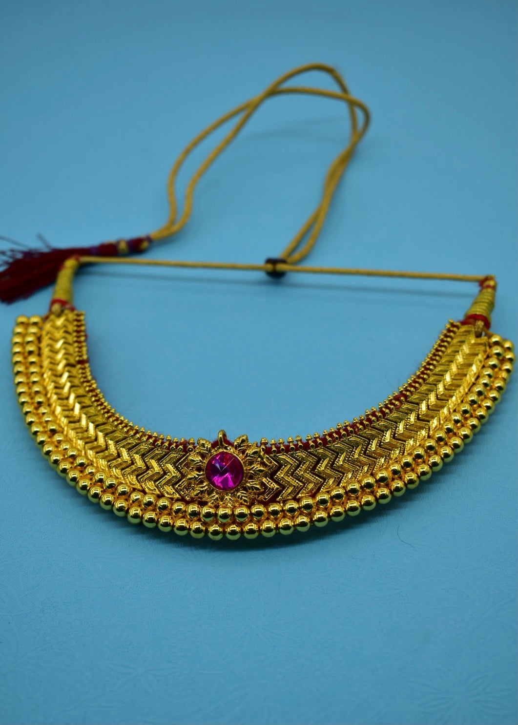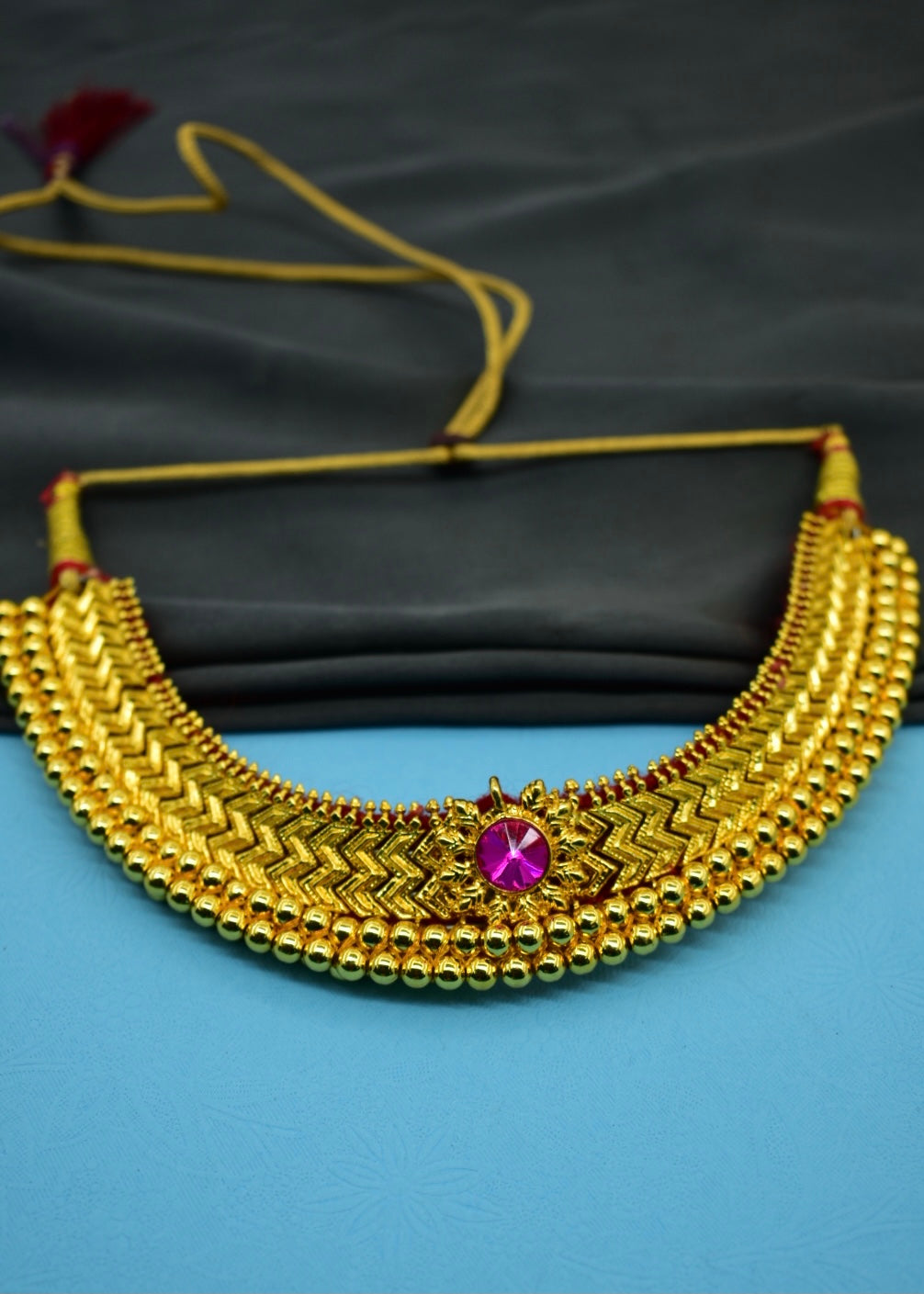 This Maharashtrian Vajratik necklace from Sonchafa Jewellery will appeal to your at very first look. It is woven with pink stone and golden beads fashioned from golden finish metal. This vajrtik necklace comes with adjustable dori, so that you can fit it properly.