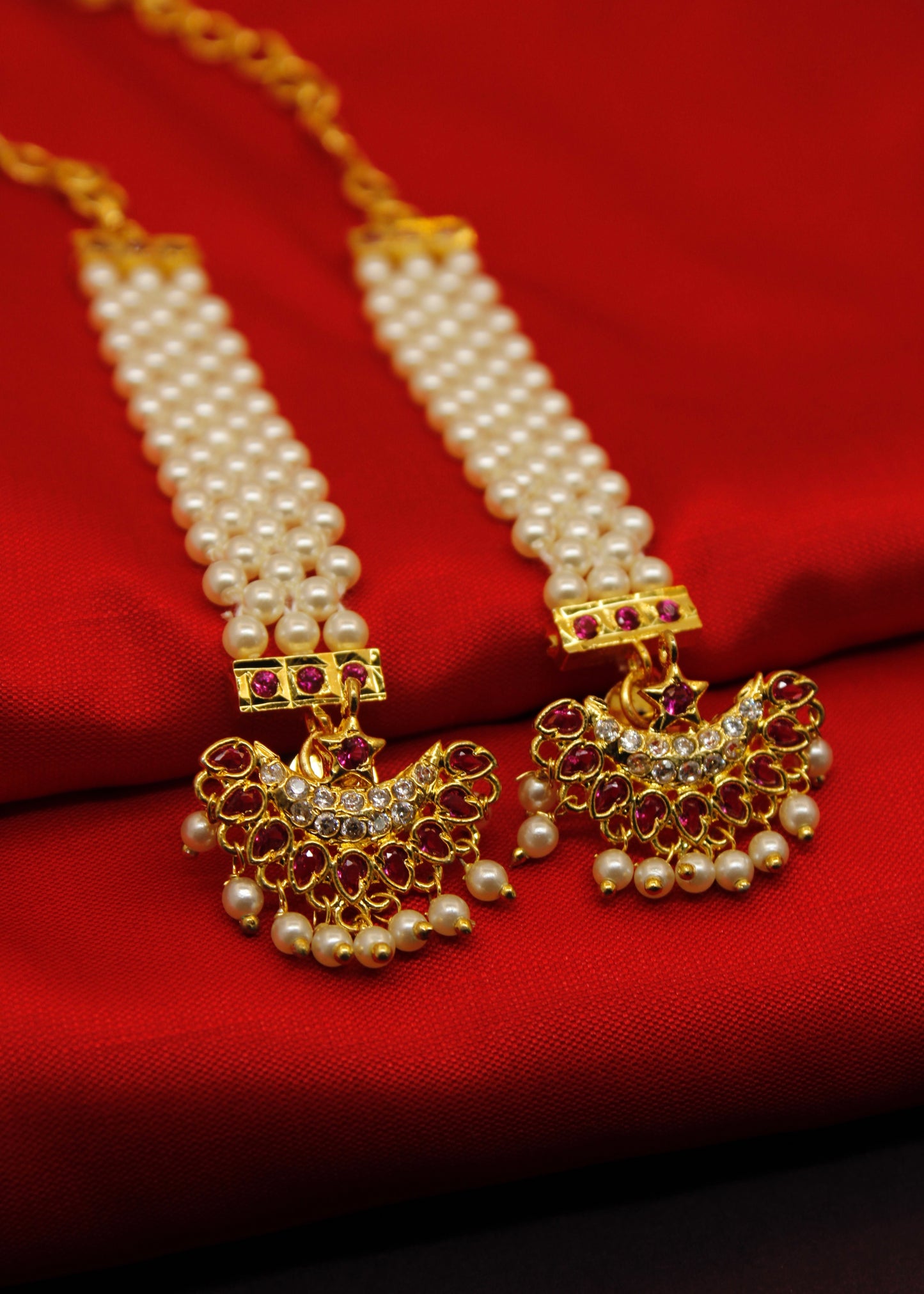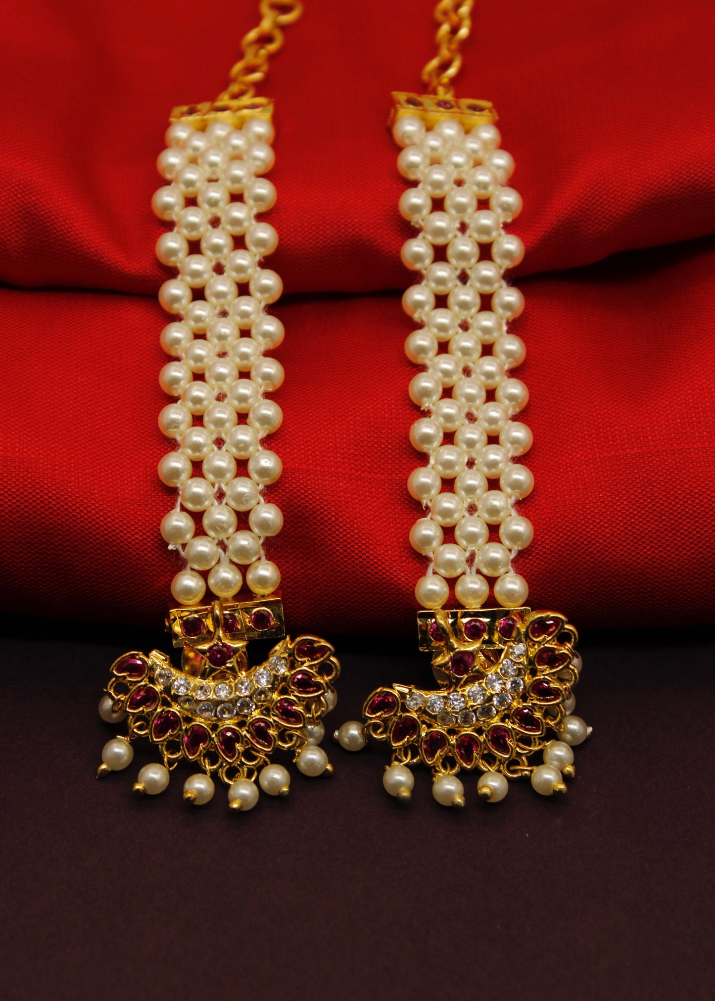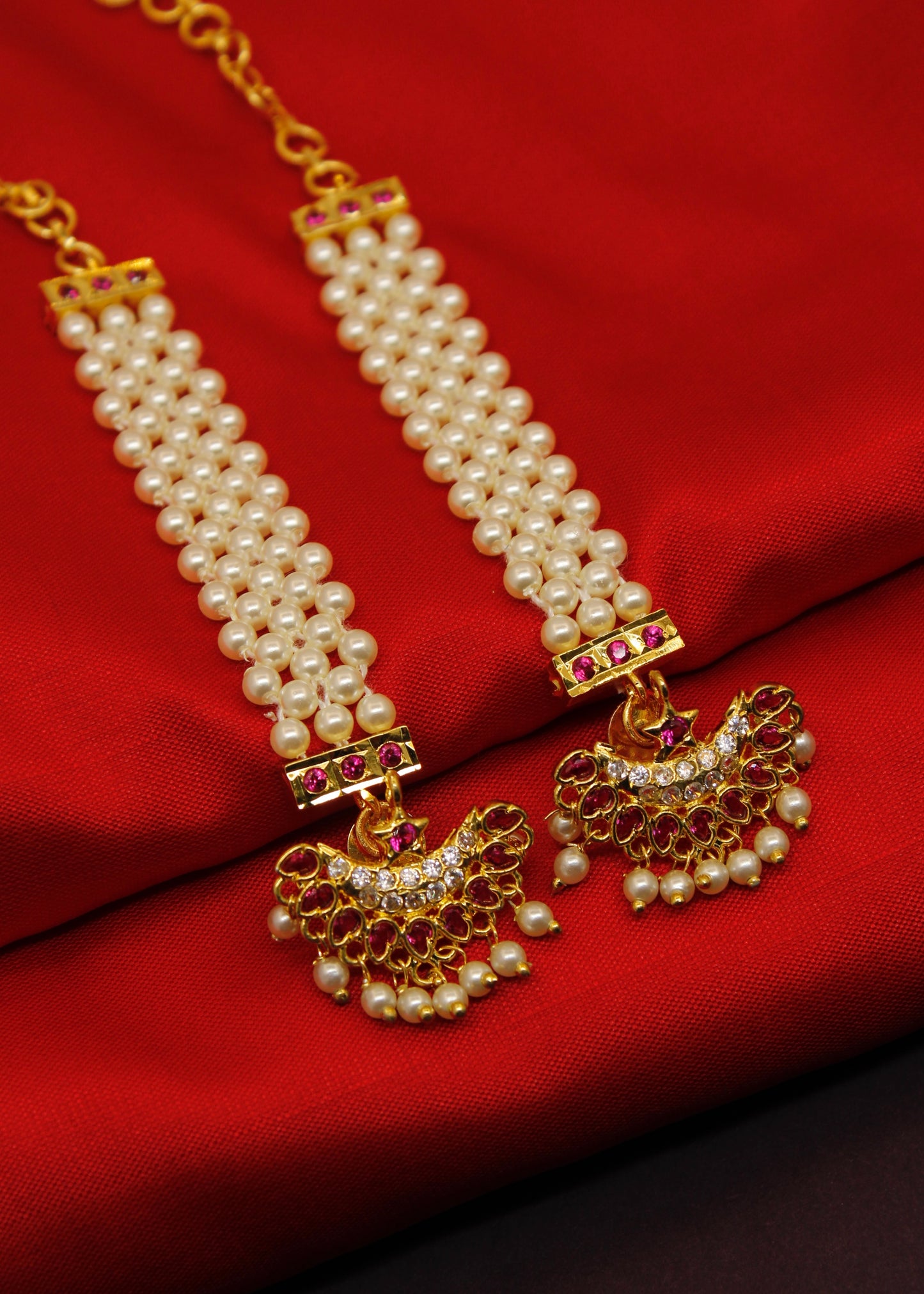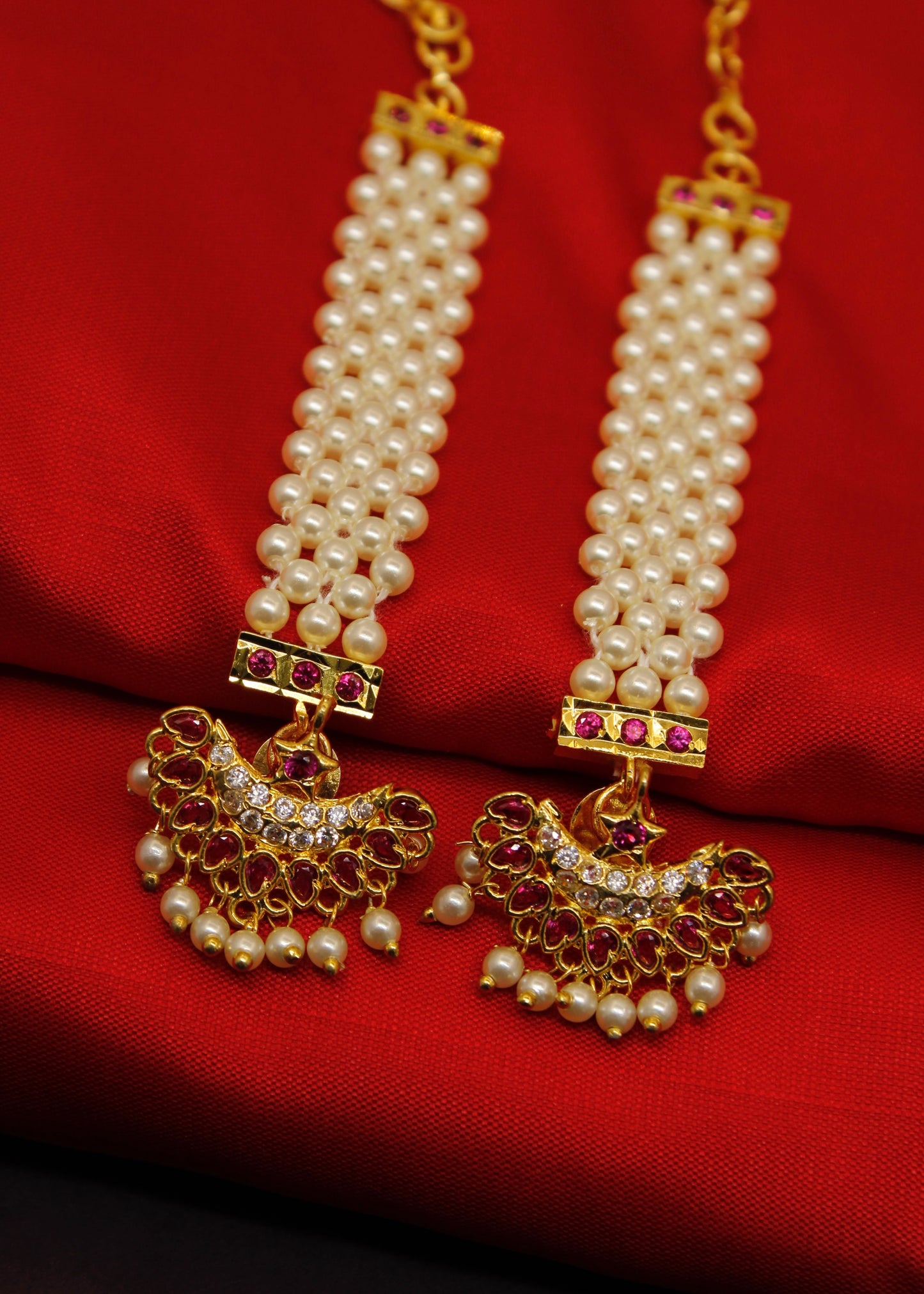 Half - moon designer beautiful maharashtrian ear-kanchain from Sonchafa Jewellery will strike you at very first look. They are embedded with sparkling white - pink colour stones made from golden finish metal. These earrings are styled with pearl beads and feature wonderful design.