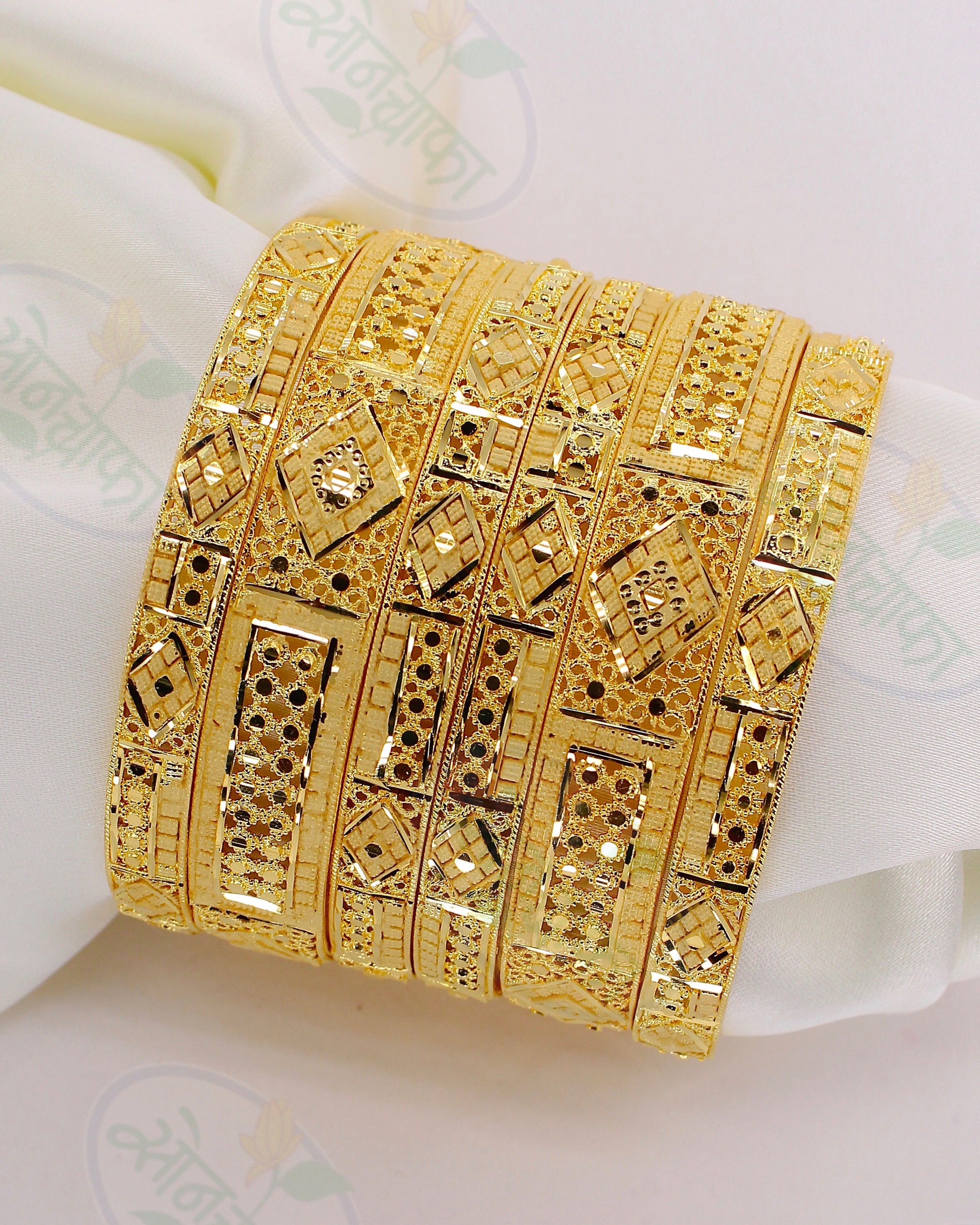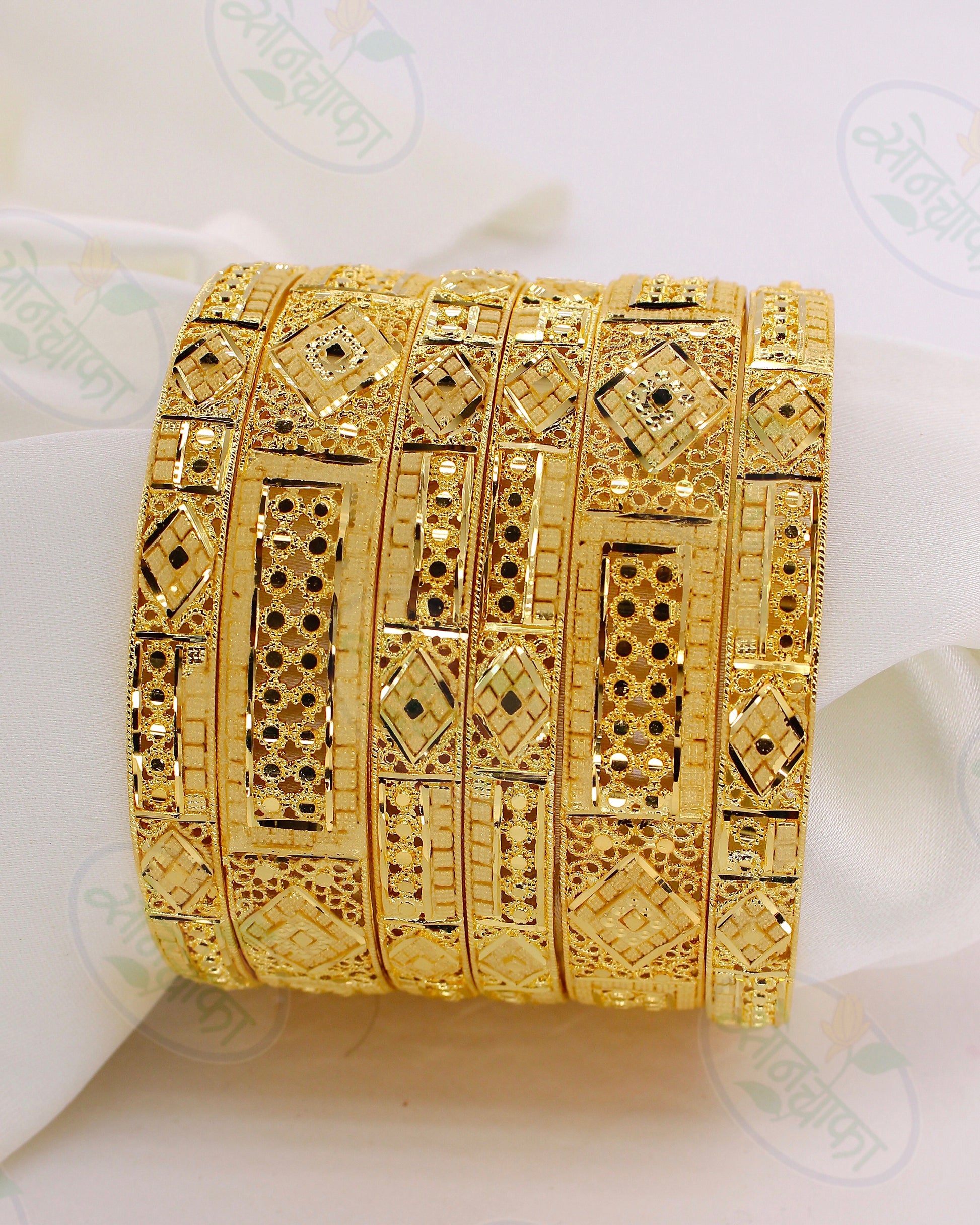 This set of six 1 gram gold plated appealing bangles styled with sparkling pink stones is best to team with traditional costumes. They are made from golden finish metal and ensure high durability. These bangles are sure to lend you that perfect look.