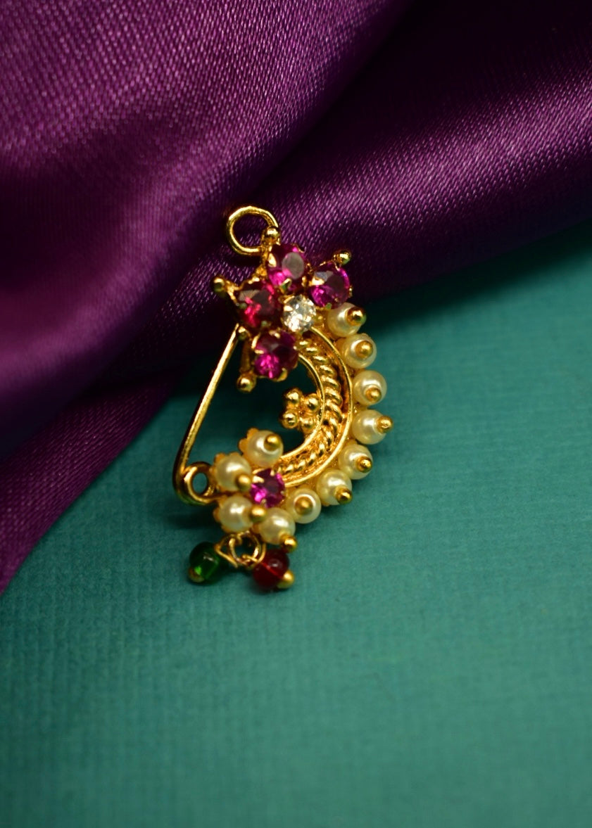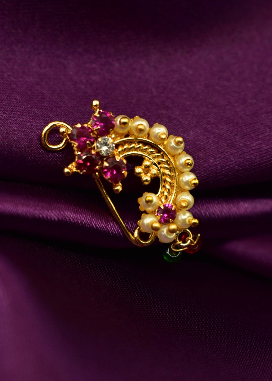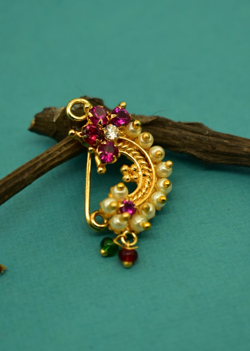 This festive Sonchafa Jewellery brings to you this designer floret nath in classic look. It is studded with pink colour stones and woven with pearl beads. This nath is made from golden finish metal and requires piercing.