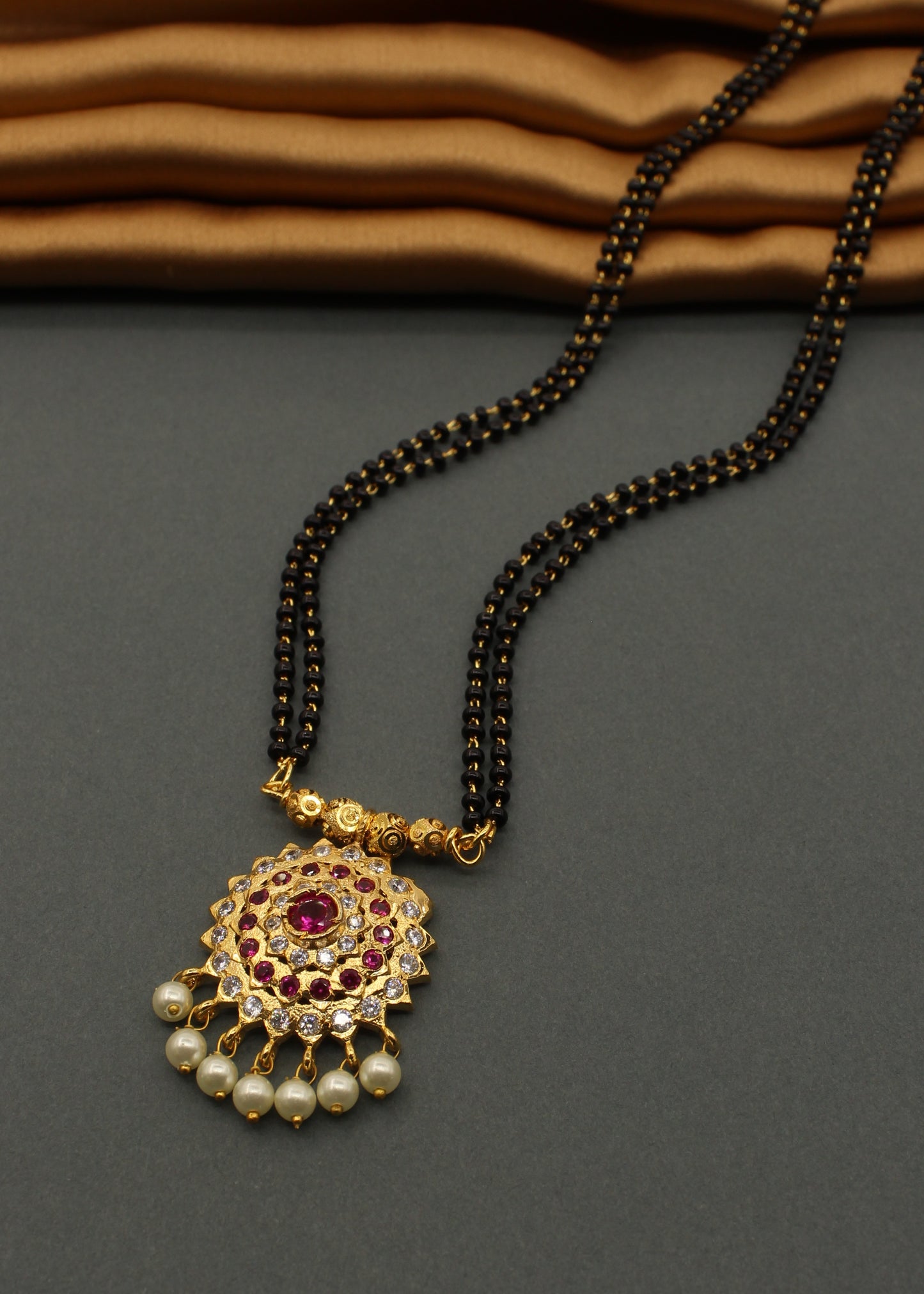Sonchafa presenting Maharashtrian Trendy designer mangalsutra from Sonchafa Jewellery for our traditional look. It is wonderfully crafted with golden finish metal along with pink, white stone. This adorable mangalsutra has wonderful pearls beads droplets for stylish look.