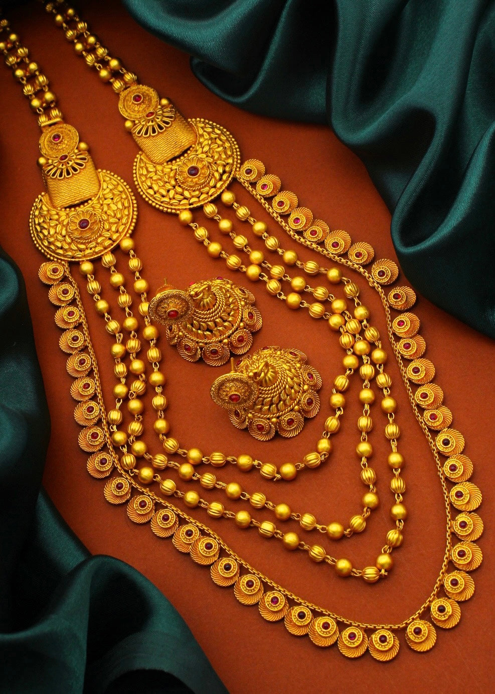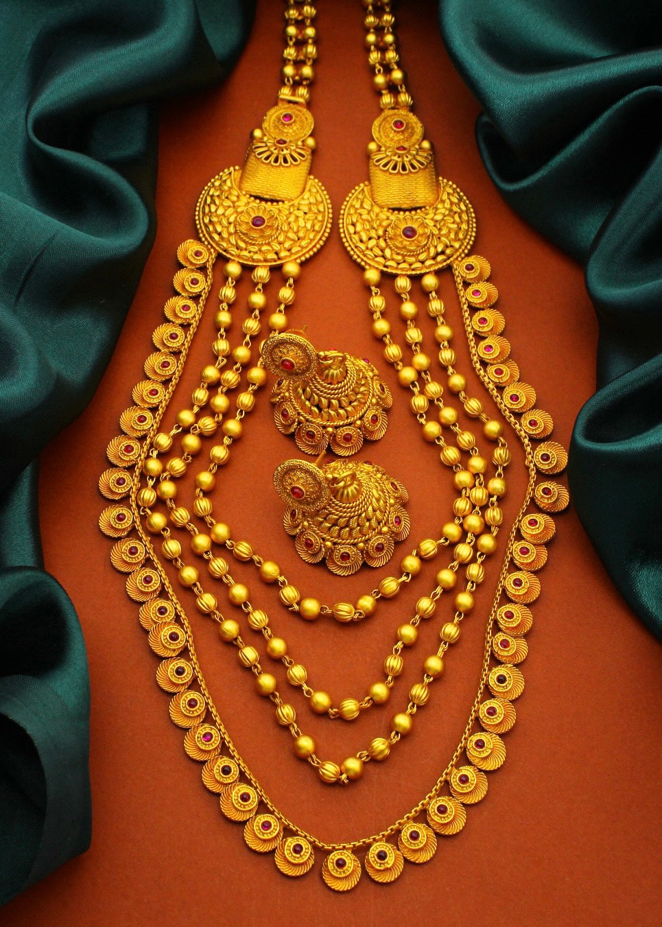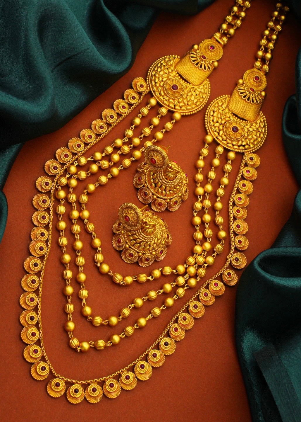 The wedding wear peshwai necklace set from Sonchafa Jewellery will appeal to you at very first look. It is encrusted with kemp stones, made from matte gold finish metal. This classy necklace set has golden beads droplet for added attraction.