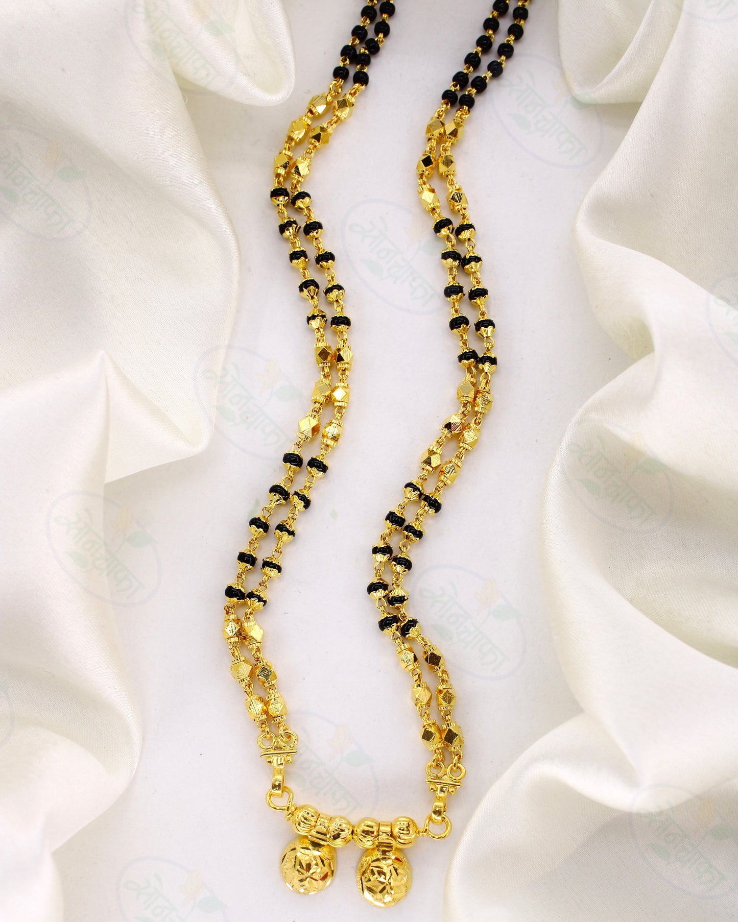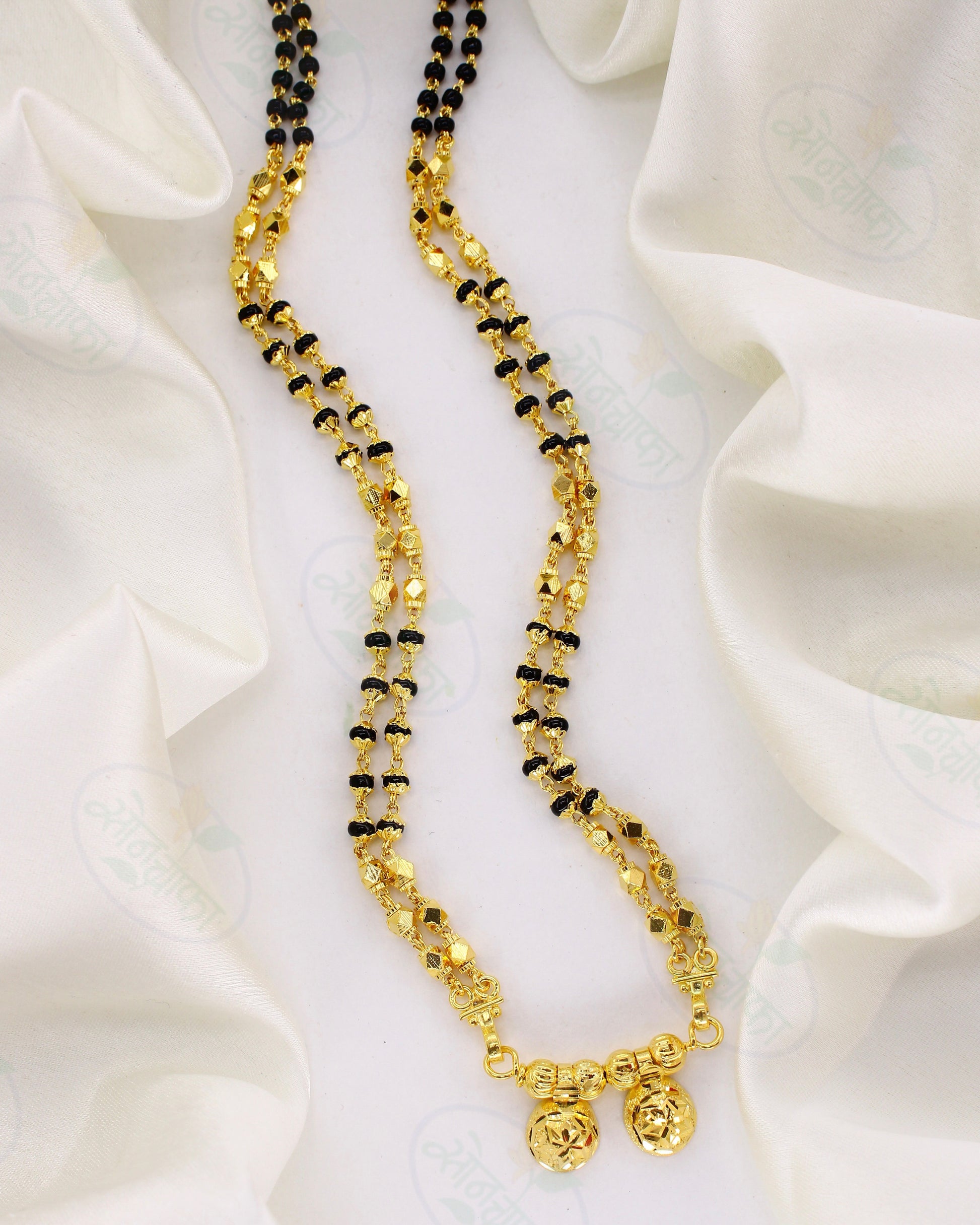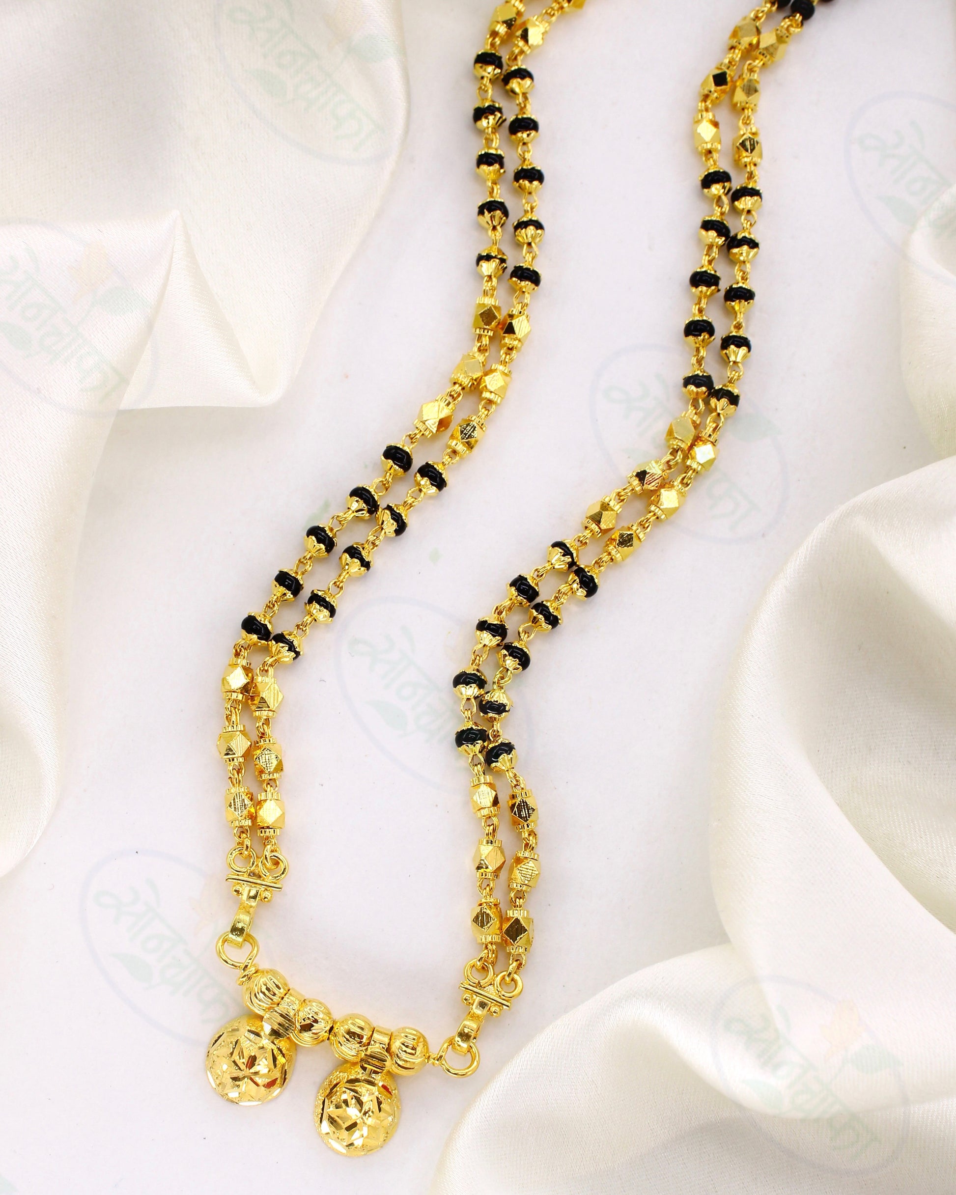 Married women must hold this 1gram gold plated broad mangalsutra set from the house of Sonchafa Jewellery. It is studded with broad desgin patti along with black beads and made from 1 gram gold finish metal.