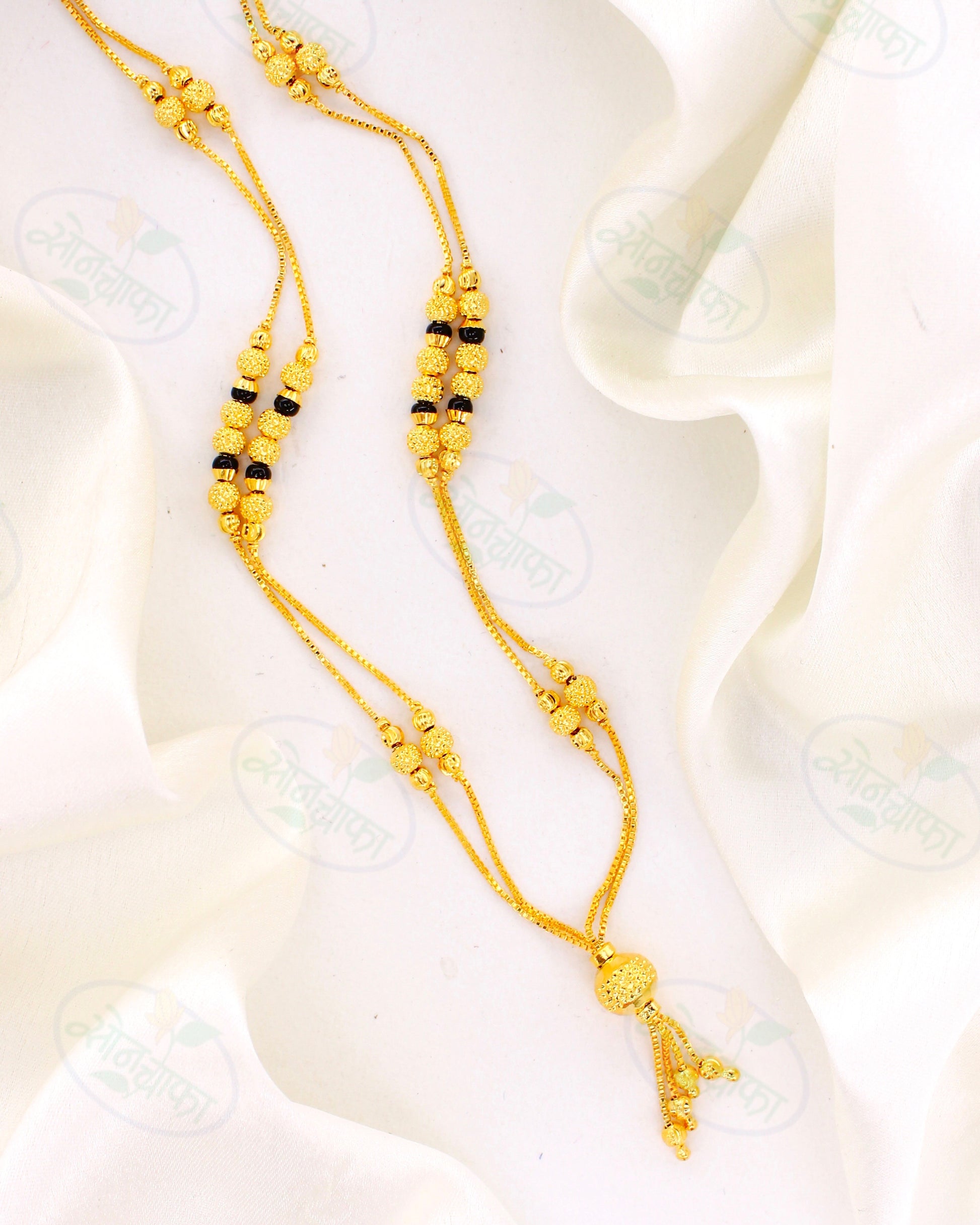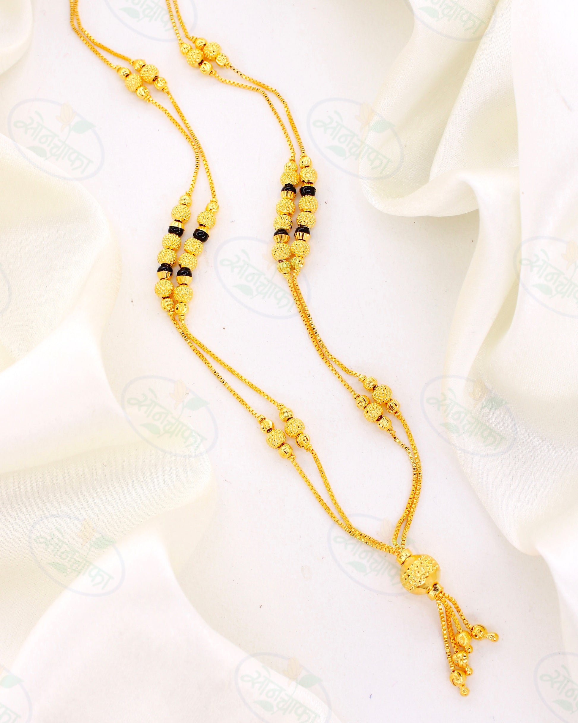 Mangalsutra is must have ornament for married women, so Sonchafa Jewellery offers this 1 gram gold tone wonderful mangalsutra. It is encrusted with sparkling black beads and feature intricate carving design on metal surface.