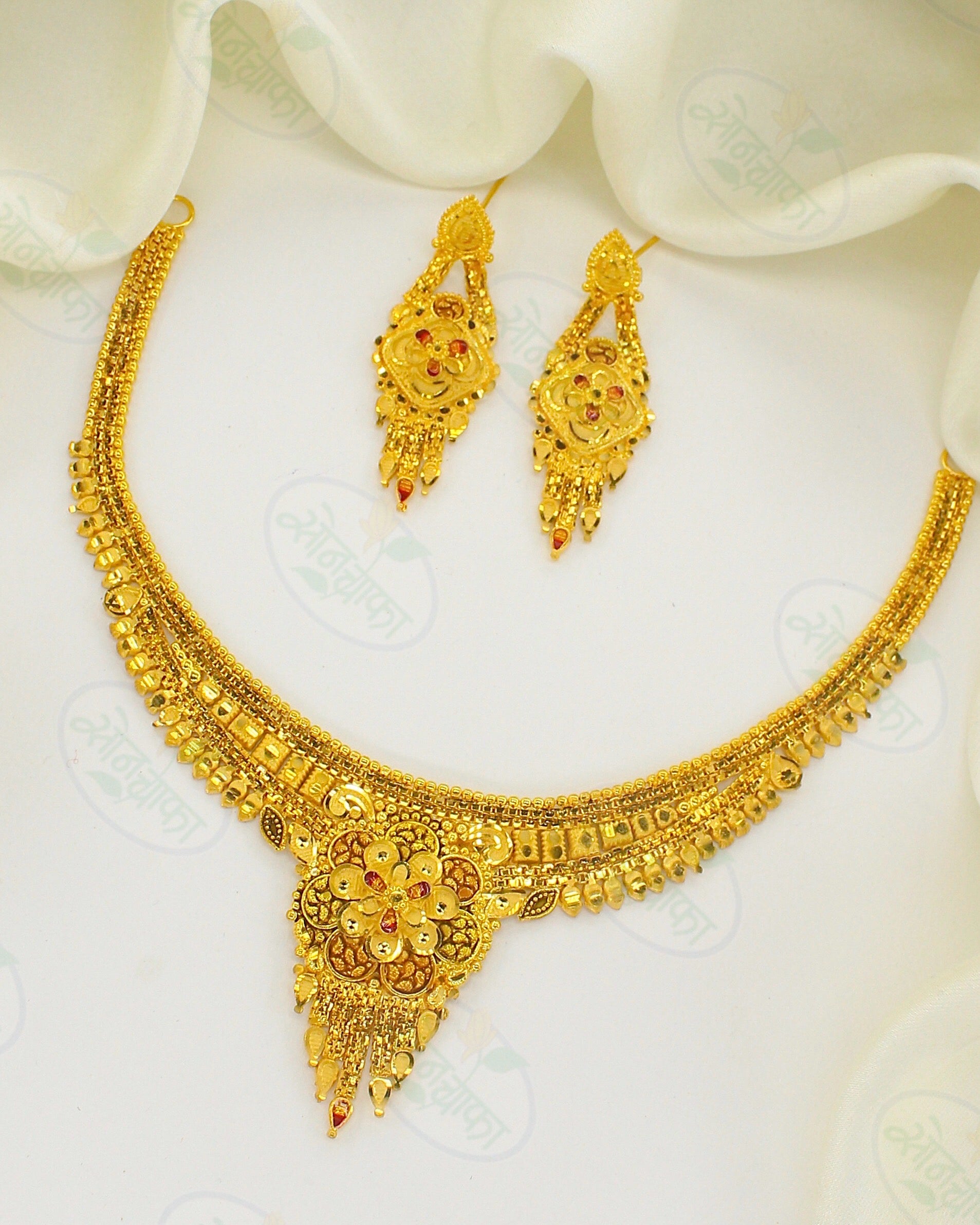 Beautifully designed this gold plated classy necklace from Sonchafa Jewellery will strike you at very first look. It is embedded with gold plated and features wonderful design. This necklace set is high in quality and has golden droplet for added attraction.