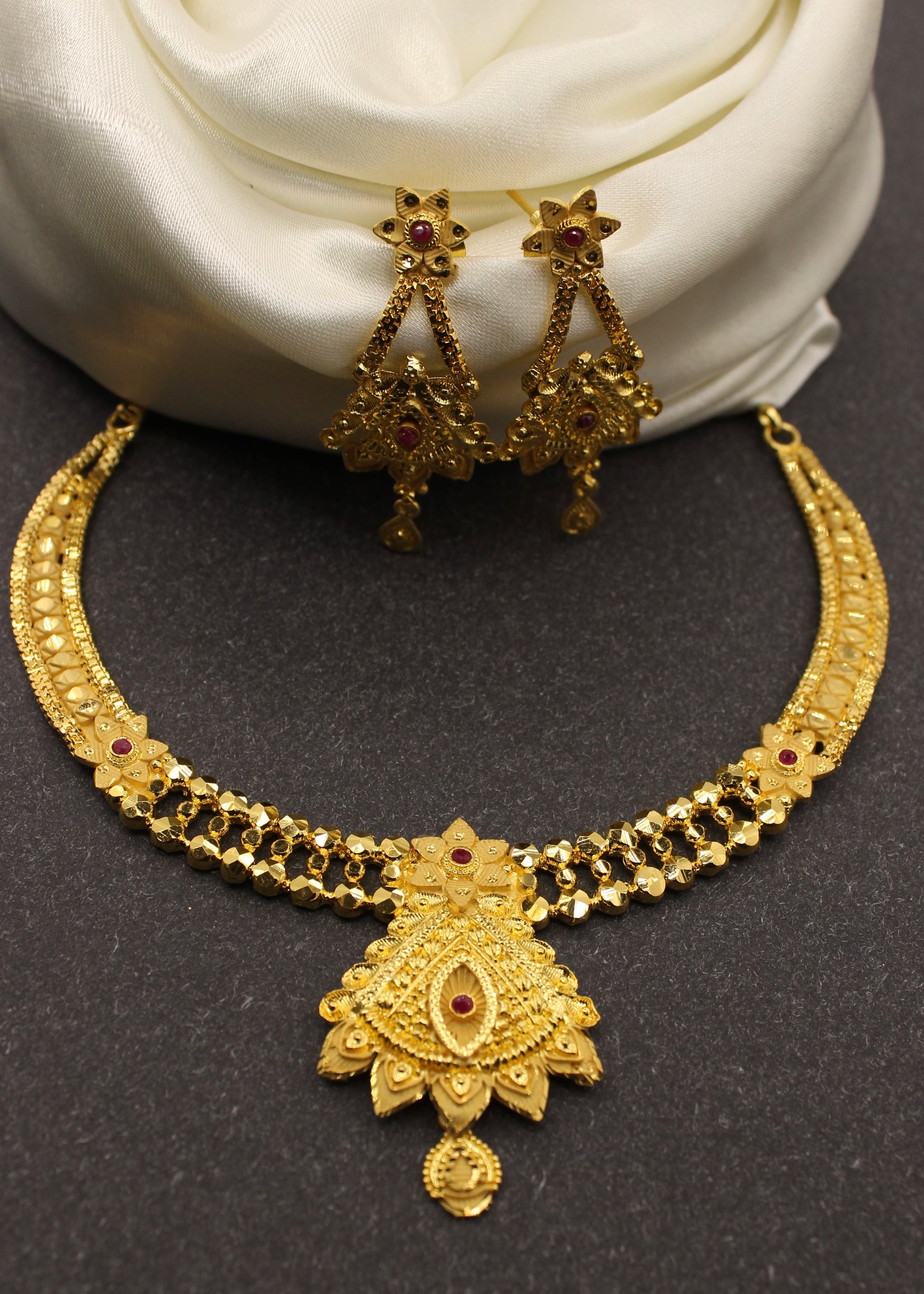 Wonderfully designed latest gold plated necklace set from Sonchafa Jewellery for stylish girls like you. It is styled with studded pink stone & made from 1 gram gold plated metal. This gold plated jewellery set is long lasting and ensures high durability.