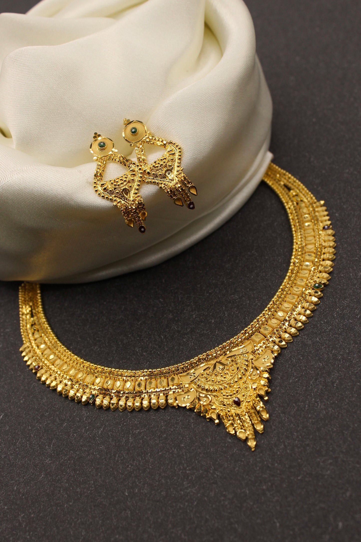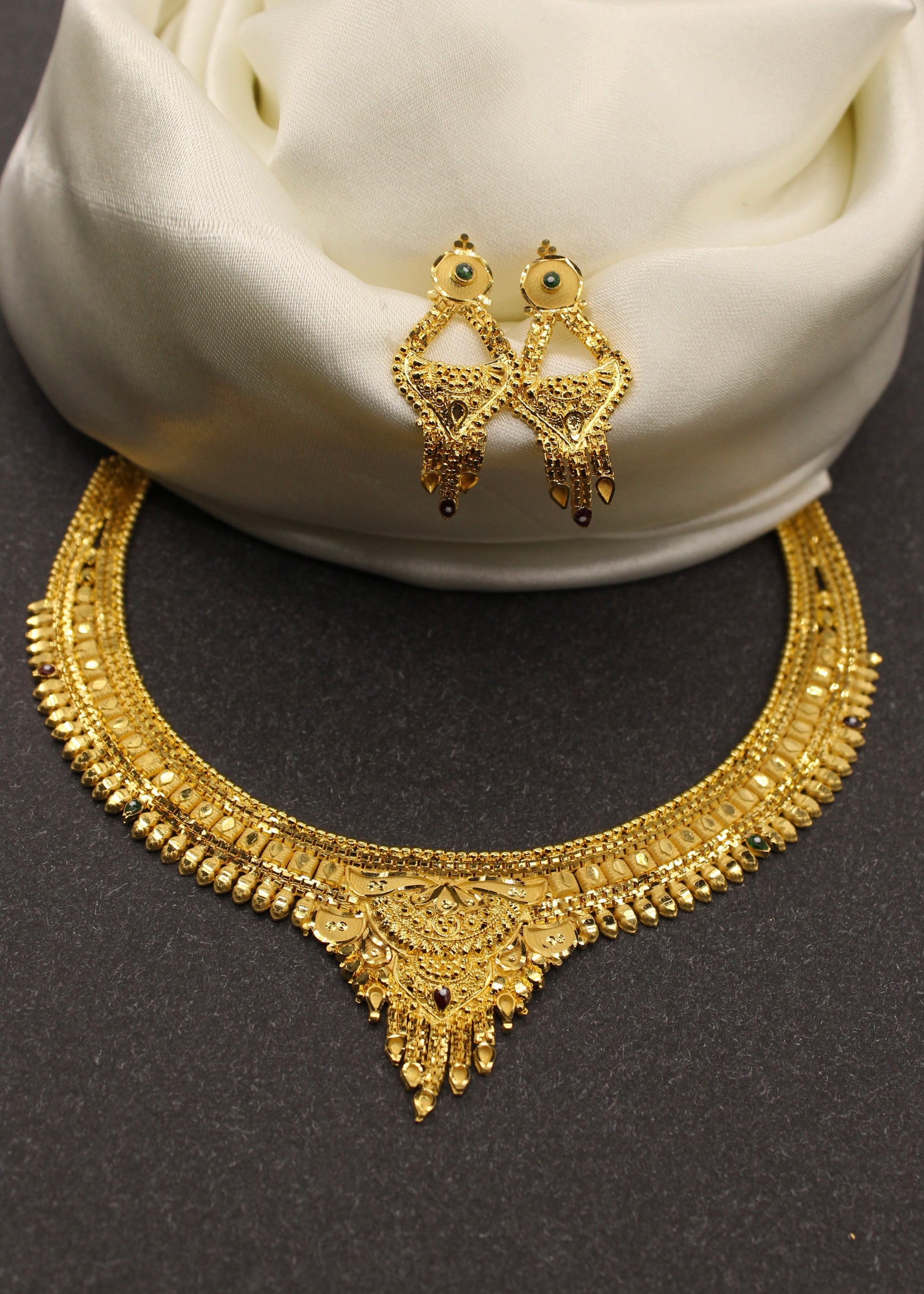 Simple yet very pretty designer necklace set from Sonchafa Jewellery will appeal to you at very first look. It shows flawless work and fashioned from gold finish metal. It has beautiful earrings for added attraction. It is long lasting and high in durability. The design of this necklace is unique and worth noticing.