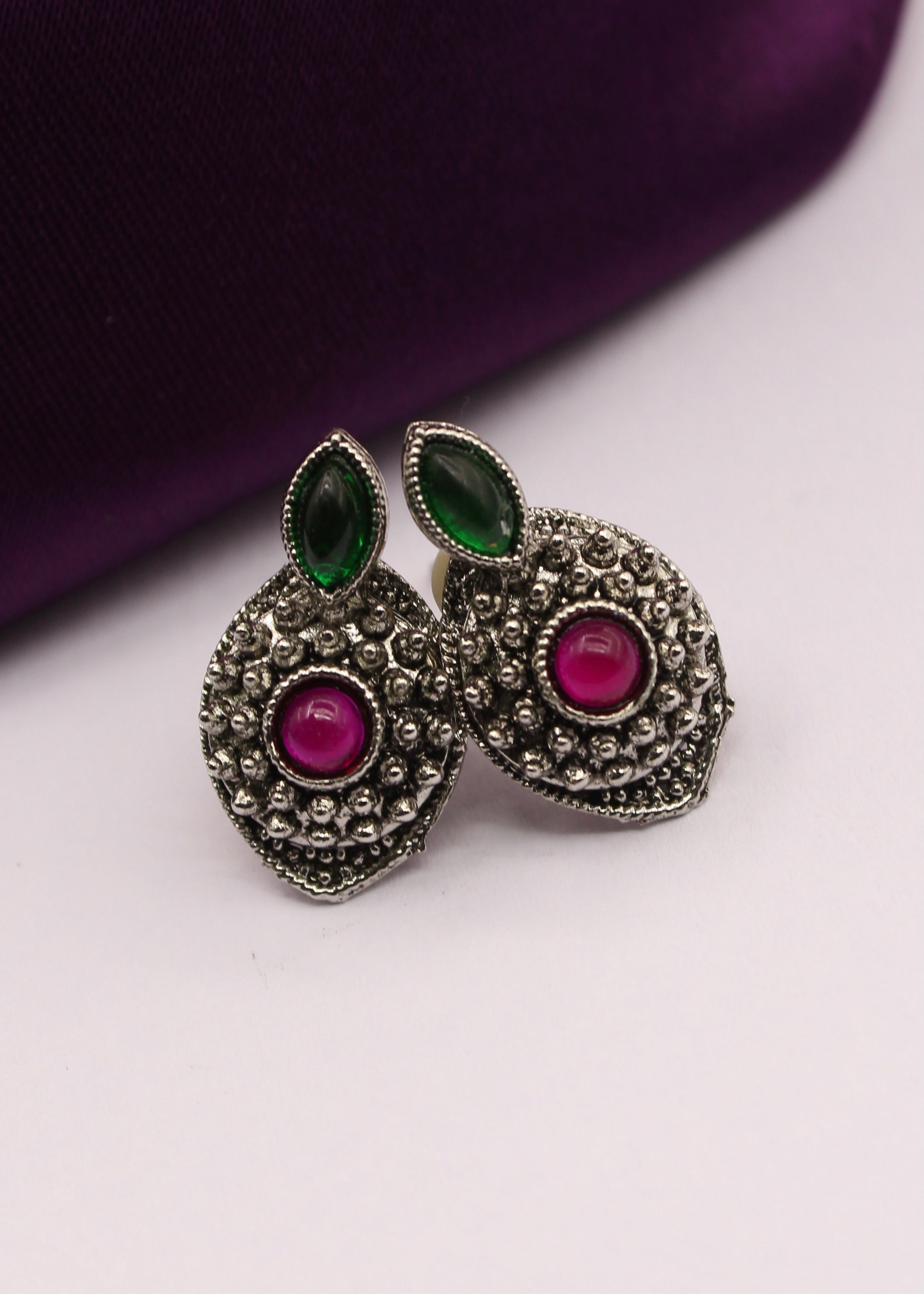 Oxidised tone beautiful earrings in very striking design will surely complete your maharashtrian look. Perfectly studded with pink-green colour stone along with Oxidised beads & from metal & are skin-friendly.
