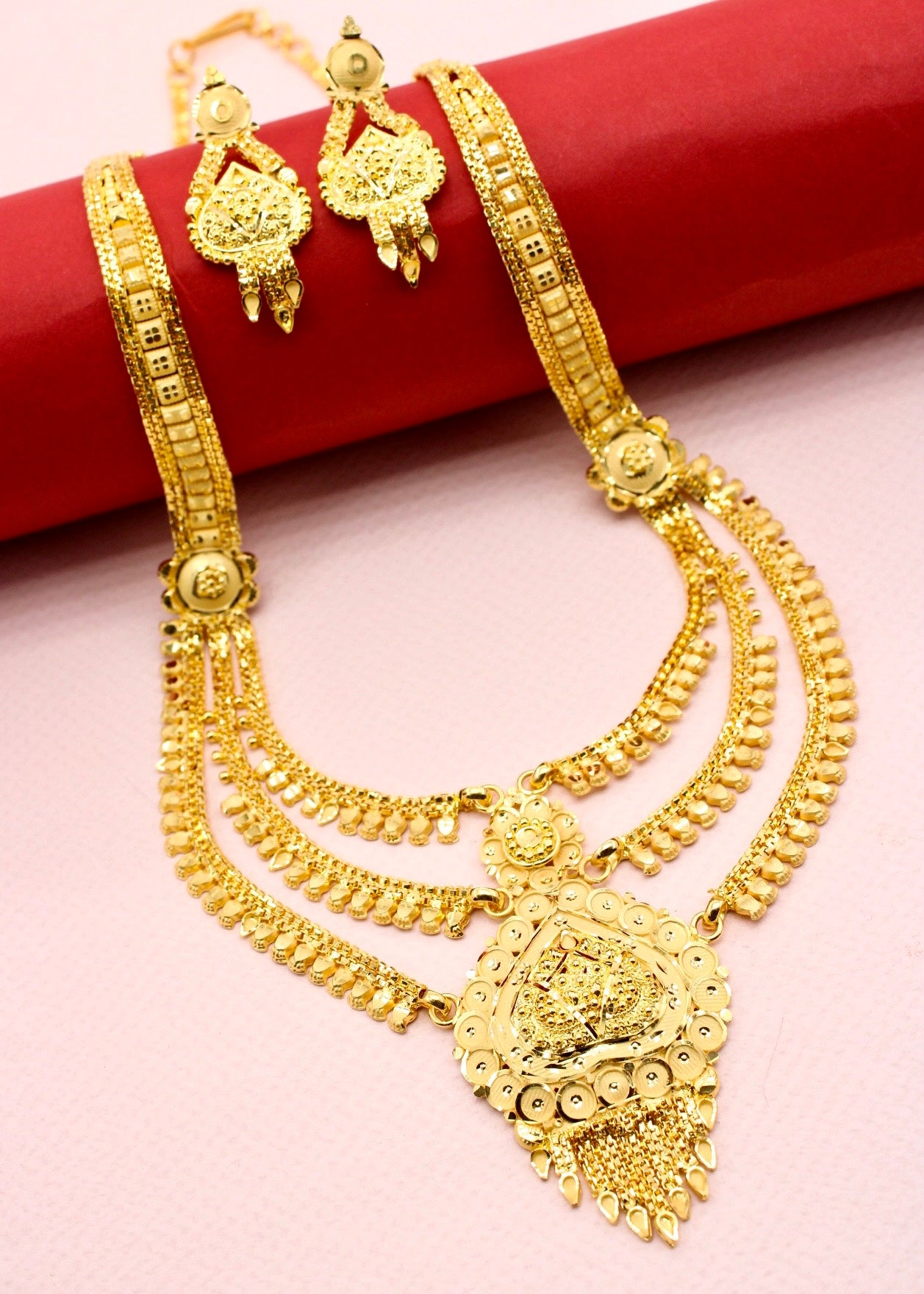 Beautifully latest gold finish necklace from Sonchafa Jewellery for stylish girls or women like you. The pendant intricate carving design on golden surface & made from 1 gram gold plated metal. This traditional jewellery set has wonderful golden droplets & ensures high durability.