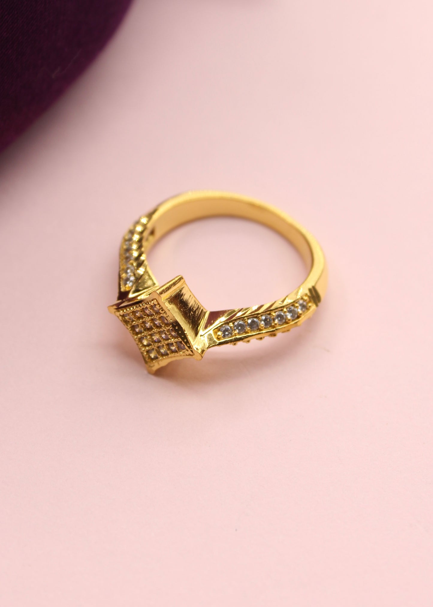 White stone designer gold plated finger ring for women by sonchafa Jewellery. These feature eye-pleasing intricate carving square design on metal surface. . These finger ring are encrusted with white stone and made from gold plated.