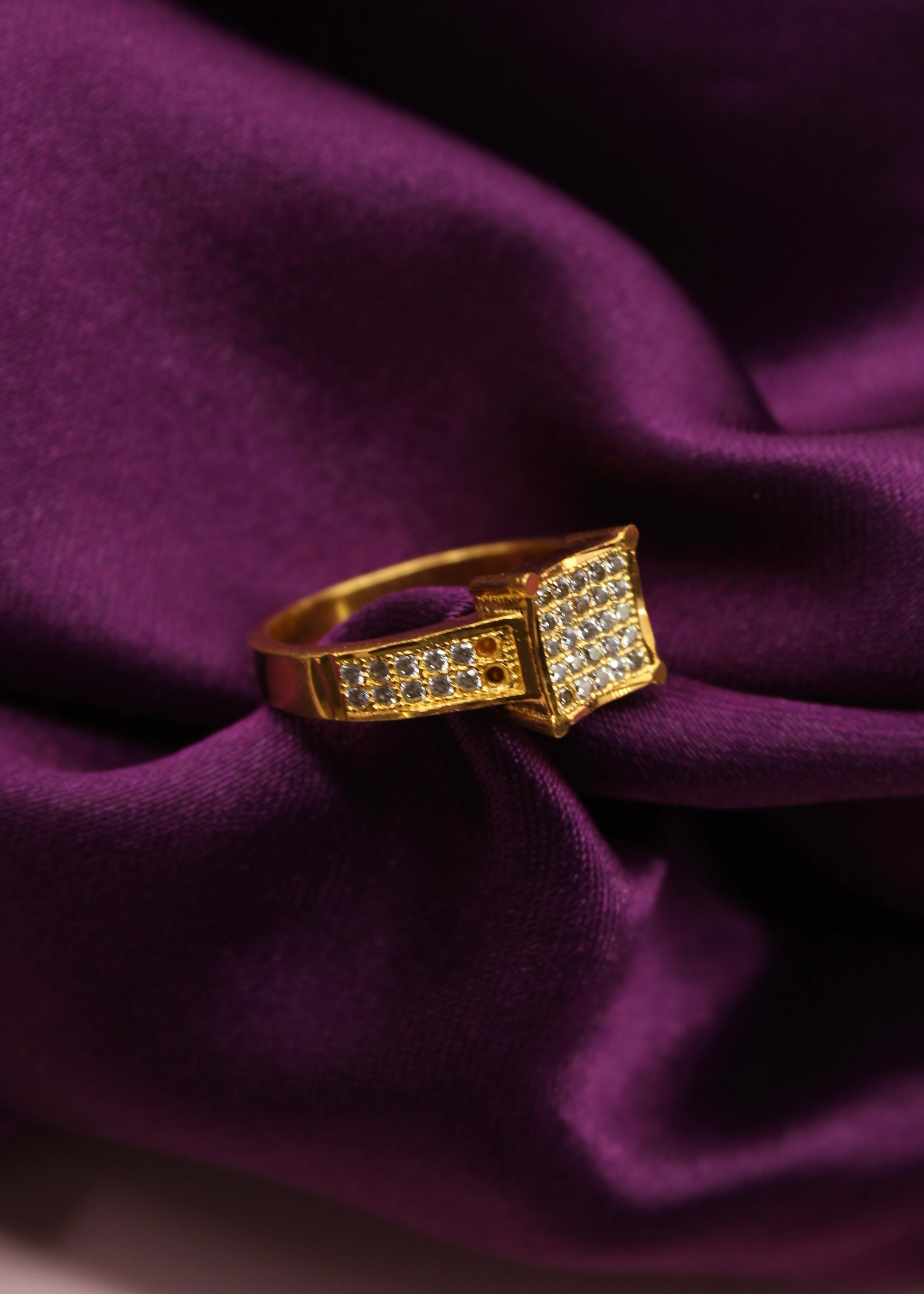 White stone designer gold plated finger ring for women by sonchafa Jewellery. These feature eye-pleasing intricate carving square design on metal surface. . These finger ring are encrusted with white stone and made from gold plated.