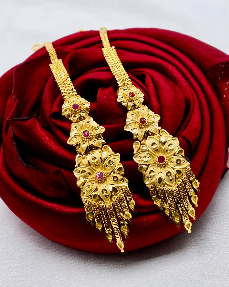 Create your different fashion statement by clubbing this pair of beautiful earrings with kanchain with your festive apparel. These are crafted from highly durable 1 gram gold plated metal. It is studded with pink stone along with classy floral design on golden metal surface. These stylish earrings will fetch lots of compliments from onlookers for your amazing choice.