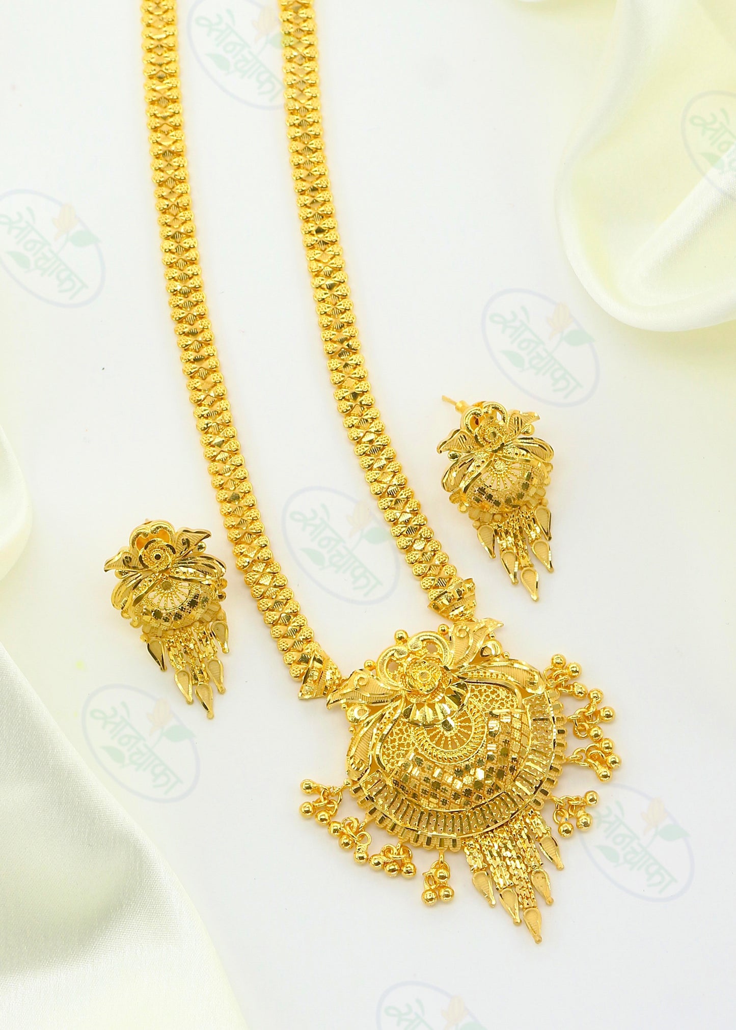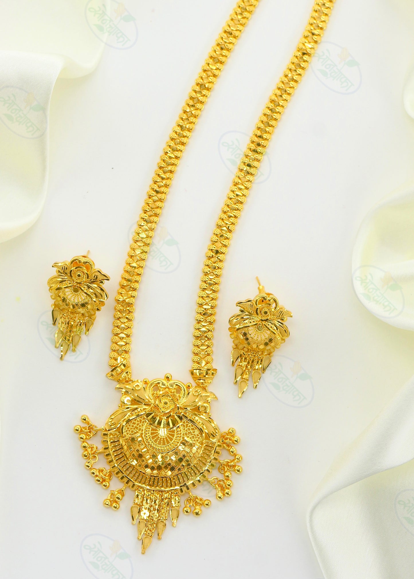Adorn your neckline with this traditional floret necklace which is perfect blend of elegance. It is studded with pink, green stone and wonderfully woven with attractive round shape design. This designer 1 gram gold plated necklace will fetch you lots of compliments from onlookers for your amazing choice.