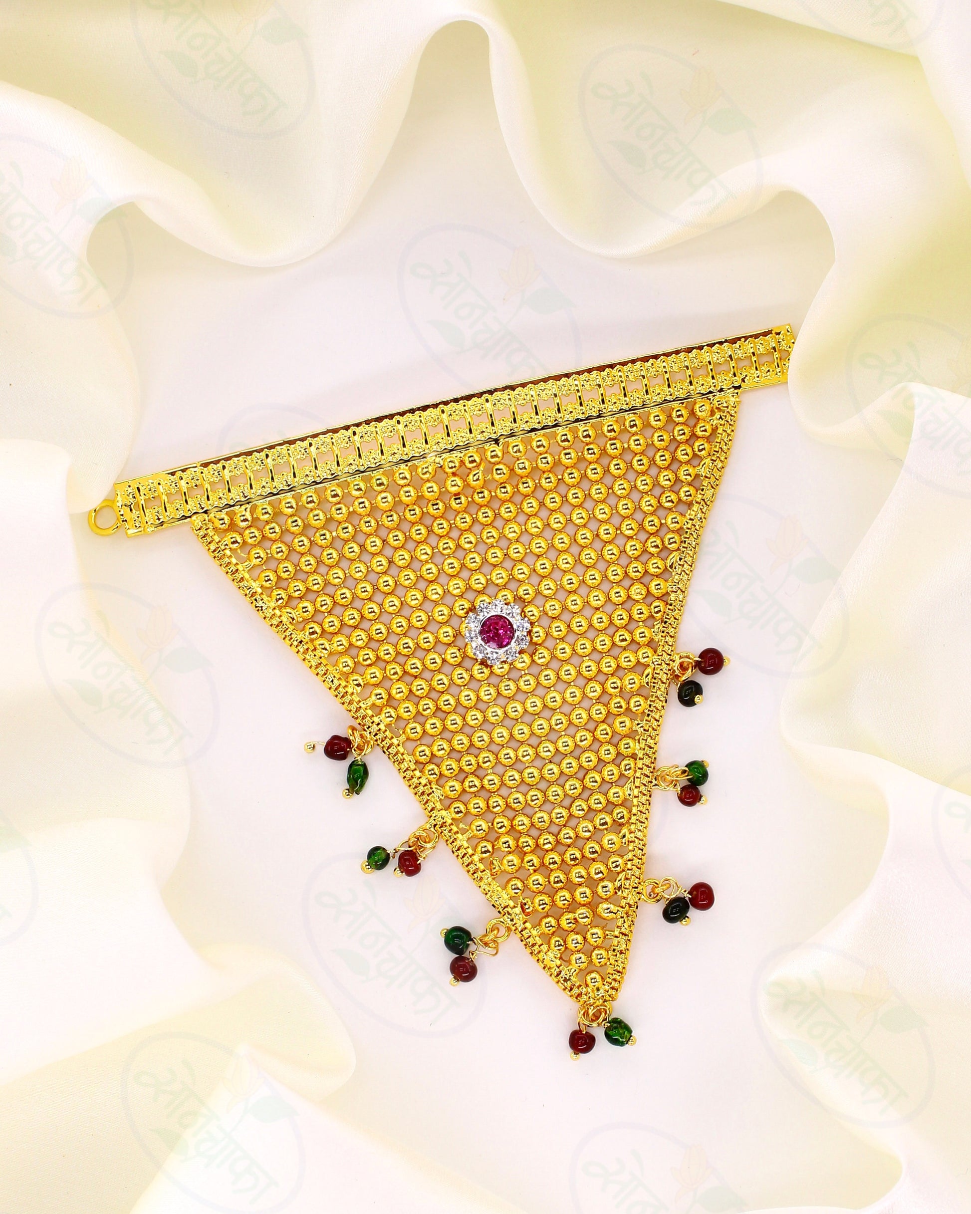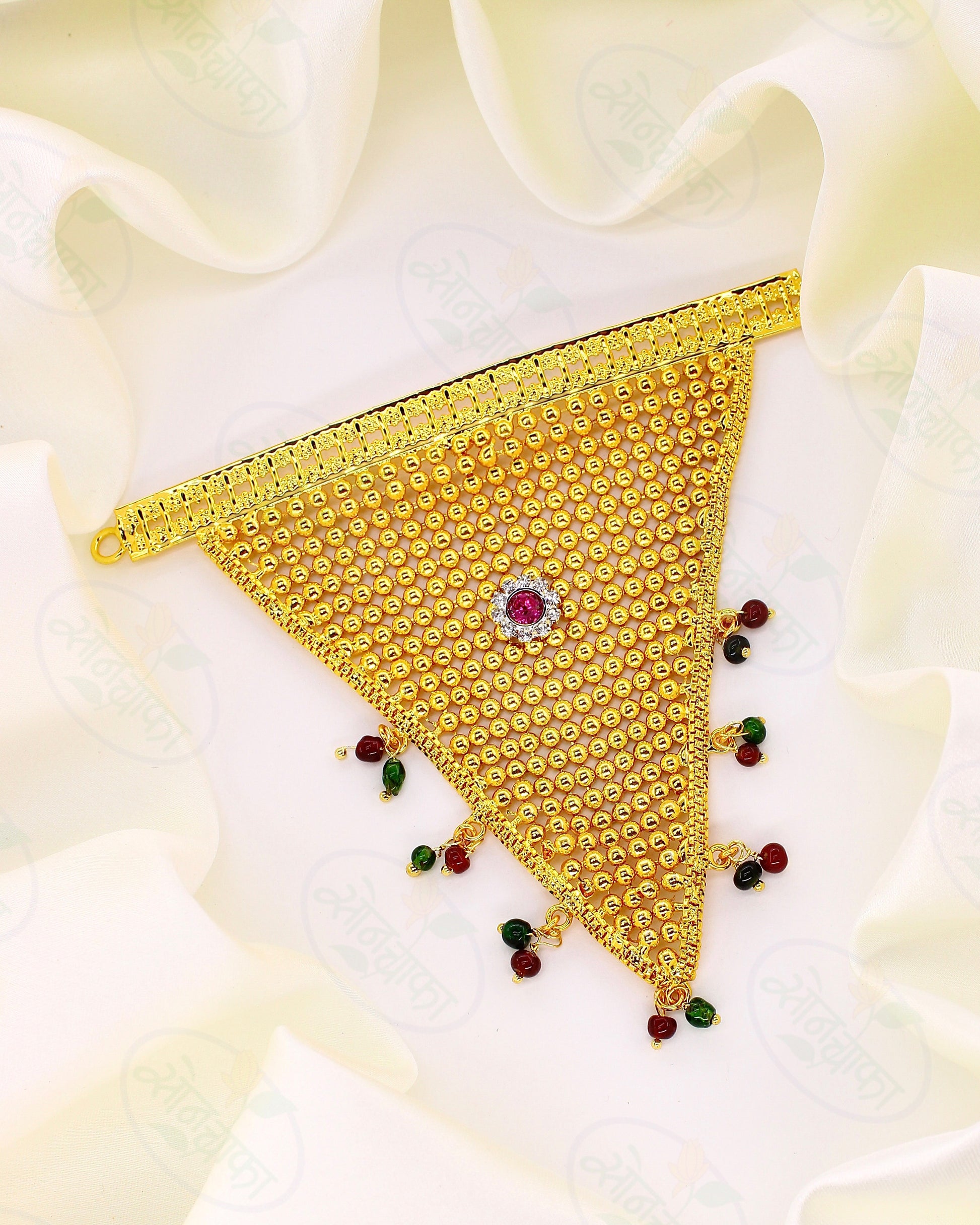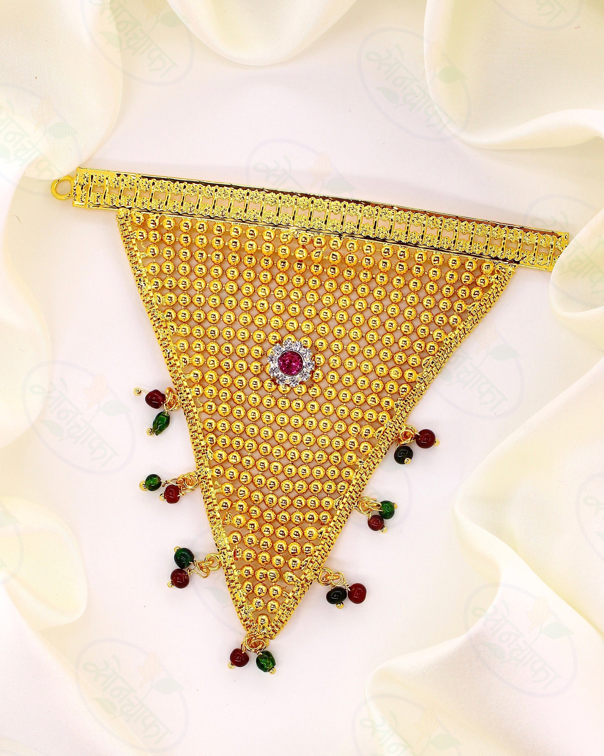 Beautifully designed this golden finished sond from Sonchafa Jewellery is best to decorate your Ganpati Murti. It is embedded with sparkling pink colour stone and has hanging droplets for added attraction. This Ganpati Sond ornament is made from golden finished metal and ensures high durability.