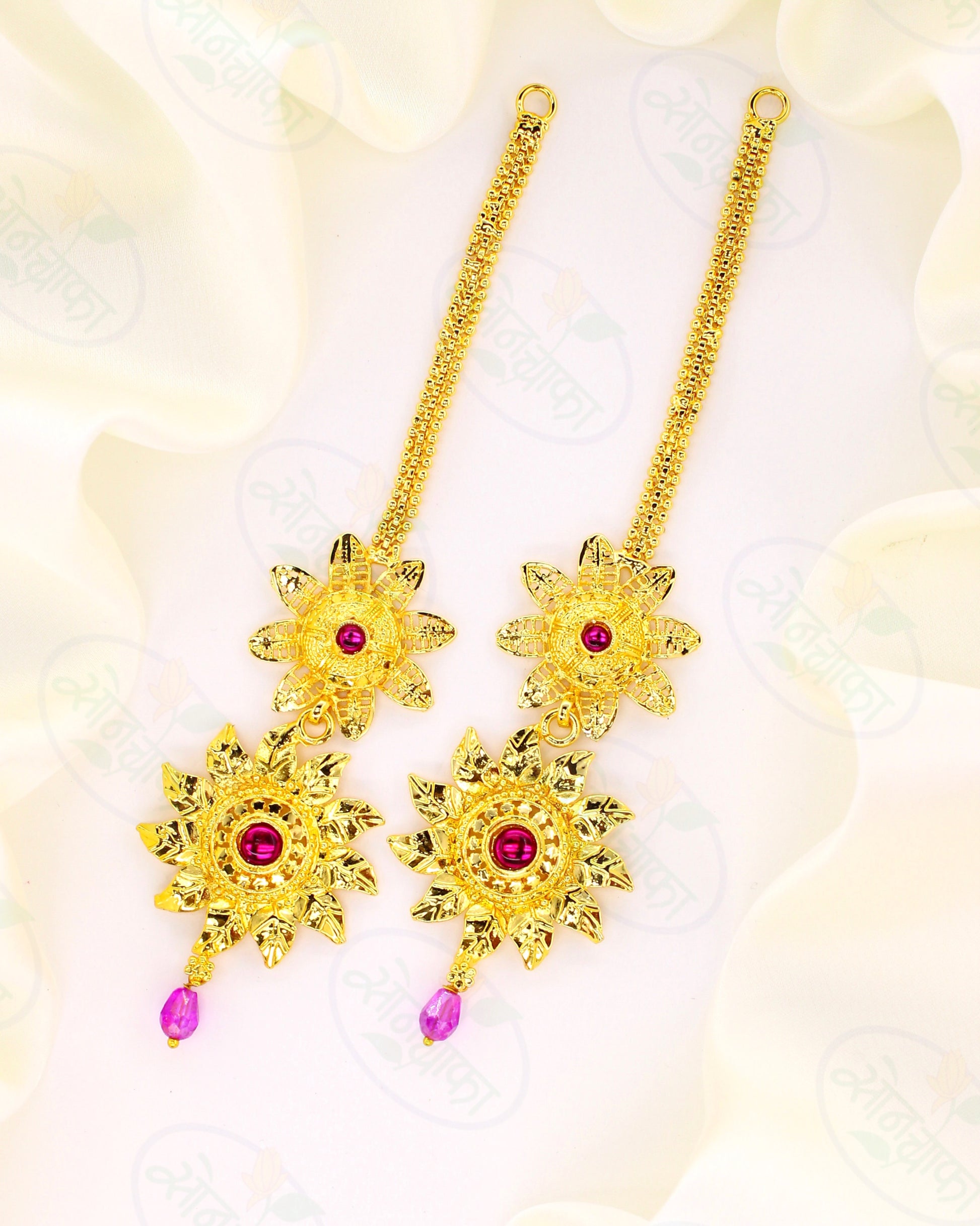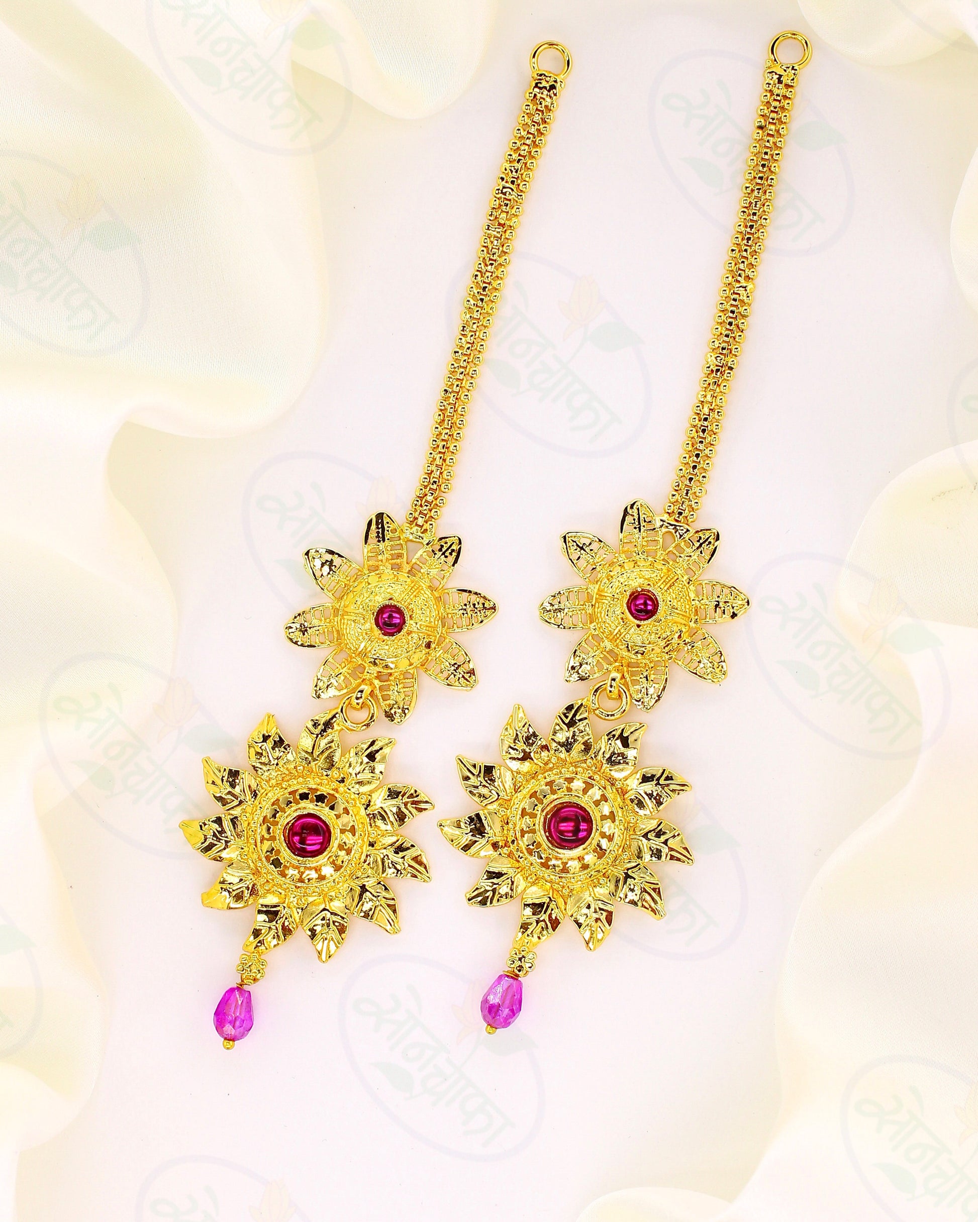 Have a look at this floret designer Ganpati Kaan for your Ganesha decoration. They feature eye-pleasing peacock design along with flawless mina work. These Ganpati kaan are fashioned from golden finish metal and is perfect pick for your Ganpati murti.