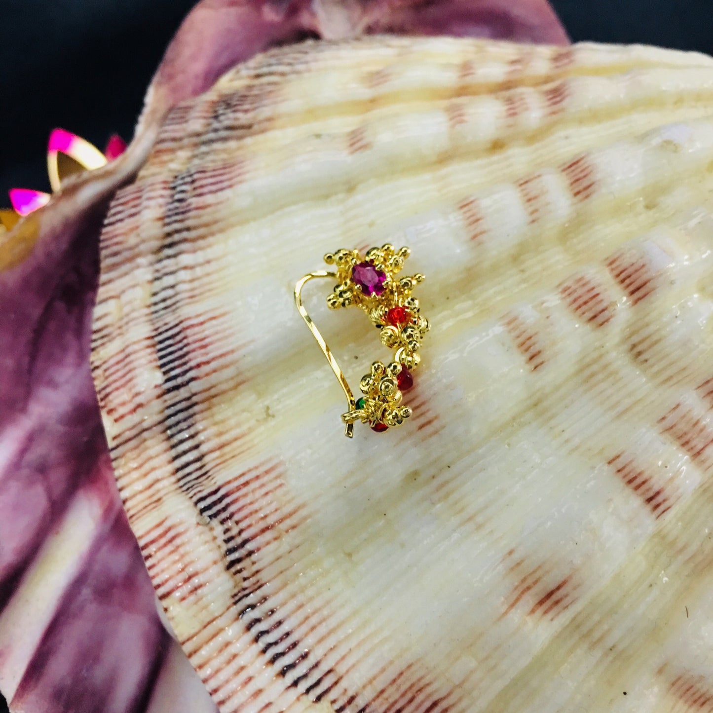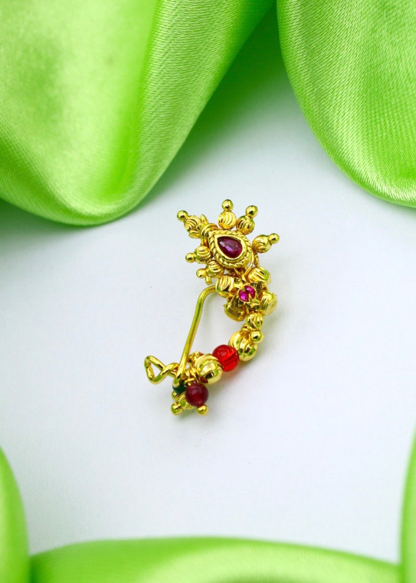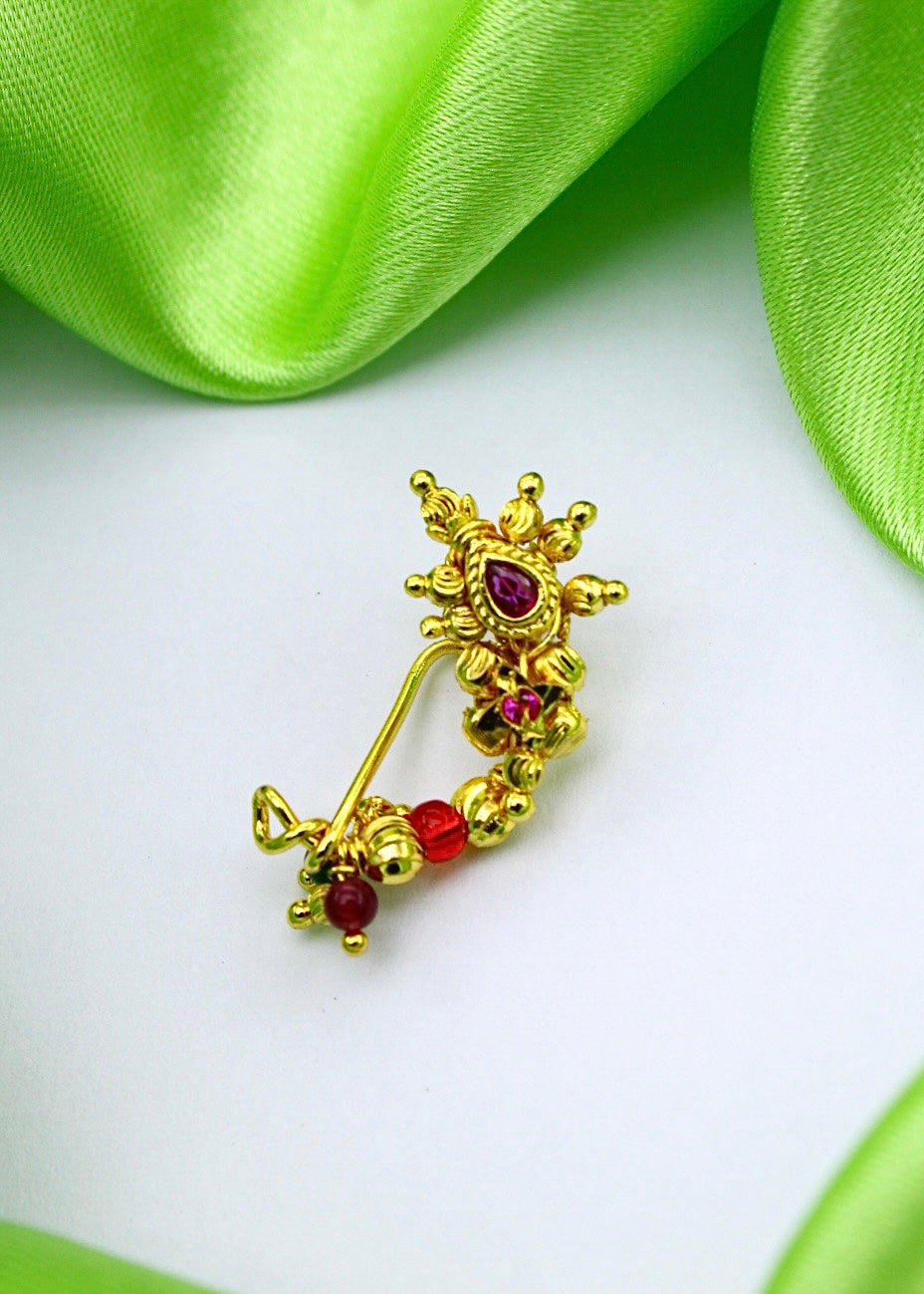 Look absolutely gorgeous by clubbing this golden colour beautiful Maharashtrian nath with your paithani saree. It is studded with sparkling pink colour stones and made with golden finish metal. It is easy to wear as it is piercing required nath.