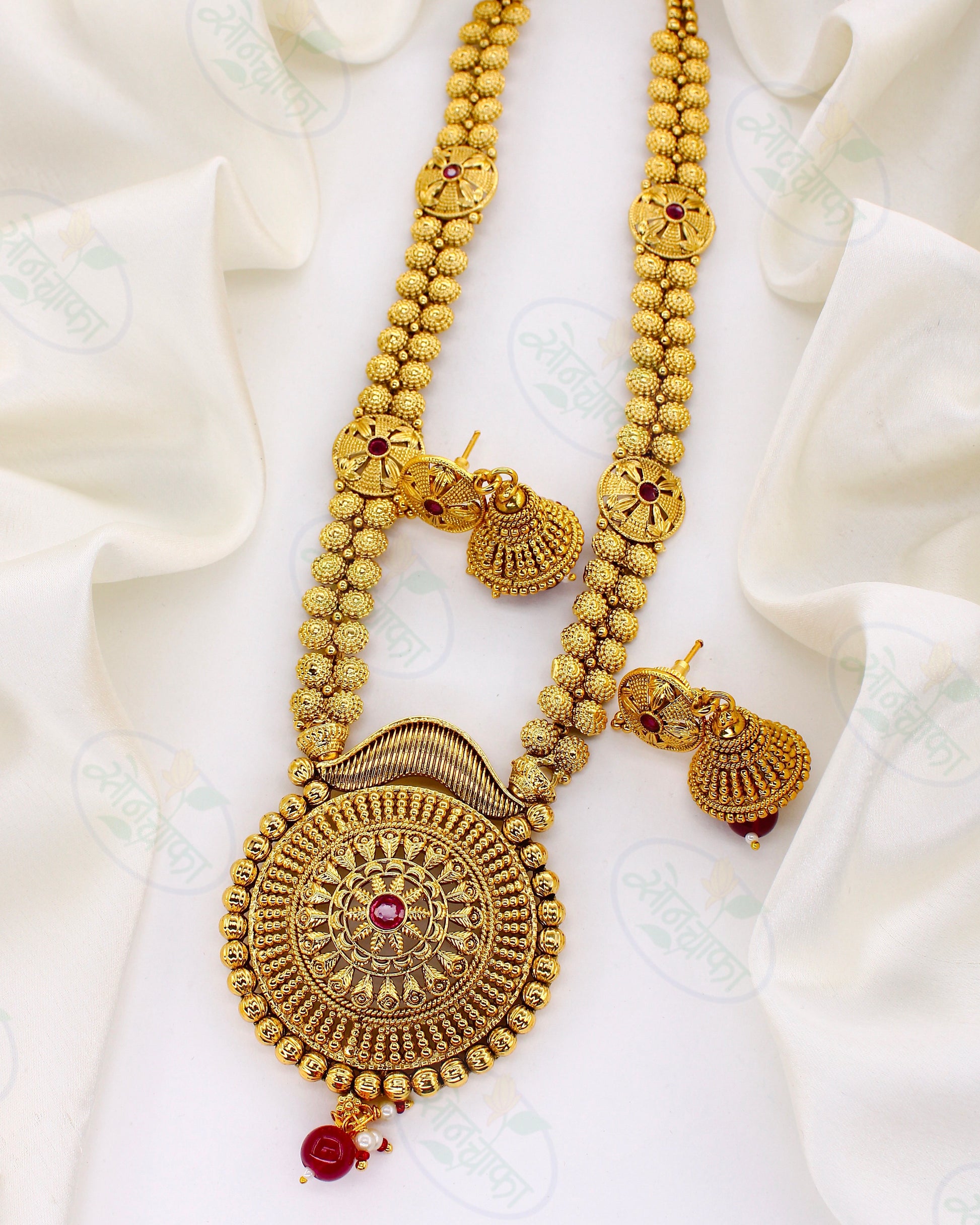 Beautifully designed this traditional antique necklace set from Sonchafa Jewellery is something which will make you look outstanding. This appealing necklace set is fashioned from golden finish metal. This designer necklace set has pearl bead droplet for added attraction.