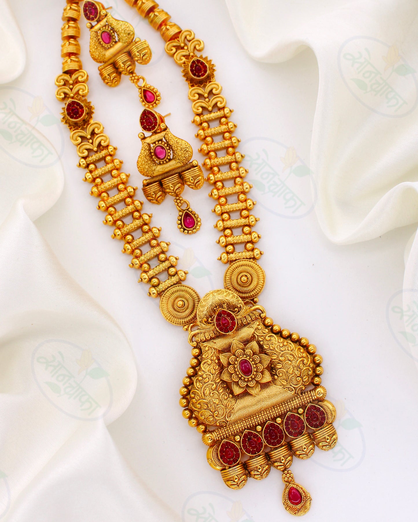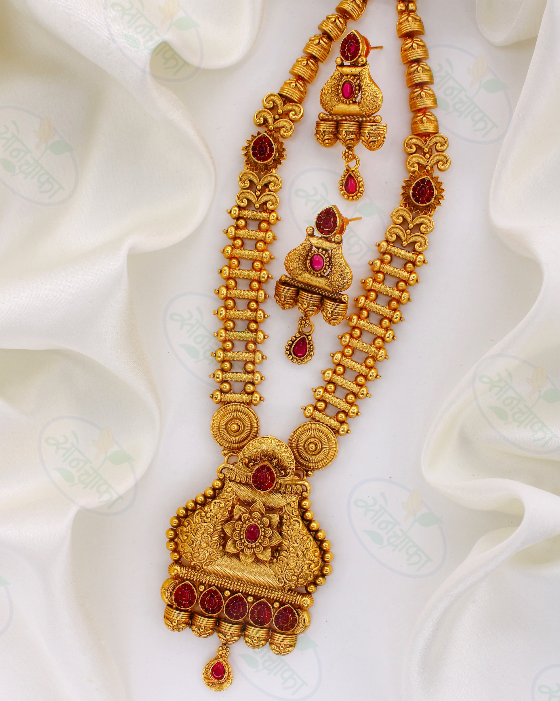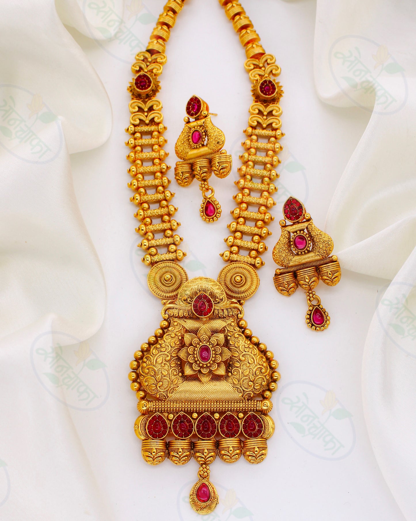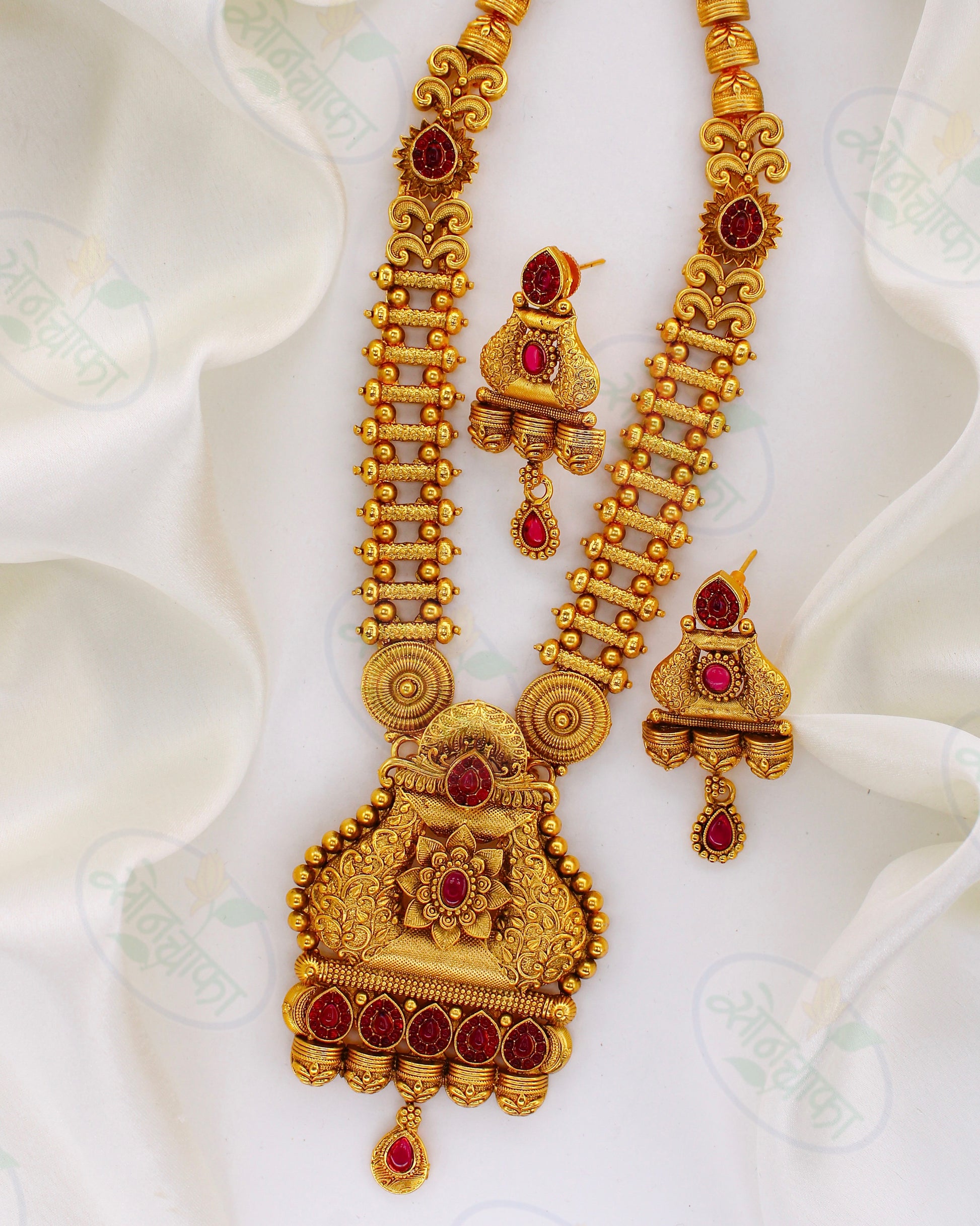 Have looking Rajwadi jewellery online for perfect match your trendy look from Sonchafa Jewellery. This necklace set is styled with studded pink stone along with carving flower design on metal surface & made from antique gold finish metal. This appealing necklace decorated with dangling red ball for added attraction.