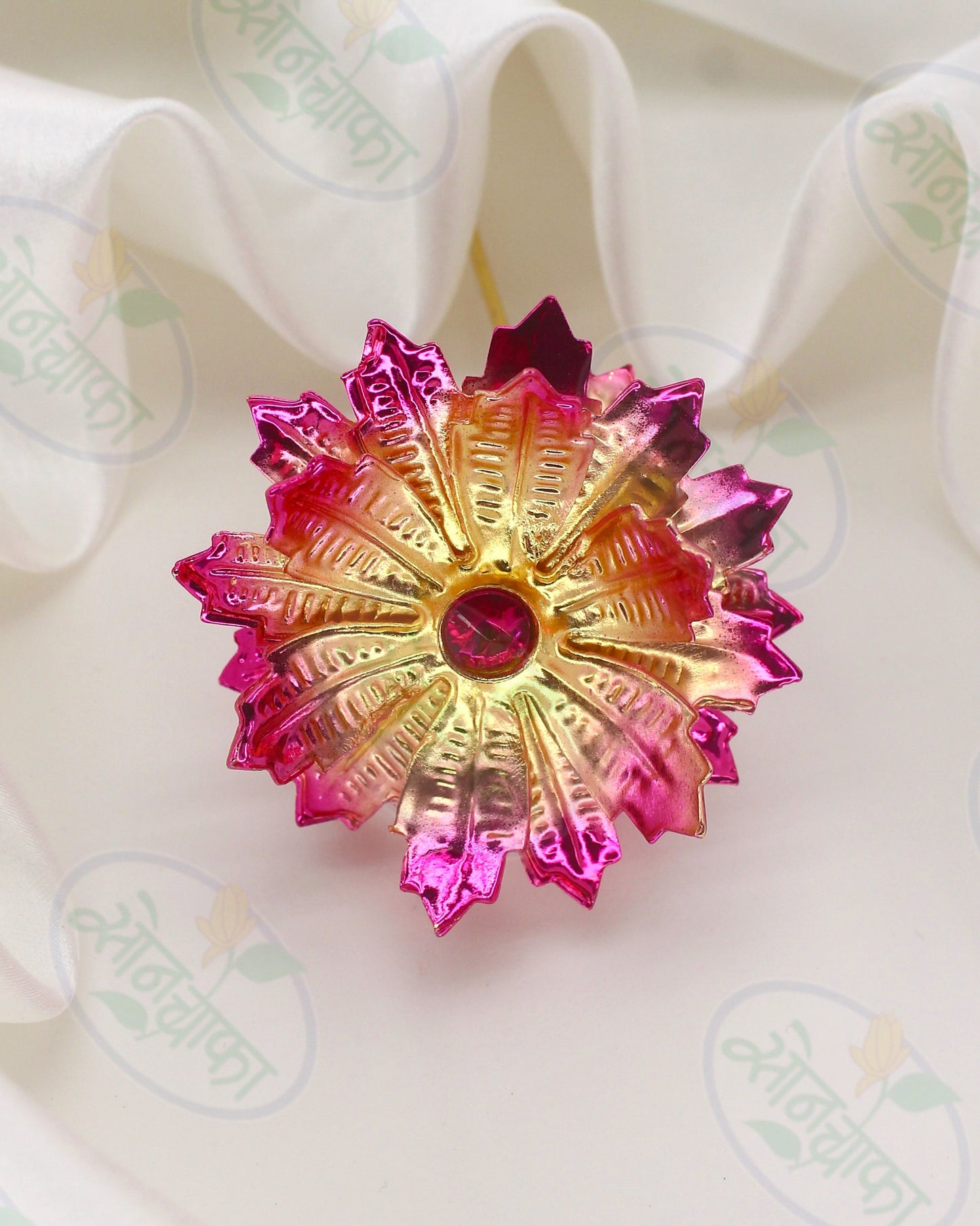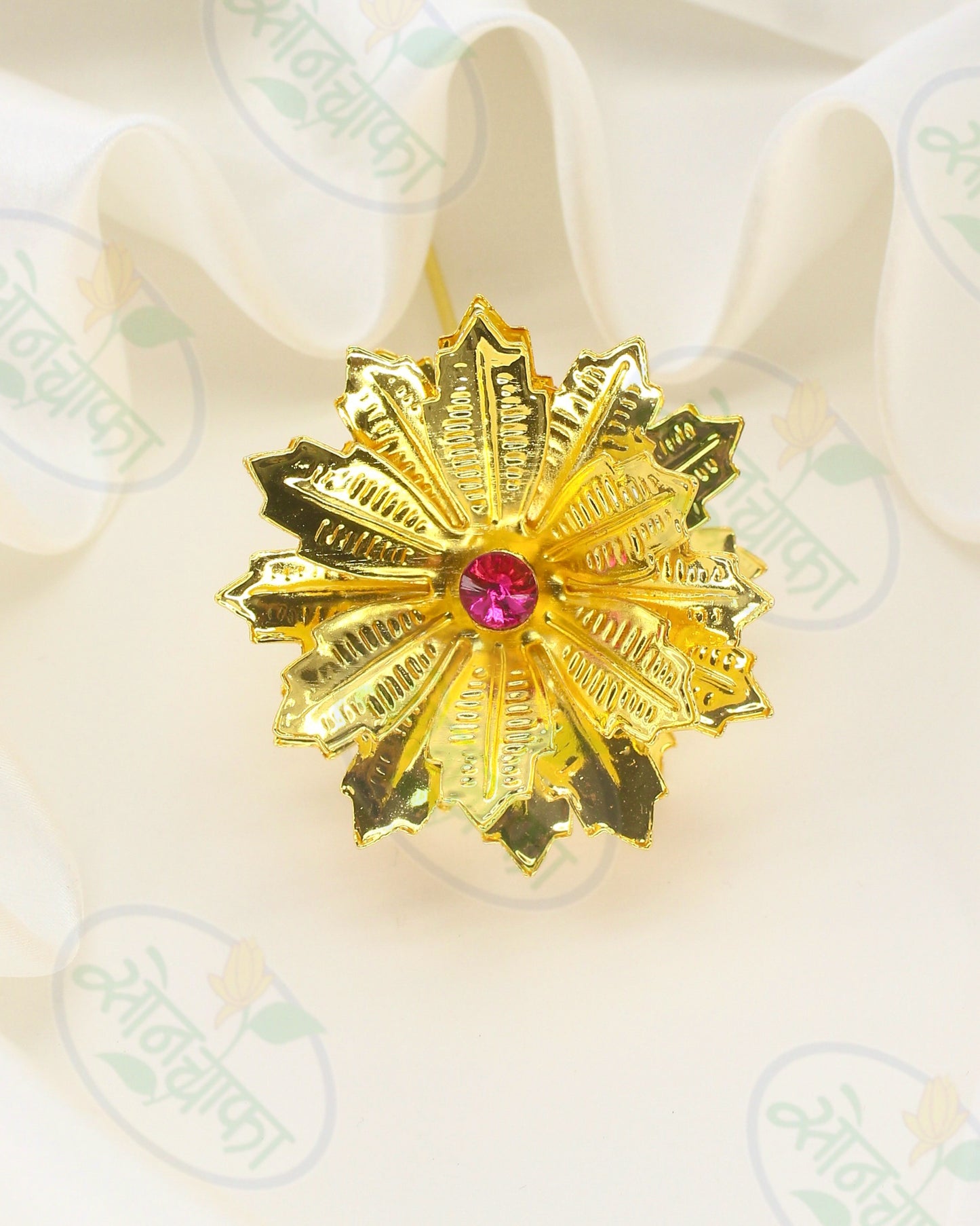 Sonchafa Jewellery offers this Kamal phool for your Ganpati decoration. This Kamal phool is fashioned from golden finish metal and ensures high durability. It is studded with pink stone for more attraction.