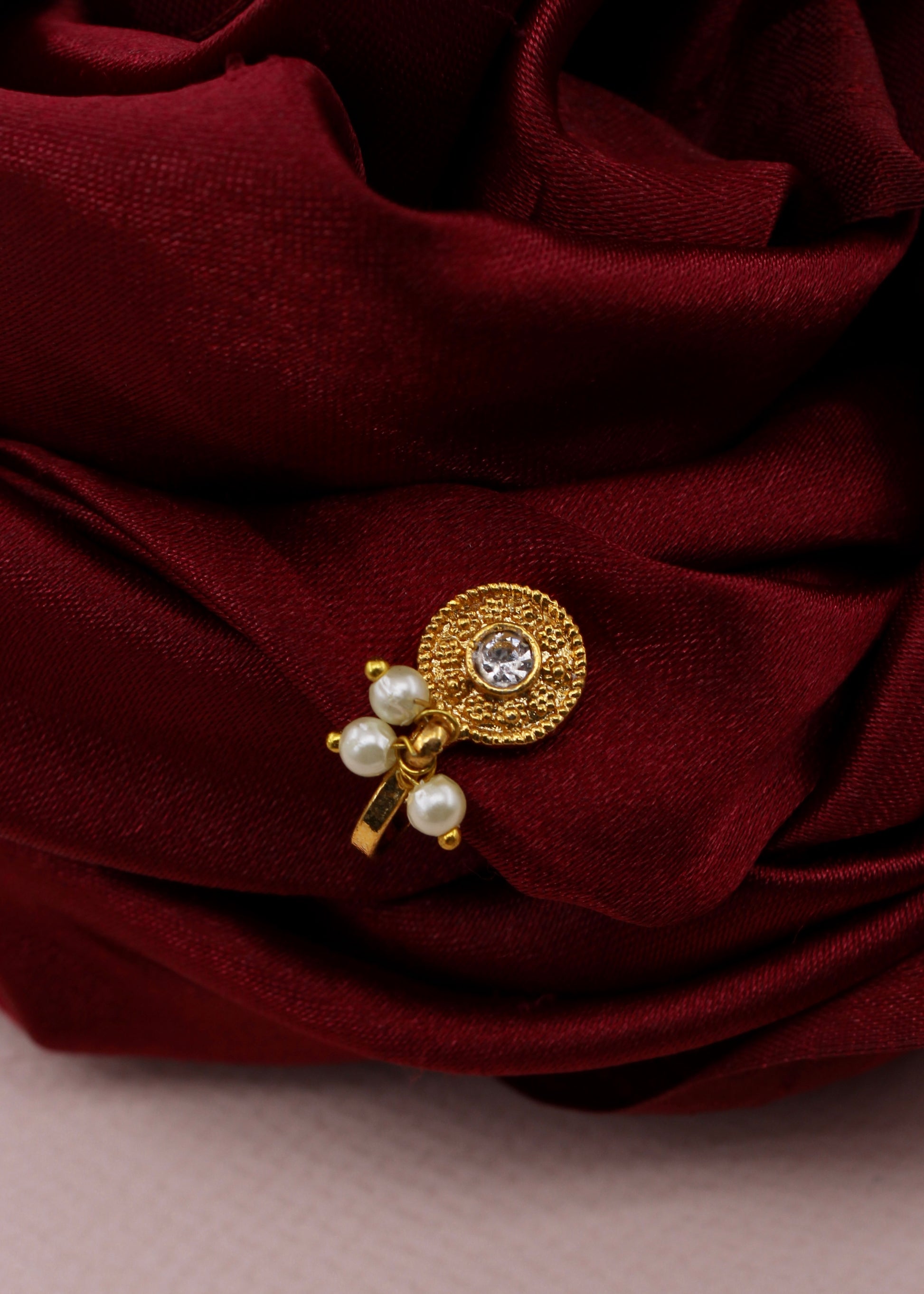 Sonchafa Jewellery brings to you this adorable round shape nose pin for stylish traditional look. It is encrusted with pink, white stones along with dangling beads and crafted from matte golden finish metal. This nose pin is superior in quality and will retain its shine for years to come.