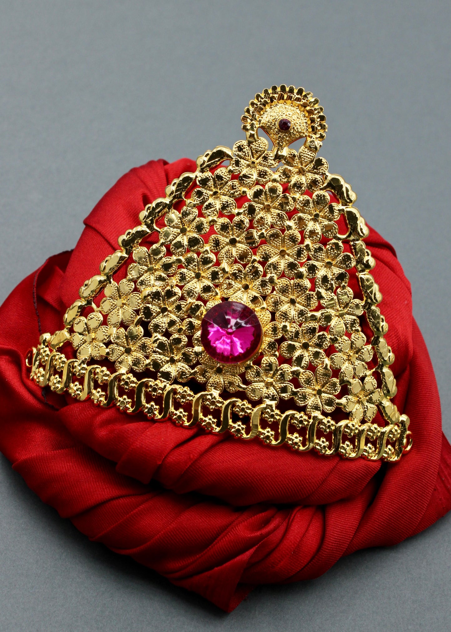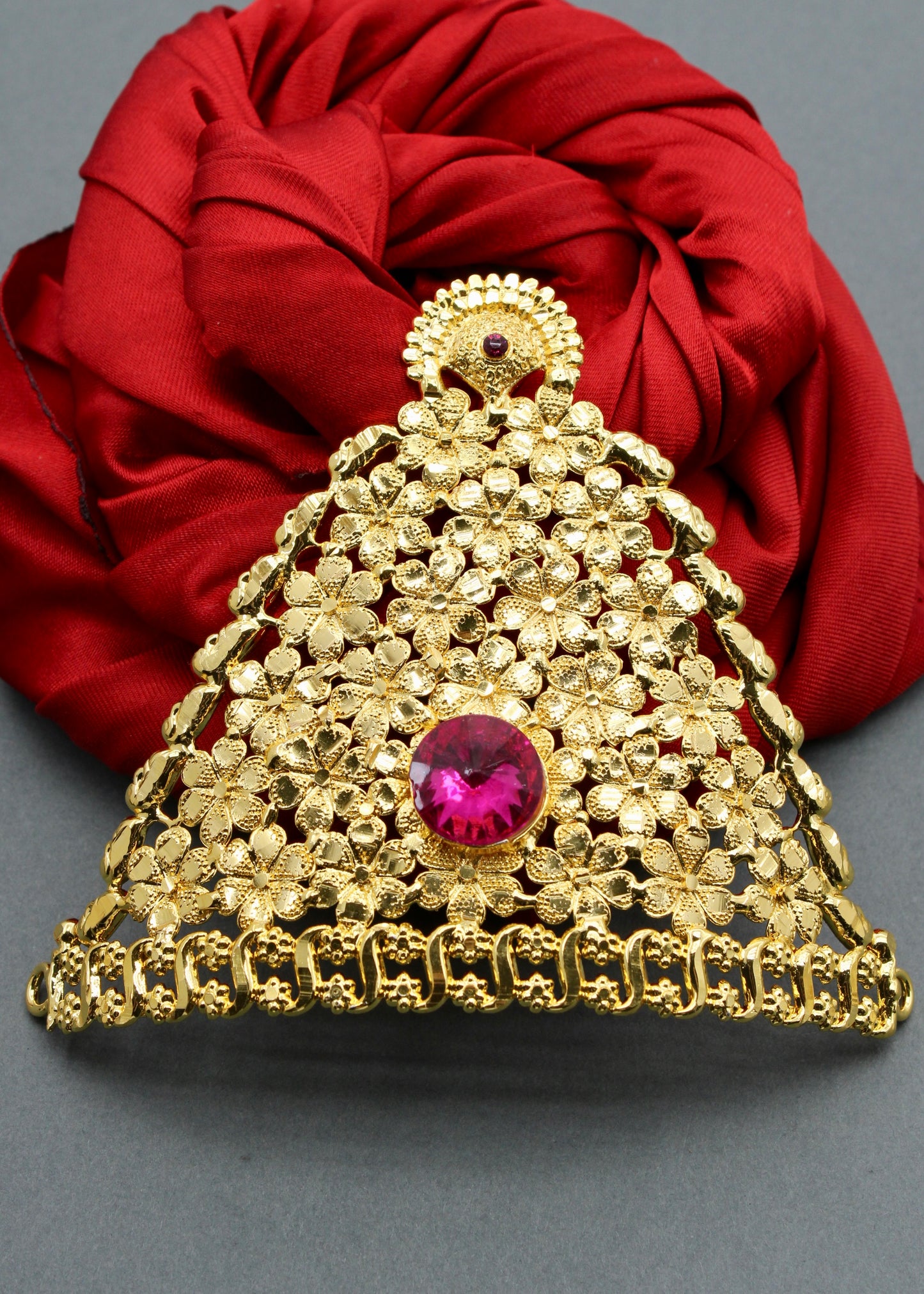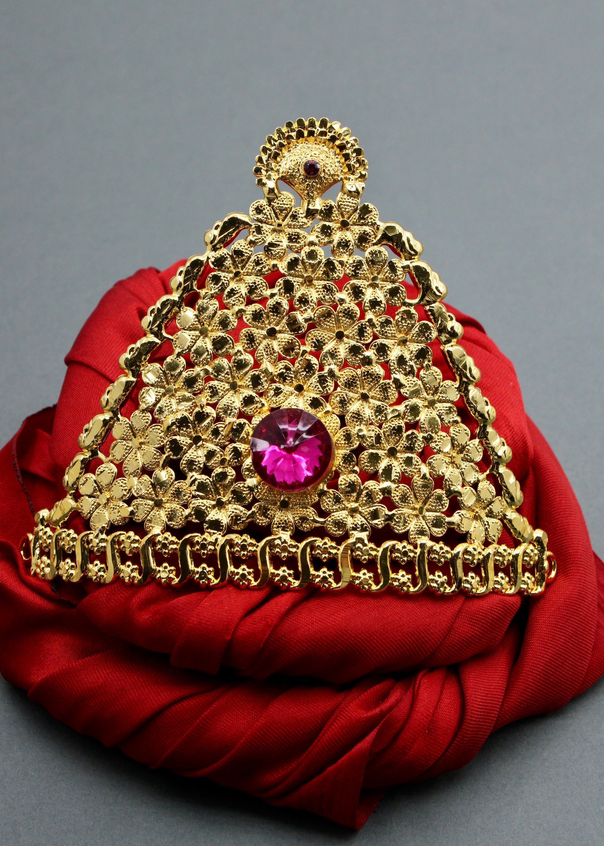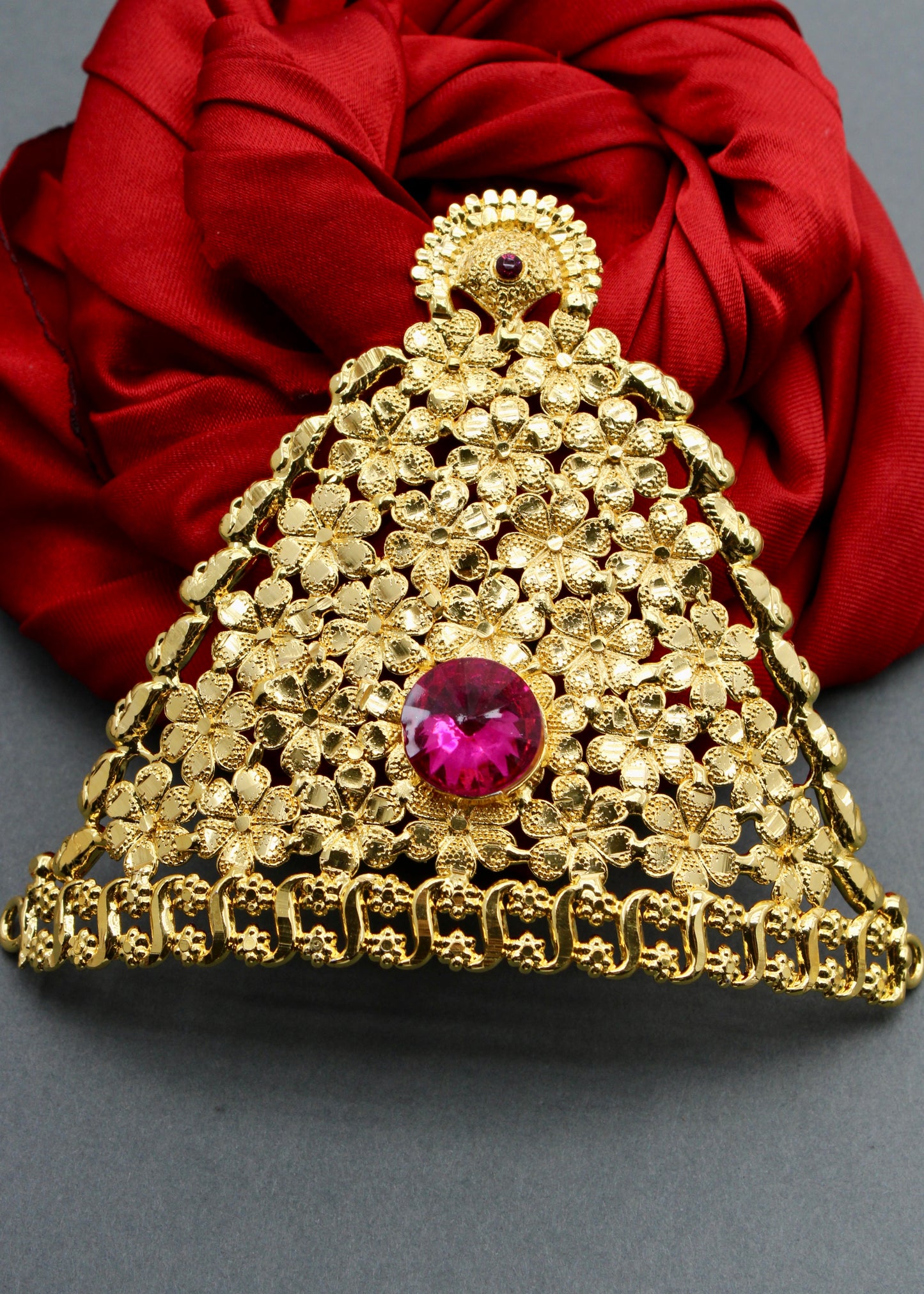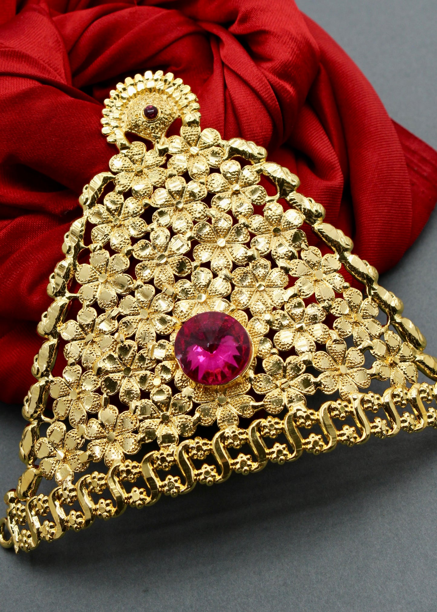 Specially designed for your Ganesha this floral Ganpati mukut from Sonchafa Jewellers. This piece of jewellery is very much adorable and made from golden finish metal. It is studded with glossy pink stone at middle for attractive look. It has an adjustable back dori.