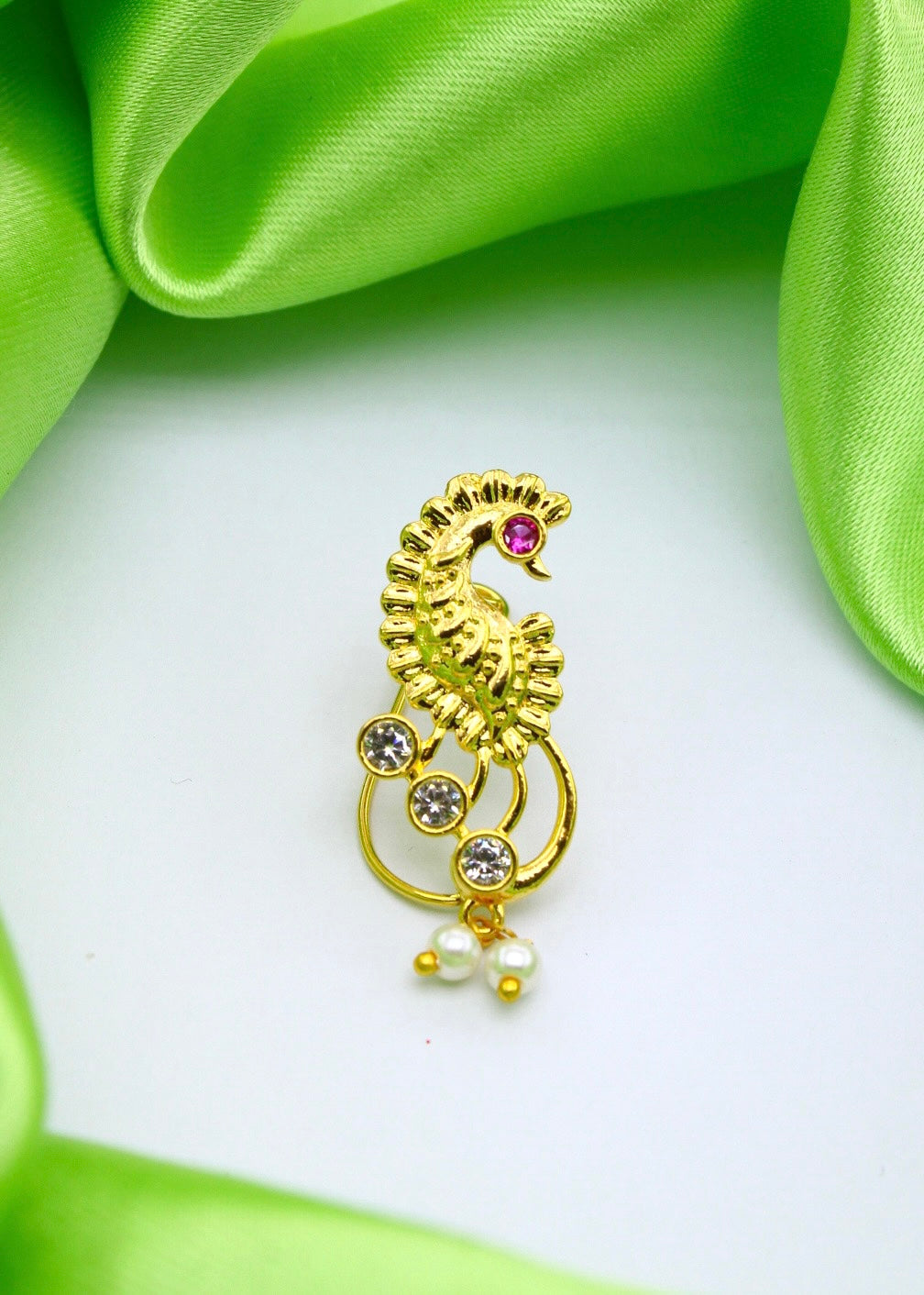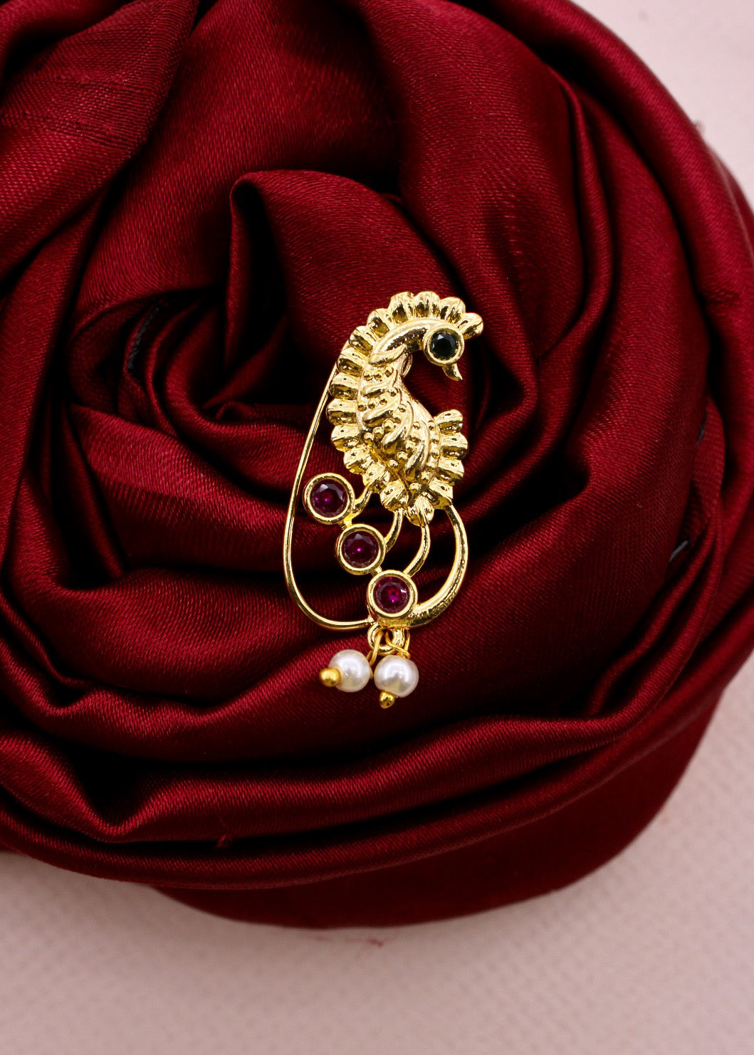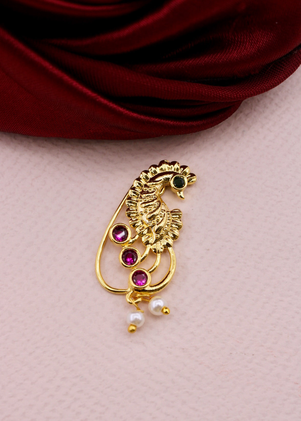 Look stylish by adorning this peacock inspiring nath from Sonchafa Jewellers. It is made from highly durable antique golden finish metal and ensures skin-friendliness. This nath is studded with pink, green, white stone along with good quality pearls. This beautiful nath is easy to wear as it press on.