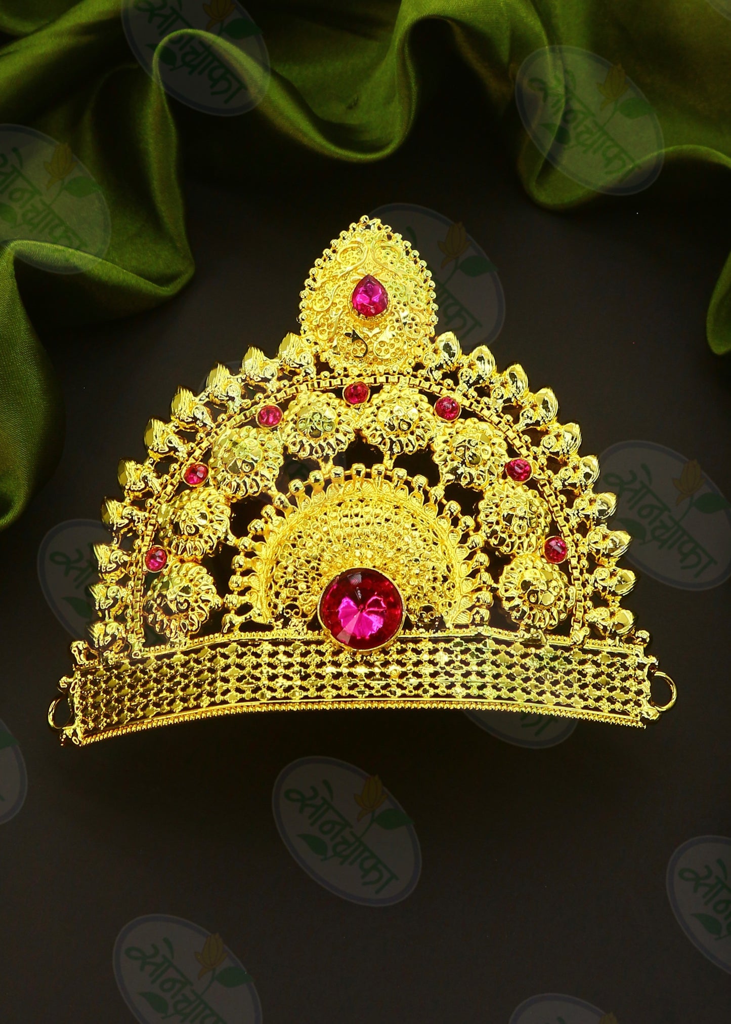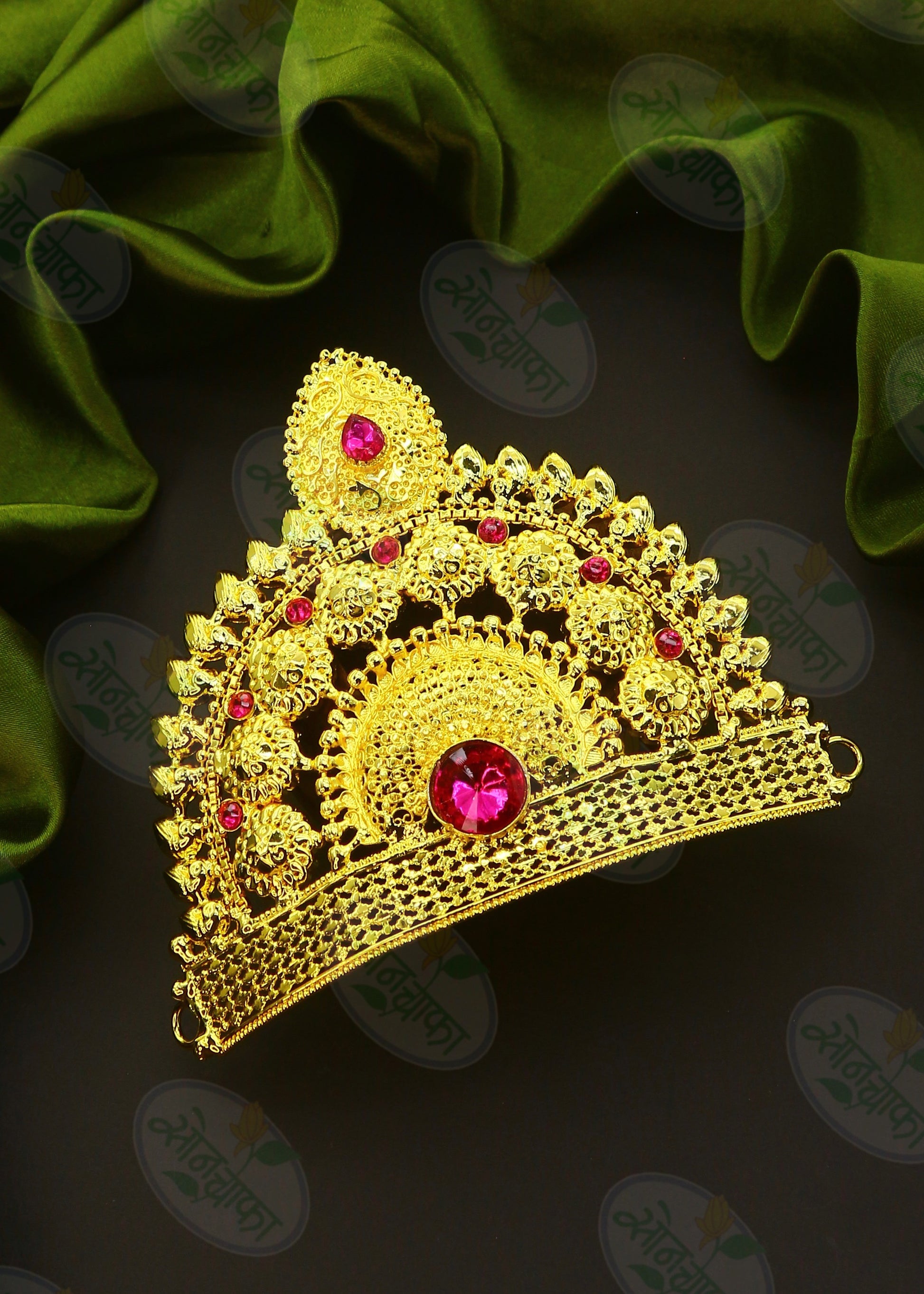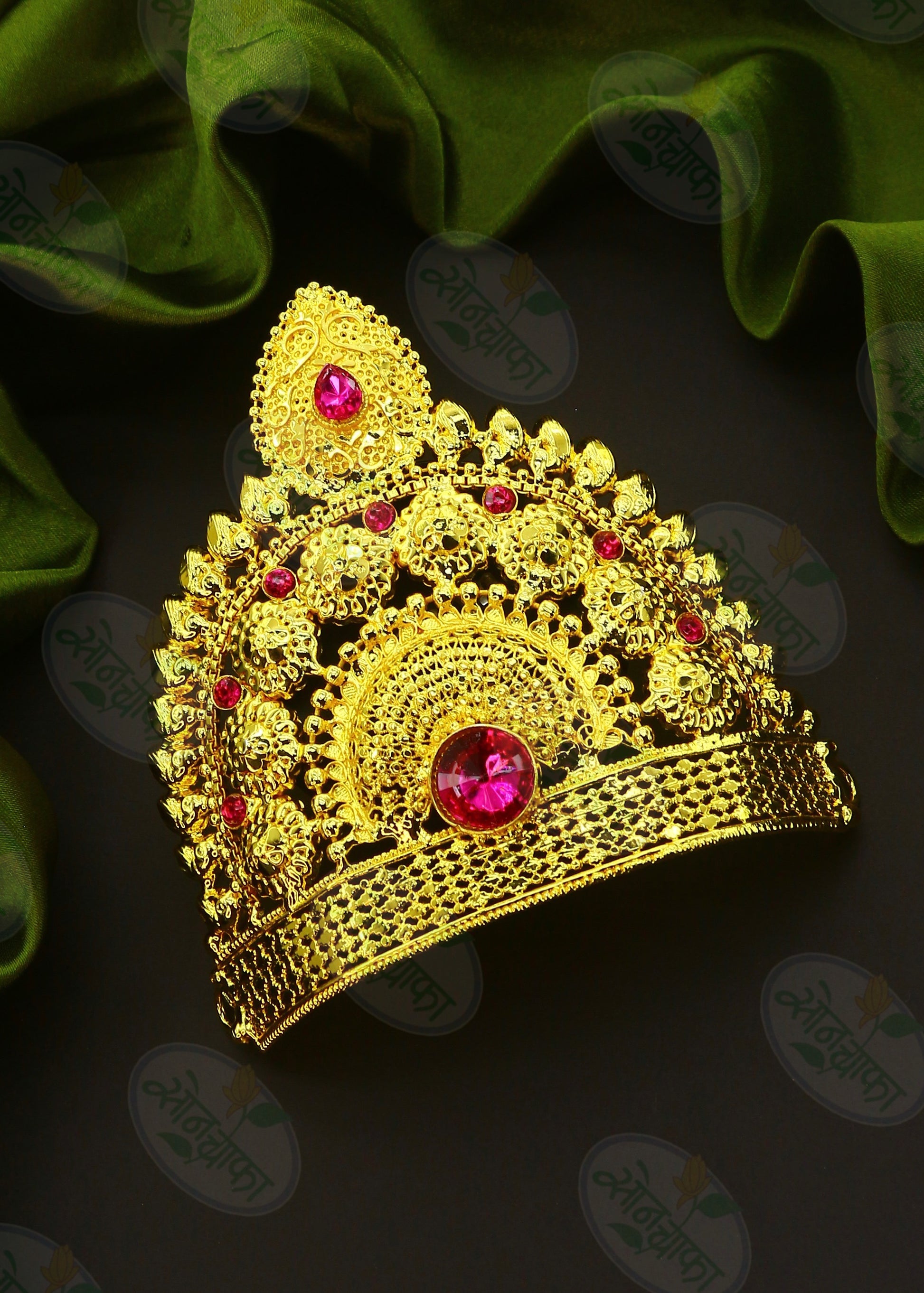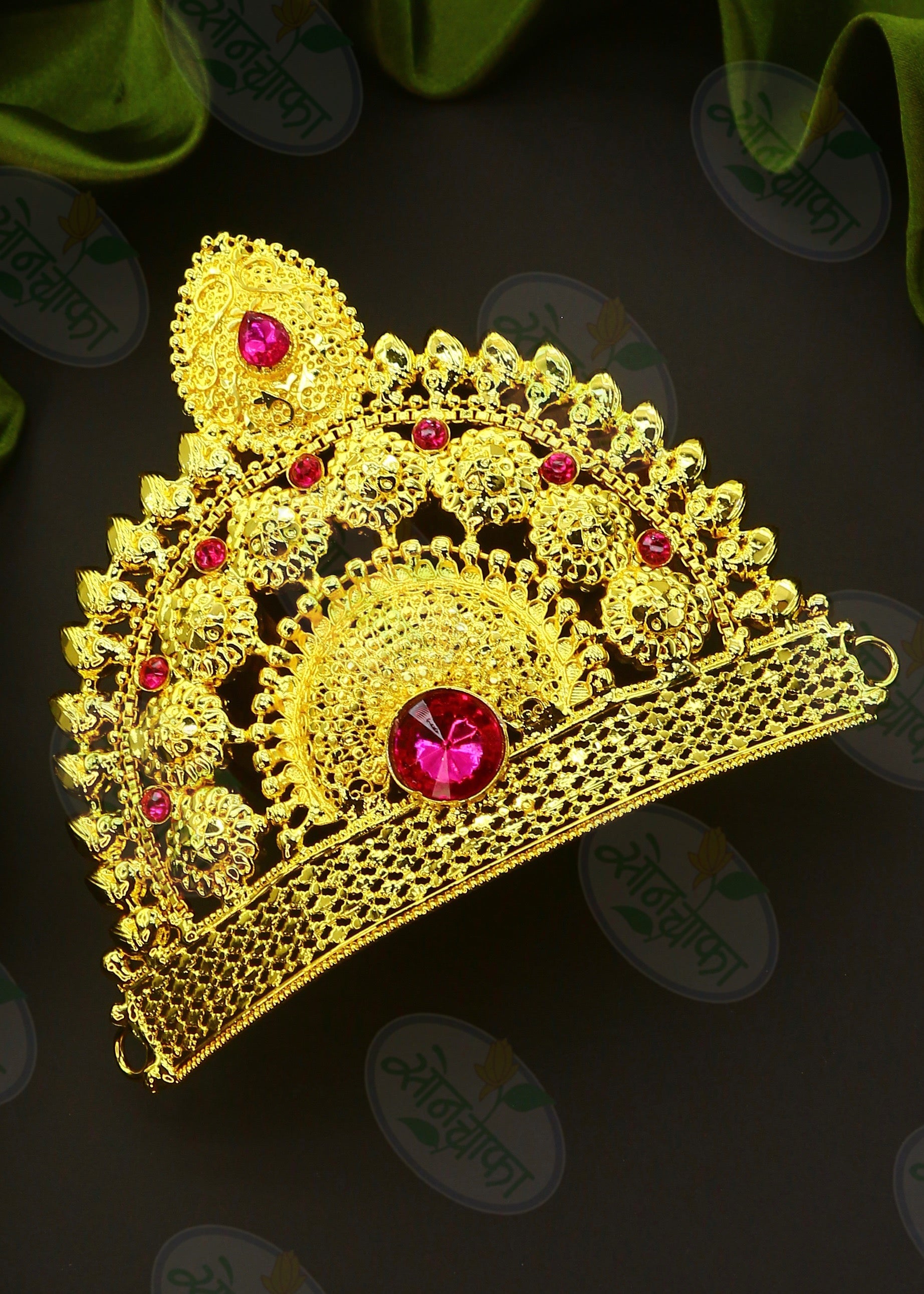 Specially designed for your Ganesha this floral Ganpati mukut from Sonchafa Jewellers. This piece of jewellery is very much adorable and made from golden finish metal. It is studded with glossy pink stone at middle for attractive look. It has has an adjustable back dori.