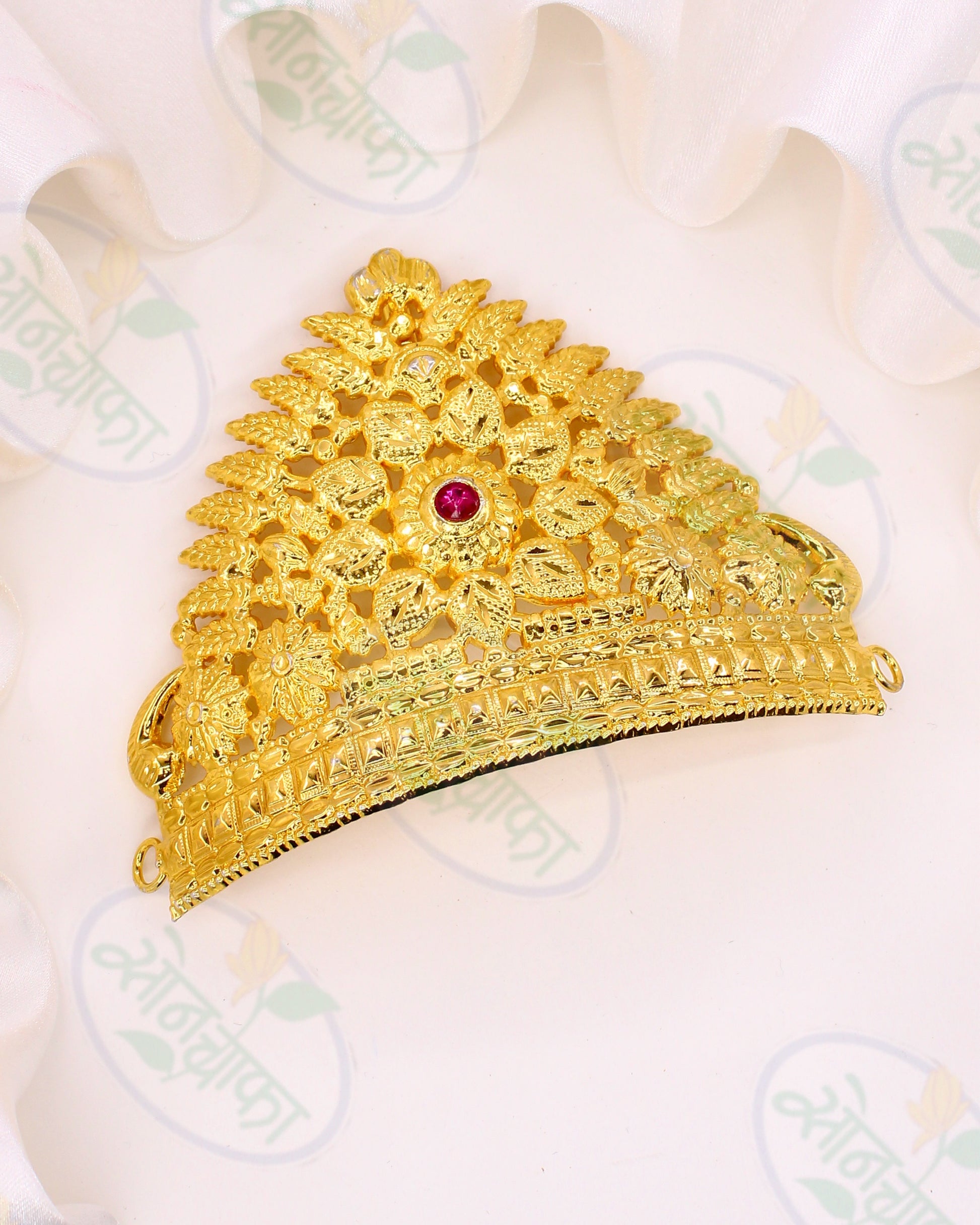 Specially designed for your Ganesha this floral Ganpati mukut from Sonchafa Jewellers. This piece of jewellery is very much adorable and made from golden finish metal. It is studded with glossy pink stone at middle for attractive look. It has has an adjustable back dori.