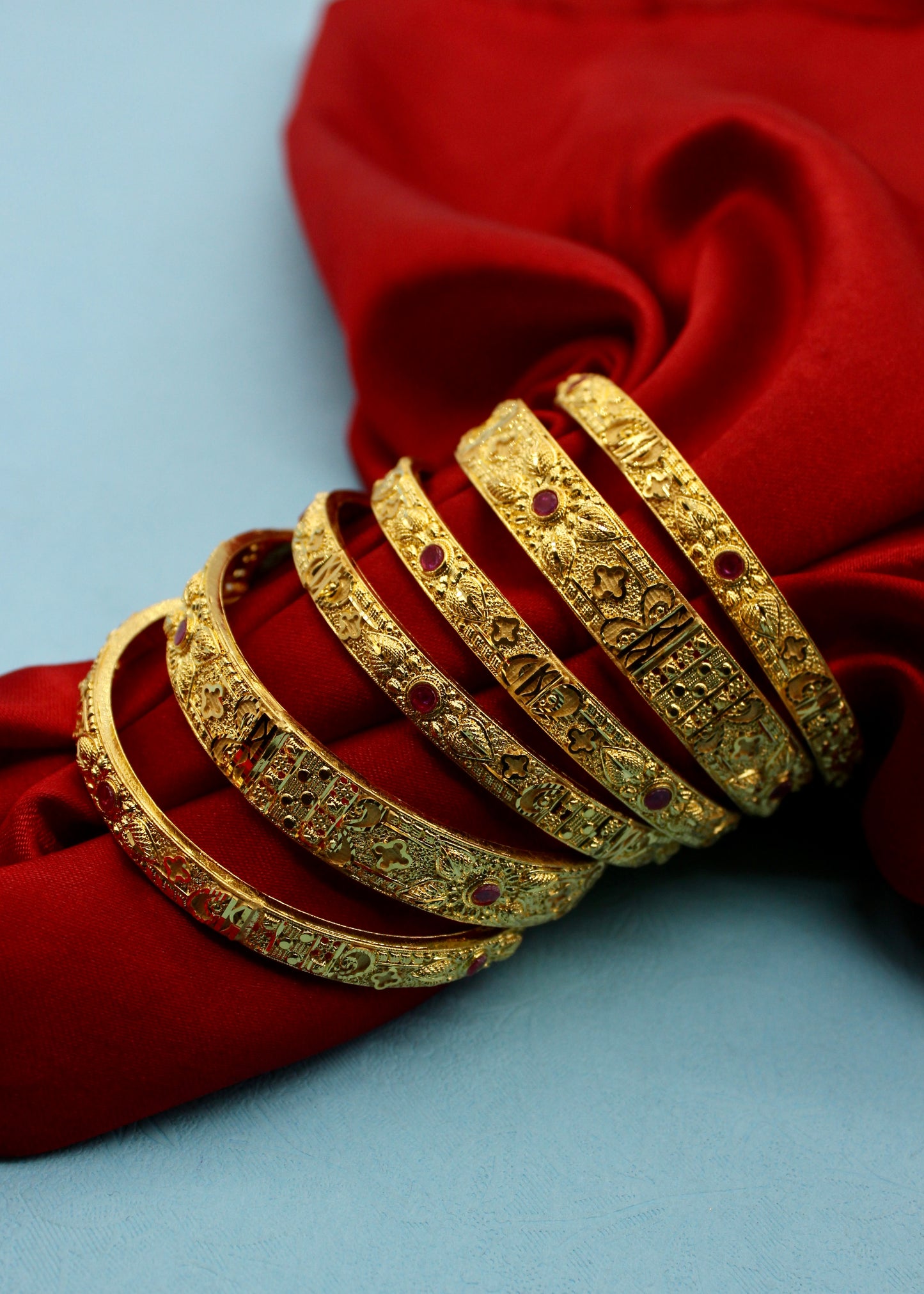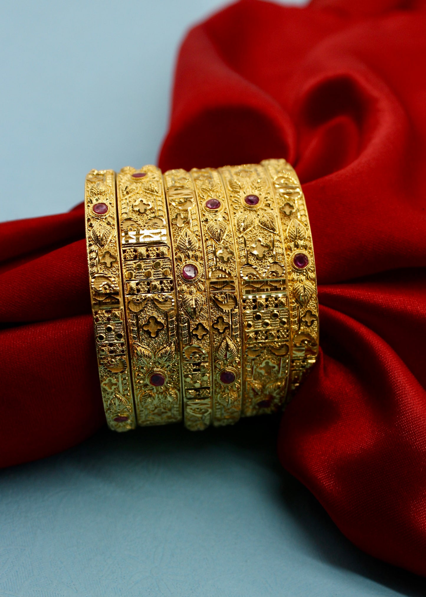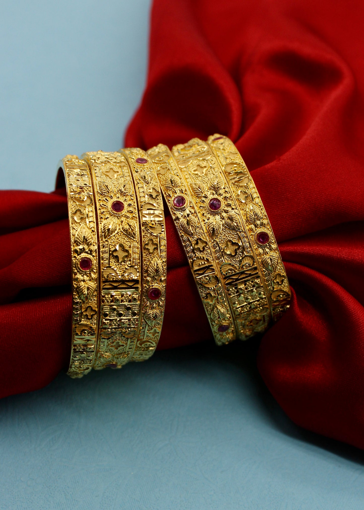 Beautiful leaf with floral designed this set of 6 gold plated bangles from Sonchafa Jewellery will blow your heart at very first look. They are embedded with pink colour stones and shows leafy floral design on metal surface. It is superior in quality and will retain its shine for years to come.