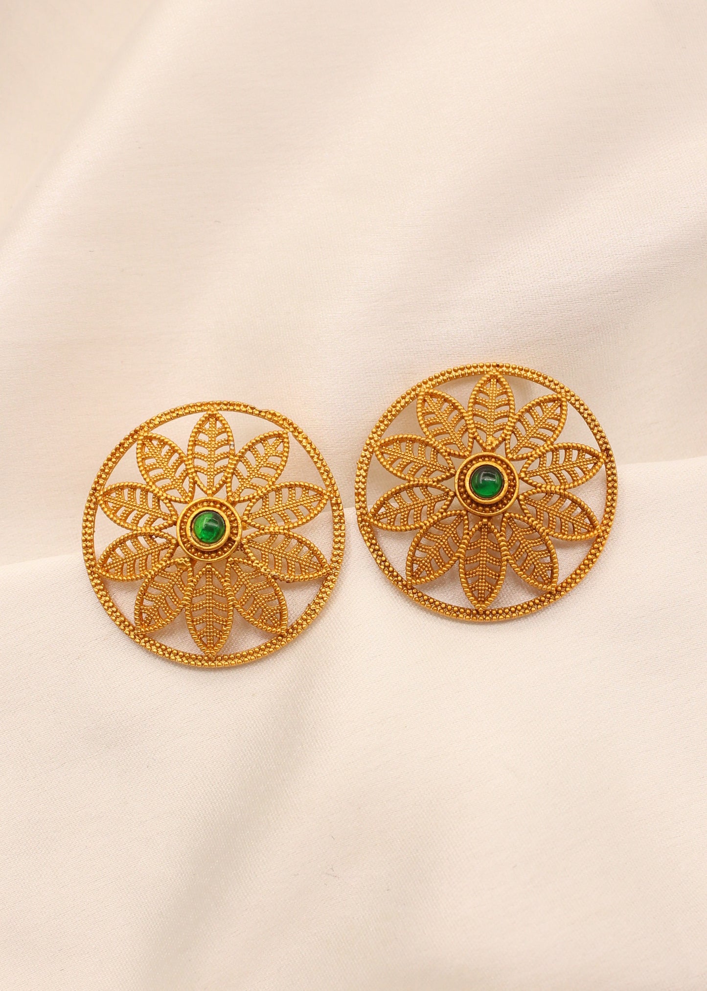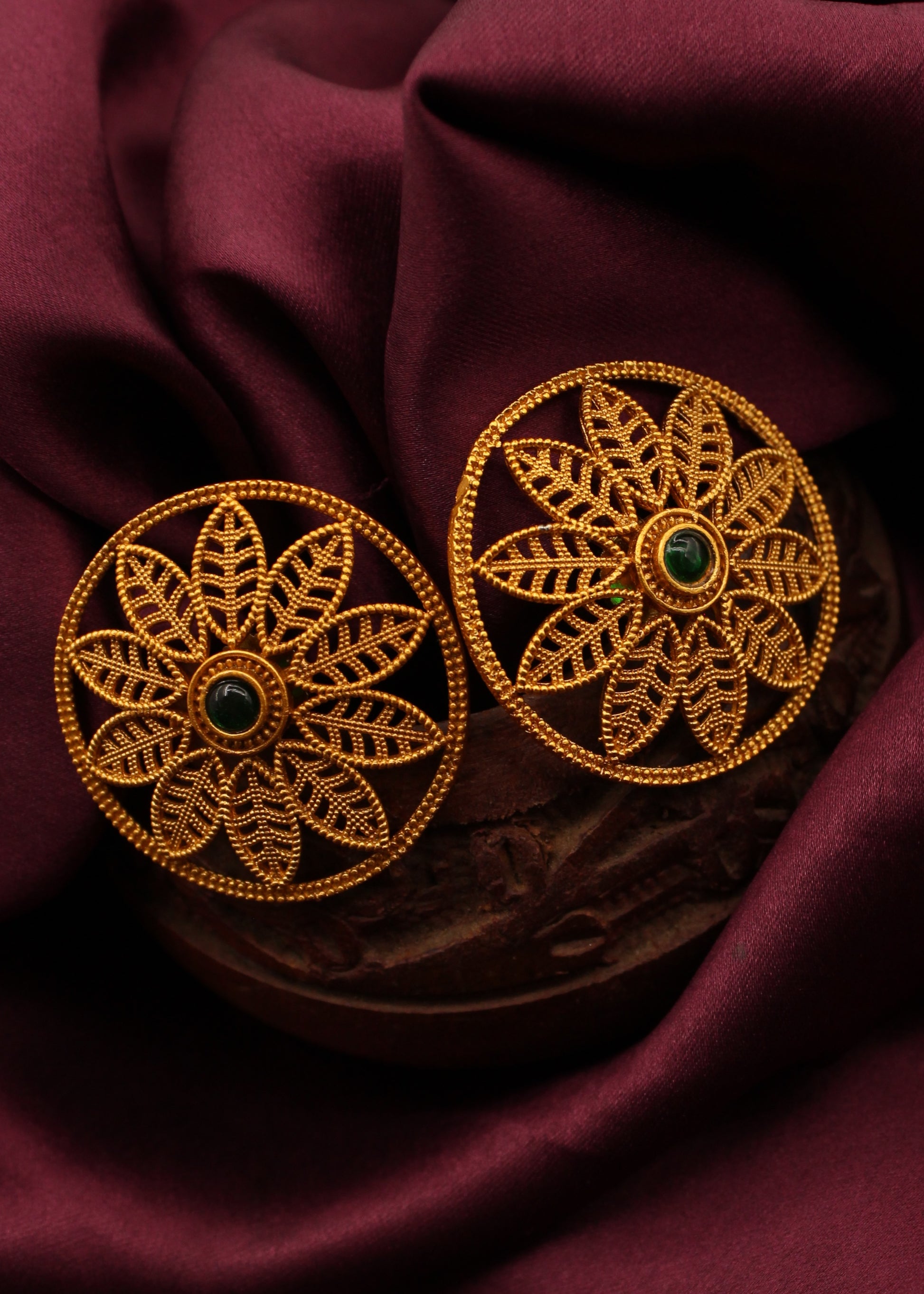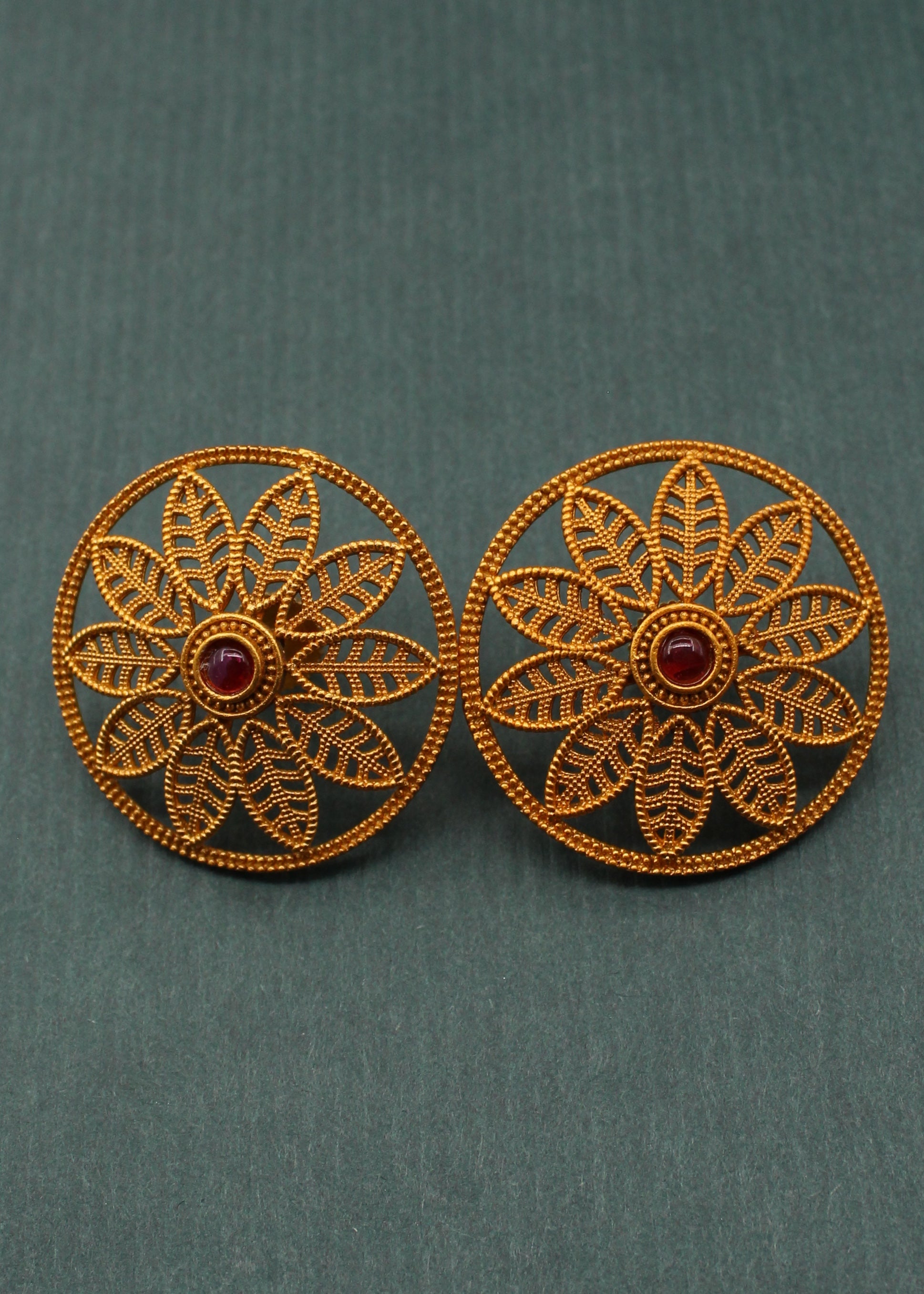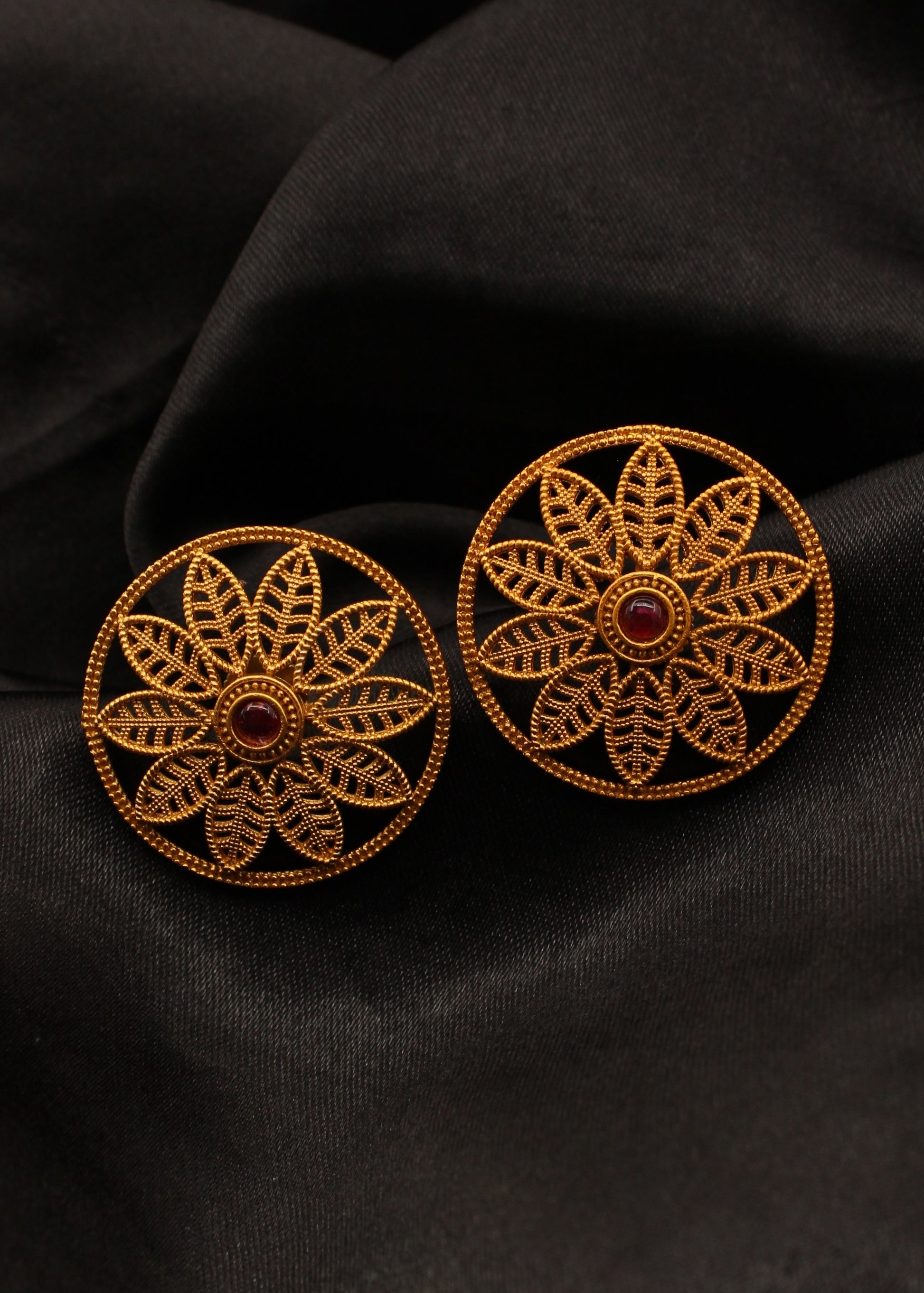 Beautifully designed this pair of matte gold finish floral design ear studs are perfect to team with casual attires. They are wonderfully crafted with golden finish metal along with wonderfully carving design. These studs are good in quality & will be your companion for many years.